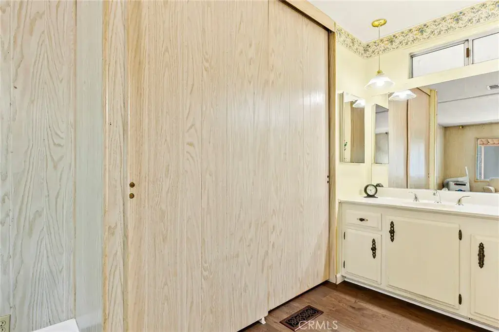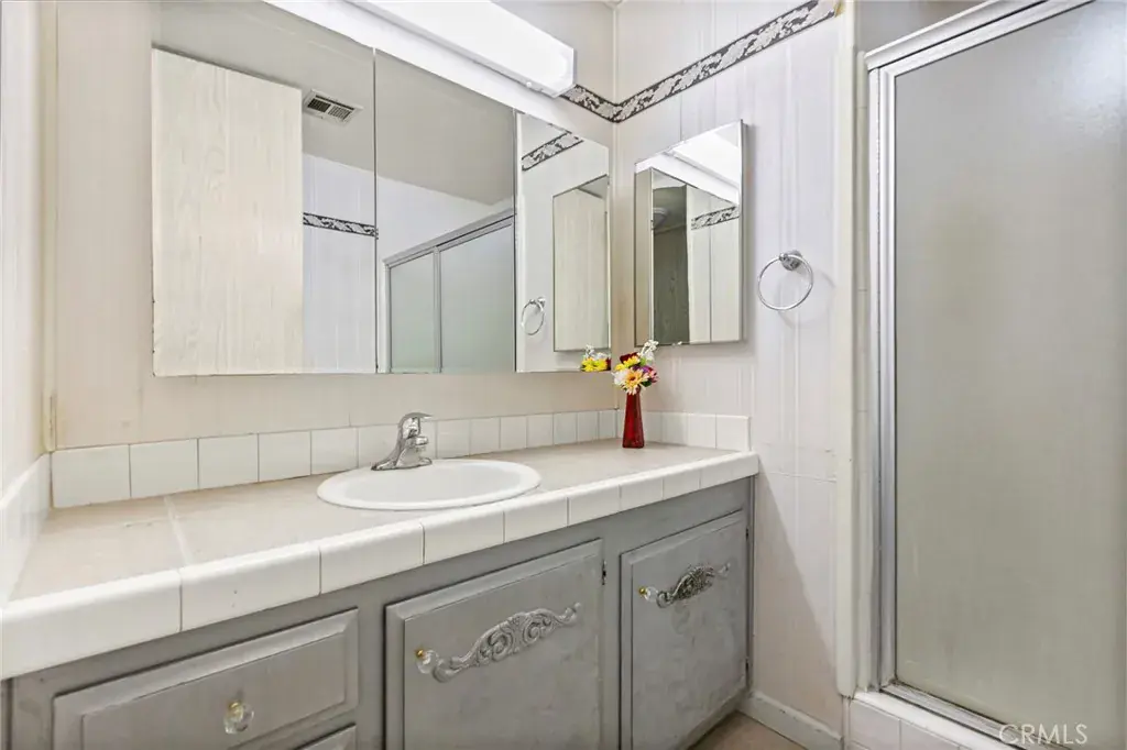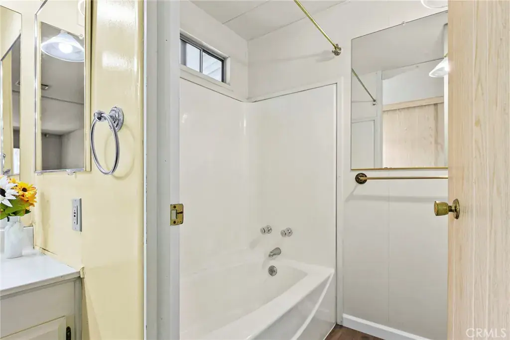 —Guest bedroom is near the hallway bathroom with a shower and ceramic tile flooring, while the primary bedroom offers two large closets, a private bath with tub and a separate vanity with plenty of space.