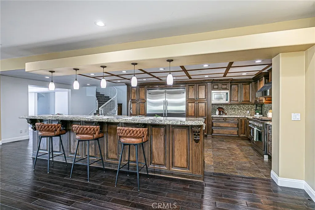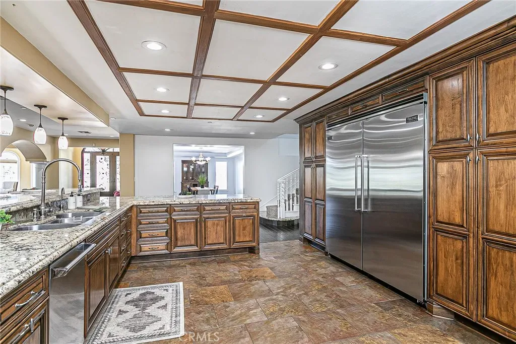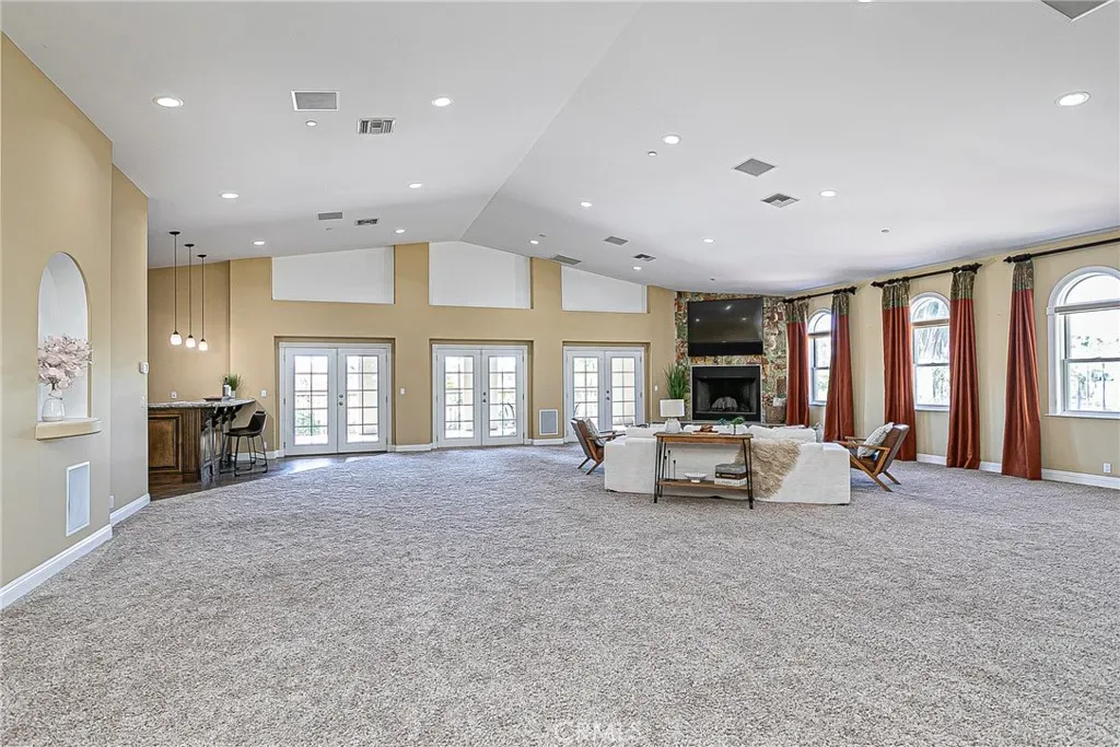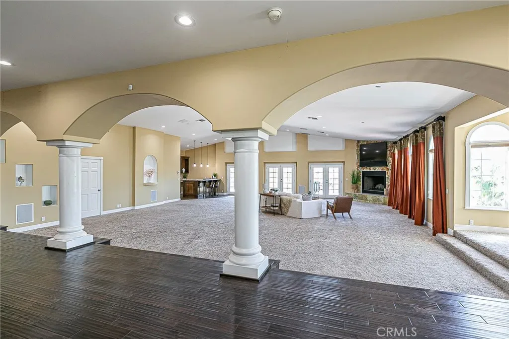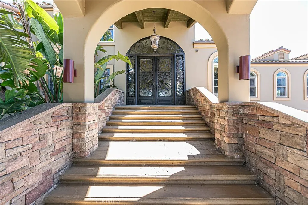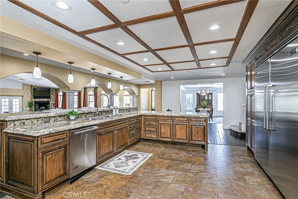 The impressive 8,100+ sq ft two-story residence features 6 bedrooms and 7 bathrooms, designed to capture natural light with travertine and hardwood flooring, granite countertops, and a striking stone fireplace. Multiple living and entertaining areas flow seamlessly to the outdoors.