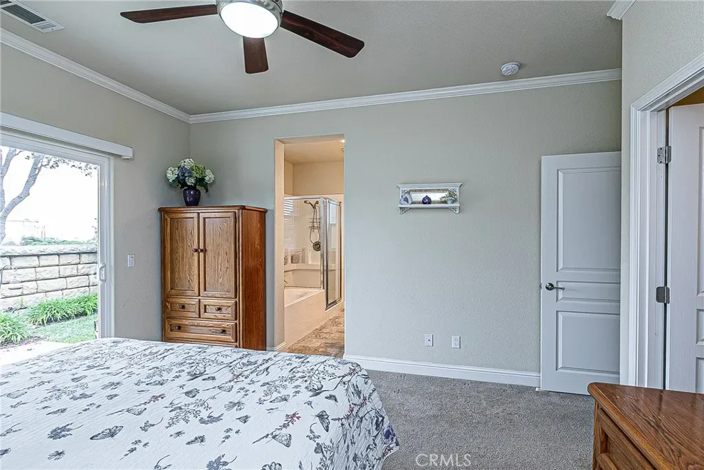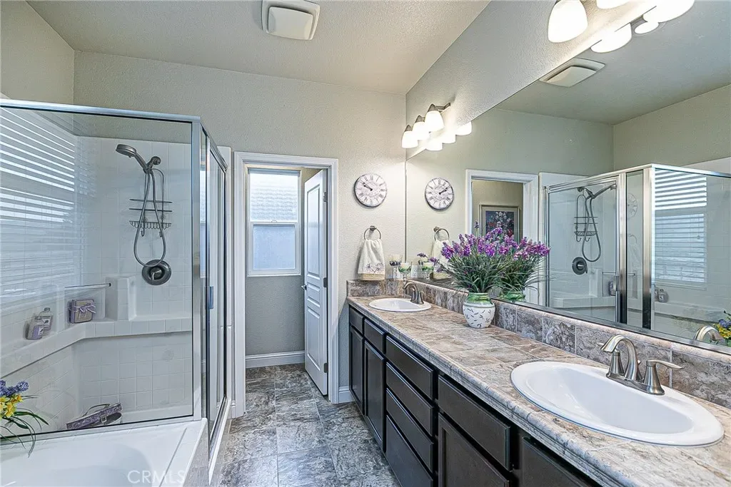 The primary suite features hillside views, an oversized walk-in closet, and a generous en-suite bath with soaking tub, separate shower, and private water closet.