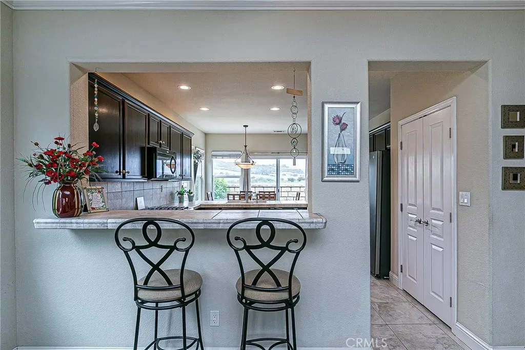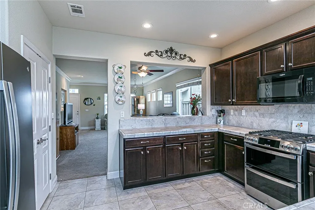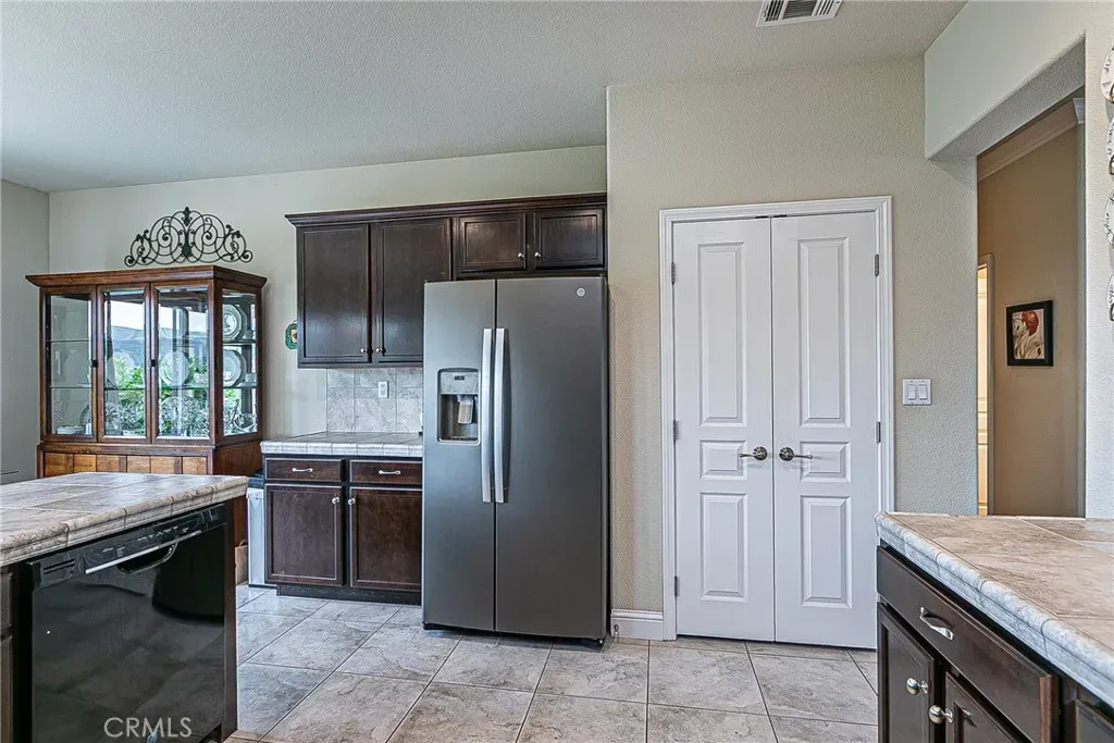 The kitchen overlooking the living room and backyard includes new dual ovens, newer refrigerator, newer dishwasher, and ample cabinetry and counter space.
