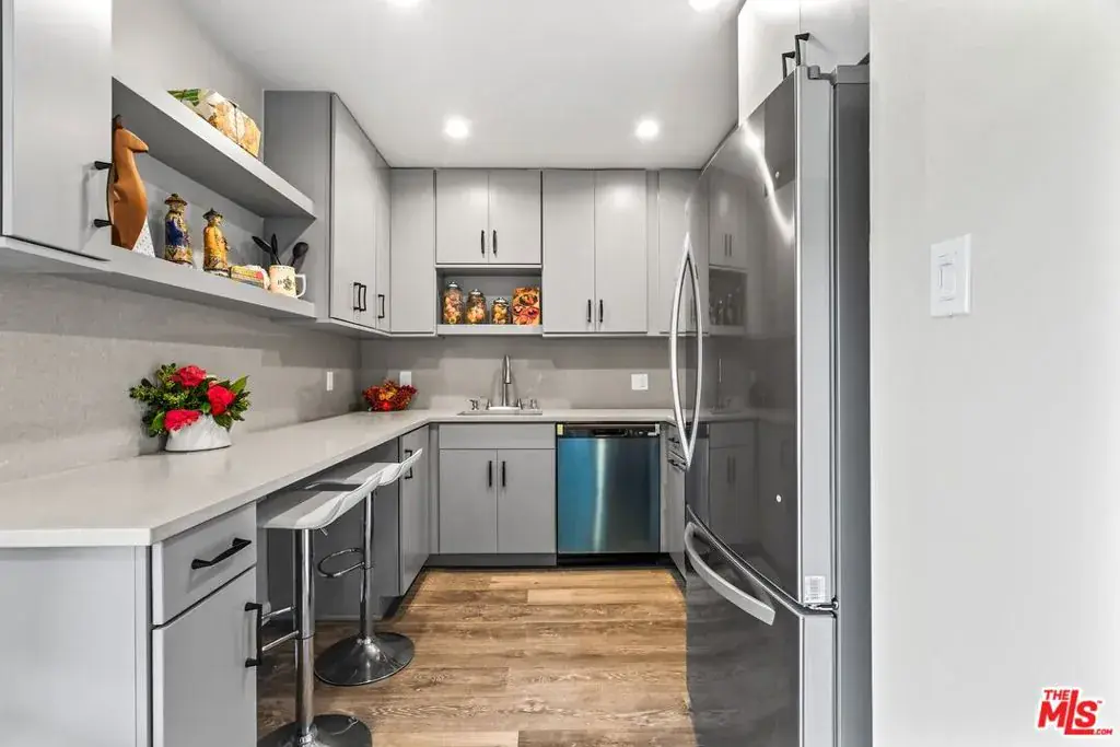 Contemporary Coastal Living in Santa Monica! Completely modernized 2 Bedrooms + 1 Bath with approximately 800 sqft with an airy layout that defies its dimensions overlooking lush greenery vistas. This fully transformed unit with wood vinyl flooring and recessed lighting throughout has a streamlined kitchen with a cohesive stainless steel appliance package with elegant countertops and integrated breakfast seating. Split bedroom configuration ideal for privacy and quiet and these bedrooms are both framed by established lush foliage. Fully renovated bathroom with contemporary aesthetics and clean lines. There is a dedicated covered one carport parking and storage and Low Homeowners dues that include water. Located in the sought-after Santa Monica School District. This vintage 1956 beautiful courtyard complex has a pool. The Princeton South Condominiums is a 19-unit building complex with controlled access. Close proximity to Douglas Park, Trader Joe’s, Erewhon, Bristol Farms, restaurants, bars and services