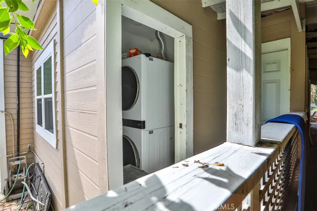 The property includes four detached garages and a shared on-site laundry area. The site layout incorporates a rear patio area adjacent to the garage structure. Buyer to verify potential uses and development standards.