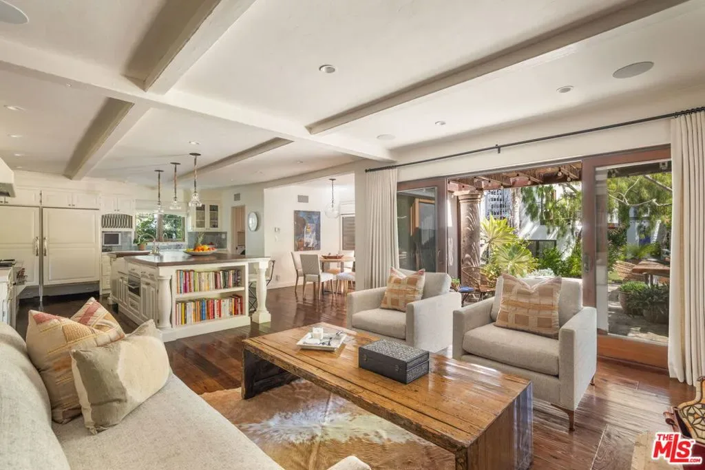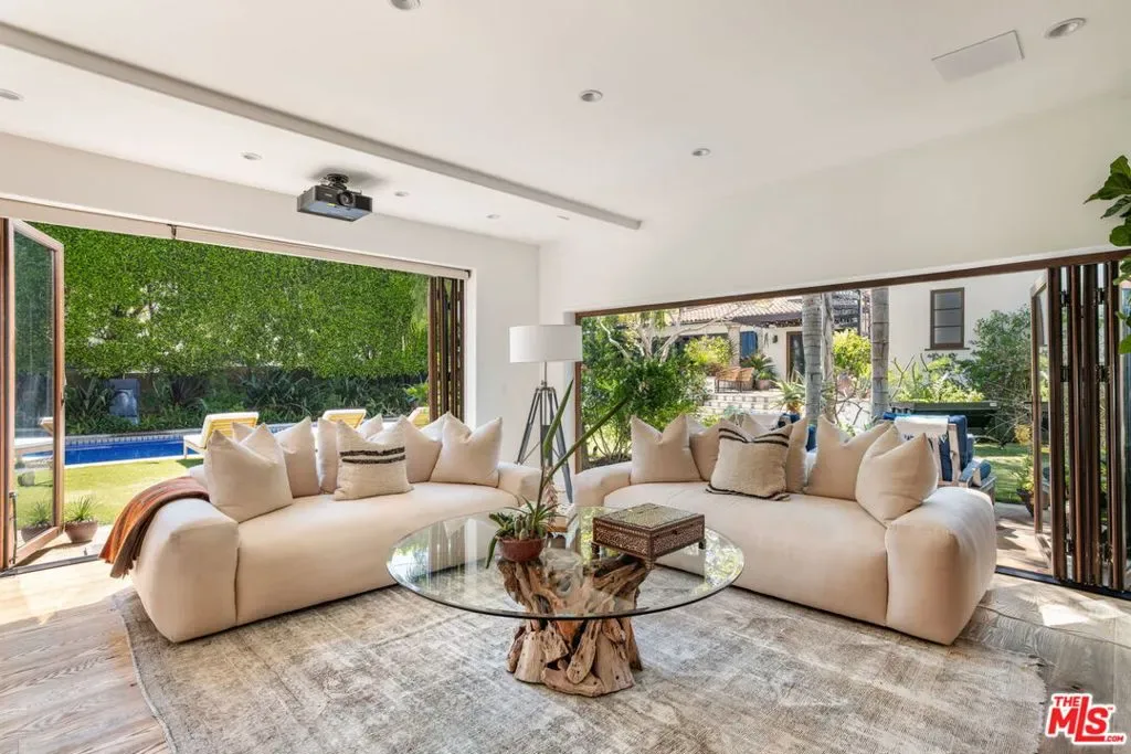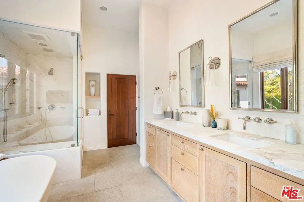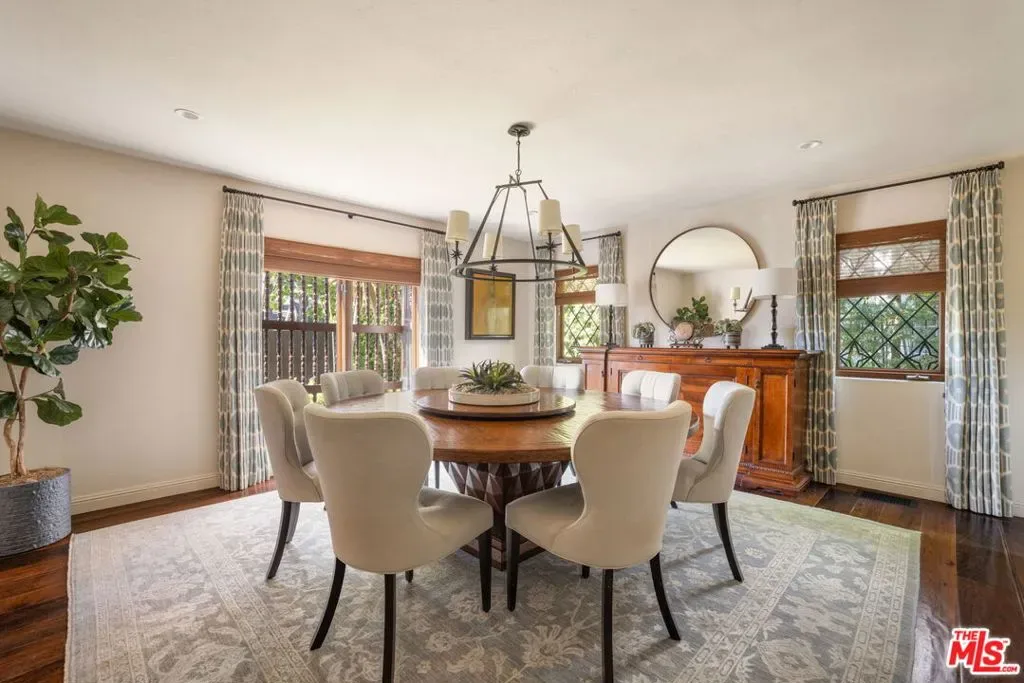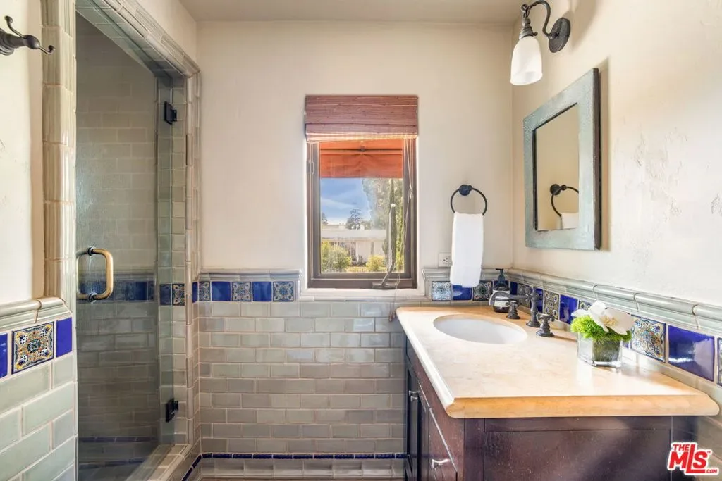 Nestled behind private gates on an Expansive 16,000+ sq ft lot, this exceptional Spanish Mediterranean residence masterfully blends timeless architecture with modern comforts in Santa Monica/Brentwood location. An arched entryway adorned with decorative tile work, leads to a stunning step-down living room with dramatic beamed ceilings, a fireplace, & French doors leading to a covered patio – perfect for gatherings that flow effortlessly outdoors. The formal dining room, with butler’s pantry, adjoins a beautifully appointed kitchen & breakfast room that overlooks a warm family room with fireplace & library nook & has direct access to the lush backyard. A private ensuite bedroom, along with an elegant powder room, completes the main level. Upstairs, three additional ensuite bedrooms offer comfort & privacy. The magnificent primary suite is a true retreat featuring its own covered terrace with serene garden views, fireplace & graceful circular staircase leading directly to the pool & yard below. The suite also includes a generous walk-in closet, a spa-like bath with dual vanities, soaking tub, separate steam shower & skylights. The backyard is nothing short of spectacular resort-style living at its finest. Centered around a sparkling pool & spa, the grounds offer multiple lounge areas, half-court basketball court & beautifully designed outdoor spaces for relaxation & entertainment. Adding incredible versatility is a refined detached guest retreat complete with living area, office, bedroom suite, & exterior pool shower perfect for family & guests. Further enhancing the property, it features a sophisticated pavilion with a decorative tower housing a fully appointed open-air commercial-grade kitchen, complete with top-tier appliances, pizza oven, & bar seating. This full outdoor entertaining pavilion contains a large dining area for al fresco entertainment & seating area with fireplace. This meticulously landscaped sanctuary with world-class amenities creates a true private paradise. The ideal blend of elegance and convenience by being moments away from the Brentwood Country Mart, charming Montana Avenue shops, Palisades Park, iconic Santa Monica Stairs, 3rd Street Promenade, and the beach that defines this sought-after coastal enclave.