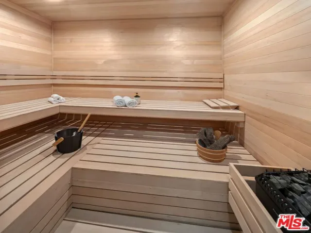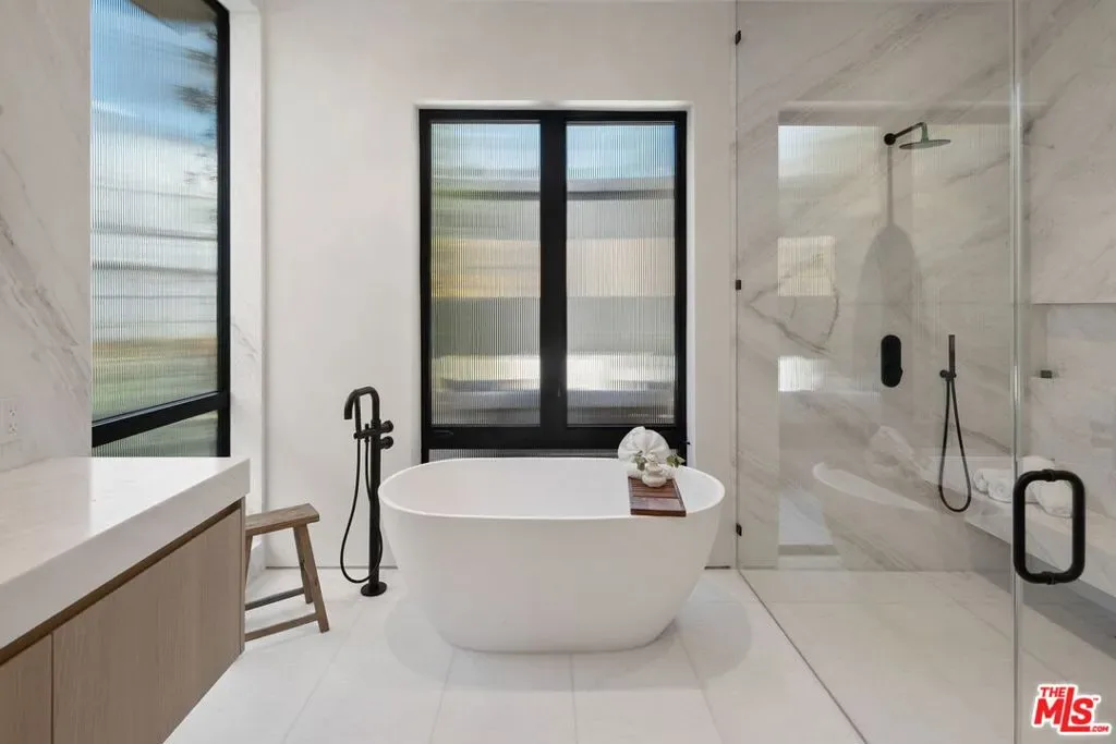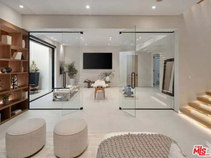 Set behind a canopy of mature olive trees that lend both shade and privacy, this newly built architectural residence spans approximately 7,700 square feet across two levels and a full basement. The main level unfolds with dramatic scale, offering expansive living, dining, and family rooms anchored by a sleek fireplace and framed by soaring floor-to-ceiling windows that flood the interiors with natural light. A flexible office or guest suite with an adjoining three-quarter bath enhances the layout. The gourmet kitchen is a statement in design, appointed with bespoke DOCA cabinetry, quartz countertops, a professional 6-burner cooktop with hood, Miele double ovens, wine refrigerator, beverage center, microwave, and a generous sized pantry. Upstairs, three spacious en-suite bedrooms include a tranquil primary suite featuring a fireplace, private balcony, custom oversized closet, dual sinks, freestanding soaking tub, and a luxurious rain shower. A serene hallway patio and a second laundry room add both style and convenience. The lower level is dedicated to leisure and wellness, boasting a state-of-the-art theater, fitness studio, wet bar, sauna, steam shower, bedroom with en-suite bath, custom built-ins, and a refined fireplace. Outdoors, the resort-style backyard is designed for entertaining with a sparkling pool and spa, barbecue island, mini-fridge, and a two-car garage. A private junior ADU suite offers further versatility with a kitchenette, stacked washer/dryer, three-quarter bath, balcony, and dramatic floor-to-ceiling windows. Additional highlights include wide-plank hardwood and stone flooring throughout, elevator access to all levels, and a fully integrated Crestron smart home system. Located on one of Santa Monica s most desirable streets, just moments from Palisades Park, the beach, fine dining, and luxury shopping.