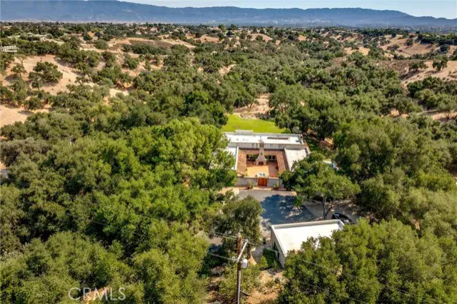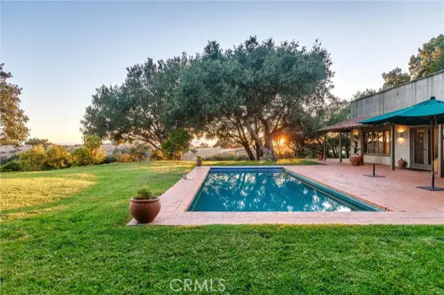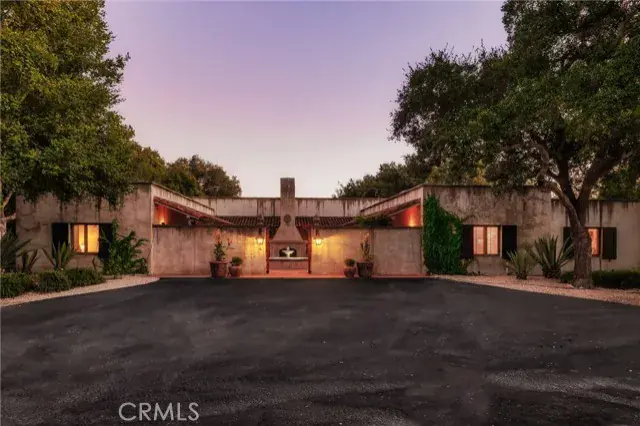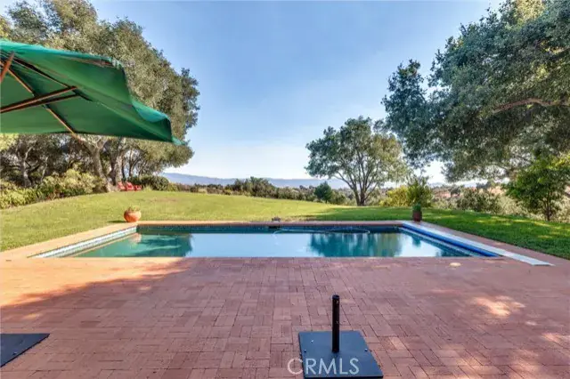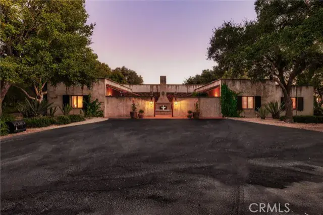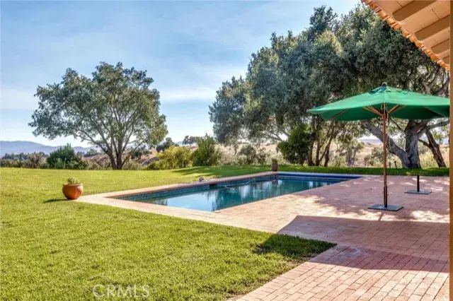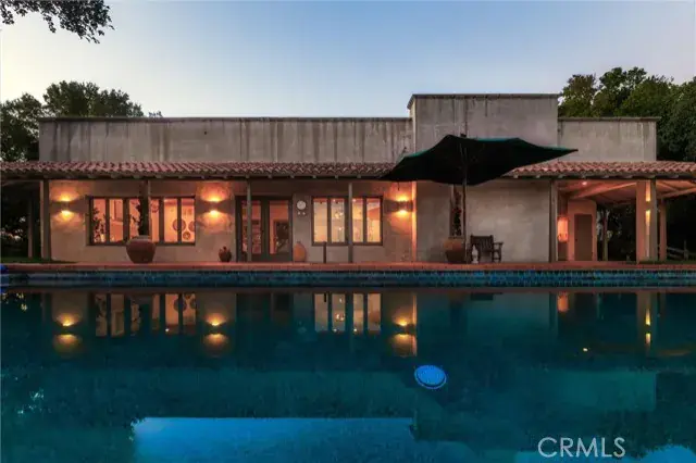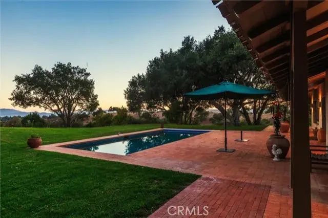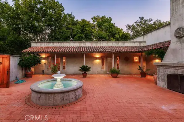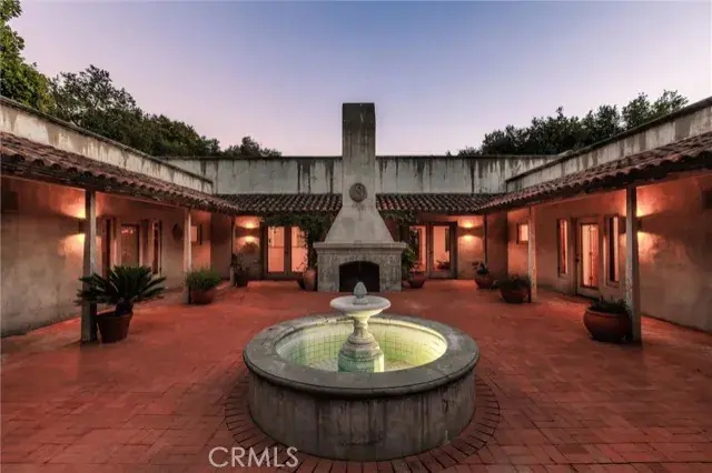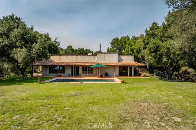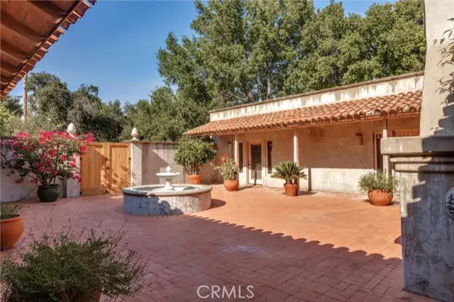 et on 20± oak-studded acres in gated Oak Trail Estates, Fallen Oak Ranch blends timeless hacienda-inspired design with modern updates and equestrian amenities. The custom residence centers on a courtyard with fountain and fireplace, opening to a great room floorplan with grand fireplace, open kitchen, and doors to the veranda, pool, and sweeping views. Three private bedroom suites include a full primary wing with den, dual closets, and patio. Outdoor living shines with pool, kitchen, gardens, roses, and citrus. A cedar barn with stalls, workshop, loft, and refrigerated storage plus fenced pastures and orchard complete this serene retreat.