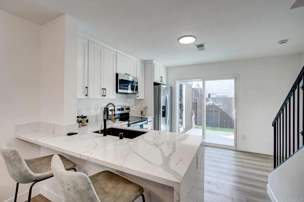 Welcome to this Charming 2-bedroom, 1-bathroom Condo in Santee! The open-concept living room is perfect for relaxing or entertaining. Updated Kitchen: Equipped with shaker style cabinets, quartz countertops and modern stainless steel appliances. Bedrooms and bath are upstairs, downstairs is a spacious living room, dining area, and the updated kitchen. Bonus: the new central air conditioner was installed just last year! The kitchen opens up onto a private, fenced patio, with a storage closet. There is a single space within a multiple-car garage, with storage, and an assigned open parking space in front of the garage. Additional open parking is just in front of the unit, and throughout the complex. For leisure and recreation, the complex features include a large open lawn adjacent to the pool area! The common laundry room is close to the unit.