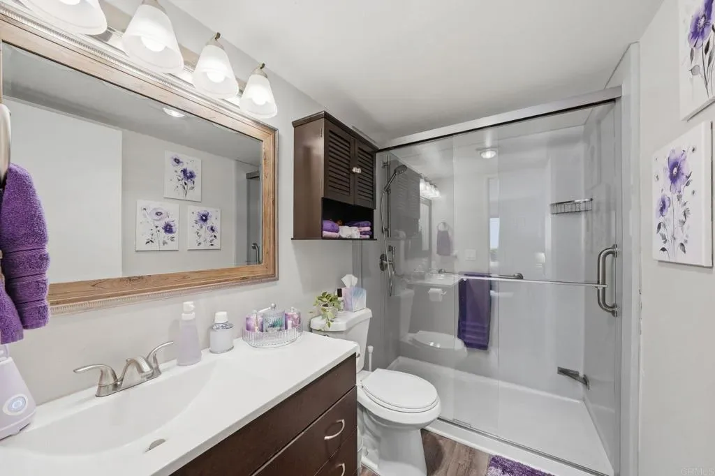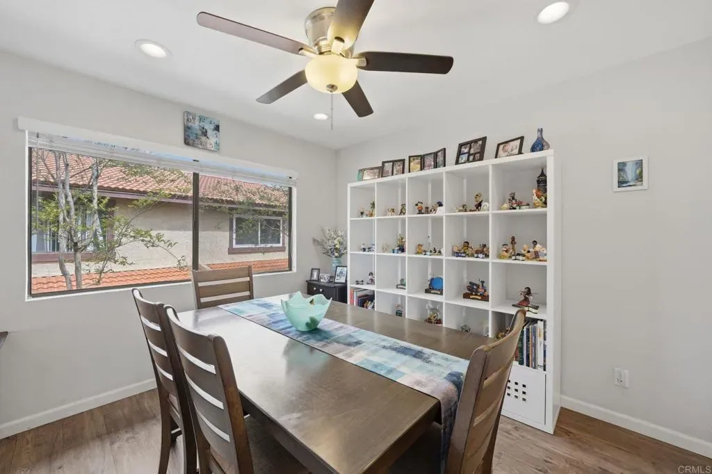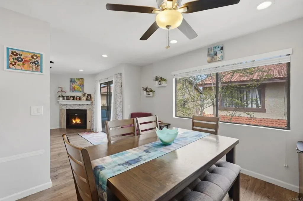 Welcome to a thoughtfully updated residence where comfort, functionality, and natural light come together with ease. From the moment you enter, the open layout creates a bright and inviting atmosphere that flows seamlessly throughout the main living spaces. The living room offers a warm and comfortable setting, anchored by a fireplace and enhanced by expansive windows and sliding glass doors that lead to a private outdoor patio. This indoor outdoor connection allows for effortless daily living and a peaceful place to unwind. The kitchen has been beautifully refreshed with crisp white cabinetry, modern hardware, and stainless steel appliances. Clean lines, ample counter space, and abundant storage make this space both practical and visually appealing. It opens directly to the dining area, creating a natural hub for gathering and connection. The primary suite offers a serene retreat with generous closet space and direct access to the outdoors. The secondary bedroom provides flexibility for a home office, creative space, or guests. A private balcony and patio areas offer quiet outdoor settings with surrounding greenery and hillside views, creating a sense of privacy and calm. The attached garage and additional storage provide convenience and functionality. An updated HVAC system will keep you cool, while energy efficiency is enhanced with solar, reducing utility costs. Buyer to assume solar. Located within a well maintained community, this residence offers easy access to nearby shopping, dining, and major commuter routes while maintaining a peaceful residential feel. Less than 30 minutes to downtown San Diego or the beach! This is a home that delivers thoughtful updates, comfortable living, and a layout designed for modern living.