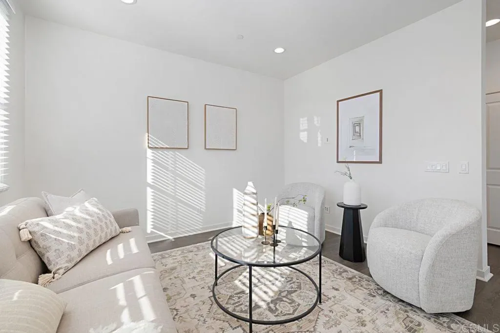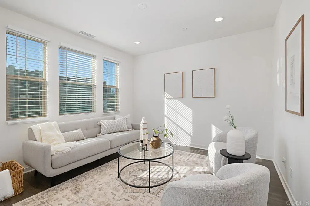 Elevated, refined, and designed for modern living, this exceptional three-level residence offers approximately 1,500 square feet of thoughtfully curated living space in one of Riverview’s most desirable end-unit locations. Showcasing a rare blend of privacy and panoramic beauty, the home captures sweeping, unobstructed views of the city and surrounding mountains from virtually every window. Built just three years ago, the property reflects a contemporary aesthetic paired with quality craftsmanship and energy-efficient systems, delivering both style and peace of mind. The versatile floor plan features three spacious bedrooms, two full bathrooms, and two powder rooms, perfectly balancing functionality with comfort. The main living level is warm and inviting, highlighted by wide-plank grey laminate flooring and an open-concept design ideal for both everyday living and entertaining. The kitchen is beautifully appointed with sleek quartz countertops, a center island, crisp white cabinetry, and a full suite of stainless steel appliances. An adjacent dining area seamlessly extends to the outdoor patio—perfect for entertaining and hosting sunset gatherings against a stunning mountain backdrop. A stylish powder room and convenient laundry closet with a stackable washer and dryer complete this level. Privately situated on the top floor, the primary suite offers a spacious tranquil retreat with abundant natural light, and tiled en-suite bath. Two additional bedrooms provide flexibility for guests, a home office, or growing households, and share a beautifully maintained full bathroom. The ground level welcomes you with a thoughtfully designed entry, featuring a functional mudroom space, an additional powder room, and direct access to the attached two-car garage with ample storage. Located within the highly sought-after Riverview community in Santee, residents enjoy resort-style amenities including a sparkling pool, scenic walking and hiking trails, and close proximity to parks and open space. The home is ideally positioned near shopping, dining, major freeways, and trolley access, offering a seamless connection to downtown San Diego and beyond. This is a rare opportunity to own a sophisticated, move-in-ready home in one of Santee’s premier communities—where elevated design meets everyday convenience.