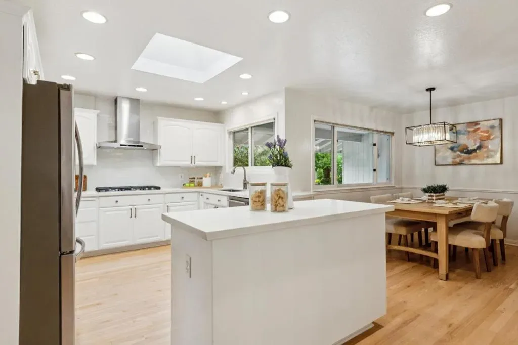 Welcome to 12304 Saratoga Creek Dr, a beautifully updated single story home located in Saratoga Woods. This 4 bed, 2.5 bath home features 2,631 sq ft of living space on a generous 10,922 sq ft lot. Bright and inviting, the home features Andersen windows, refinished hardwood floors throughout, fresh interior paint, new light fixtures, and dimmers for added ambiance. The newly remodeled kitchen showcases quartz countertops, center island, full tile backsplash, skylights, and stainless steel appliances including KitchenAid and LG. The vaulted family room with wet bar and custom wood-burning fireplace creates a warm gathering space, while a separate living room offers an additional fireplace and backyard access. The well designed layout places bedrooms on one side for privacy. The spacious primary suite features backyard access, walk in closet, and an updated bath with double sinks and a large shower. Enjoy seamless indoor outdoor living with a beautifully landscaped backyard and lemon tree. Conveniently located near Saratoga Woods Swim Club, Prospect High, parks, shopping, dining, and easy access to Lawrence Expressway. Dont miss out!