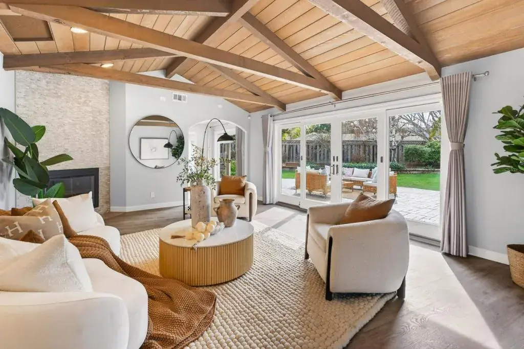 Nestled on a quiet cul-de-sac in highly sought-after Golden Triangle, this extensively remodeled single-story residence blends mid-century character with modern luxury: 3,325 square feet of living space with 5 bedrooms plus office, 4.5 bathrooms including 3 private suites, ideal for multigenerational living or work-from-home flexibility. The open-concept interior is filled with natural light and highlighted by vaulted ceilings with exposed wood beams and wide-plank flooring. The chefs kitchen showcases a waterfall island, quartz countertops, professional grade stainless steel appliances, skylight, and herringbone tile. The versatile floor plan includes a bright home office, a dedicated fitness room with backyard access, and decent sized bedrooms with designer finishes. The primary suite offers a spa-like bath with freestanding soaking tub, rainfall shower, and walk-in closets. Set on approximately one-third of an acre, this home features a manicured landscaping. The backyard is designed for California living with a sparkling pool, paver patio, lush lawn, vegetable plantation, and multiple entertaining areas. Additional features include central A/C, dual-pane windows, copper plumbing, Tesla charging, and proximity to award-winning schools, parks, trails, shopping, and dining.