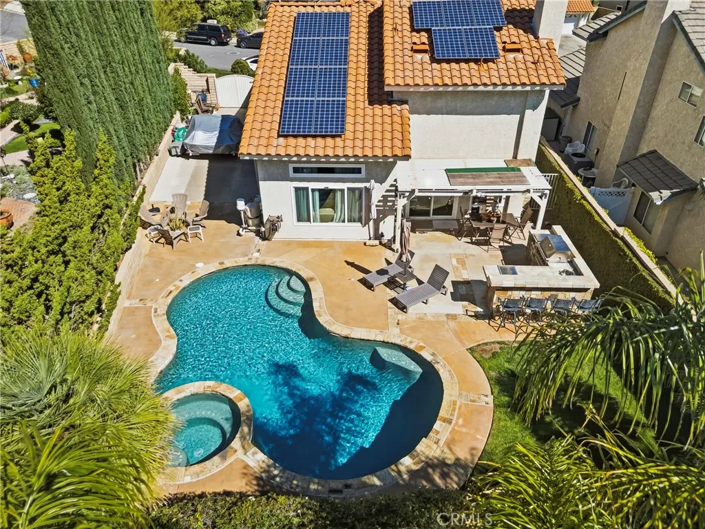 Incredibly Charming Saugus POOL HOME with HUGE GATED RV PARKING on a sweeping corner lot!!! This Beautifully maintained 4 bedroom, 2.5 bath home offers over 1,900 square feet of living space in one of the most desirable neighborhoods in Saugus! Set in the heart of Santa Clarita, on a great corner lot, this well-designed home features all 4 bedrooms upstairs, creating a functional floor plan with high ceilings and an open feel! The lovely, upgraded kitchen is an entertainer’s dream and truly the heart of the home that features updated granite countertops and white oak cabinetry and conveniently opens to the family room which looks out to the sparkling swimming pool! Luxury vinyl flooring throughout the downstairs. All bathrooms are upgraded and feature granite countertops for a consistent finish throughout the home. The primary bedroom is a luxurious retreat with an updated primary bathroom and spacious walk in closet! Step outside to enjoy California outdoor living in the breathtaking, resort-style backyard – which is ideal for entertaining with a sparkling Pebble Tec pool and spa, built-in BBQ, and outdoor kitchen! Additionally, there is a spacious RV parking area designed for easy access and maneuverability – complete with hookups and sewage connections. Located near lush parks, shopping, dining, and local schools, this home offers comfort, style, and convenience in one of Saugus’ sought-after neighborhoods with low HOA and No Mello Roos!!