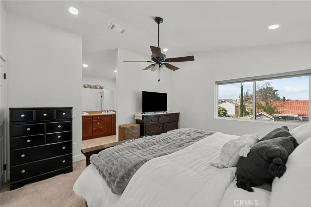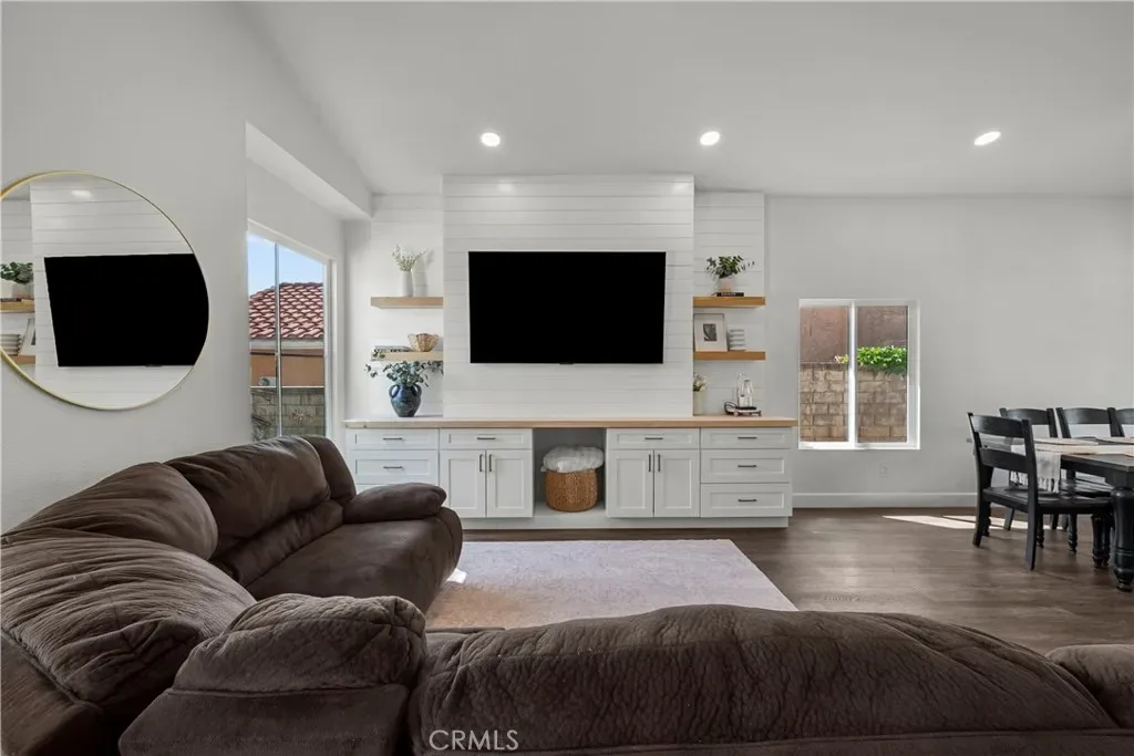 Welcome to this beautifully upgraded and move-in ready home in the highly sought after neighborhood of Circle J Ranch! As you enter you will be impressed by the high ceilings and light that this home offers. Some of the many upgrades include a newer tile roof, rain gutters, and all windows have been replaced providing both quality and peace of mind. The kitchen, downstairs bathroom and upstairs hall bathroom have all been upgraded! In the living room there is a custom media wall with cabinets and shelving. In the dining area there is a built in buffet with illuminated shelving and features a dual-zone refrigerator! Enjoy enhanced interior lighting with recessed lighting in the living room, dining room, and primary bedroom, creating a bright yet inviting ambiance. Step outside to a beautifully designed patio cover equipped with ceiling fans, lighting, speakers, and electrical outlets—ideal for entertaining or relaxing year-round. The widened driveway accommodates up to three vehicles and includes desirable RV parking. The very spacious backyard features two mature fruit trees—orange and lemon! This is a true pride-of-ownership home that blends quality, beauty, function! This home is situated on a cul-de-sac!