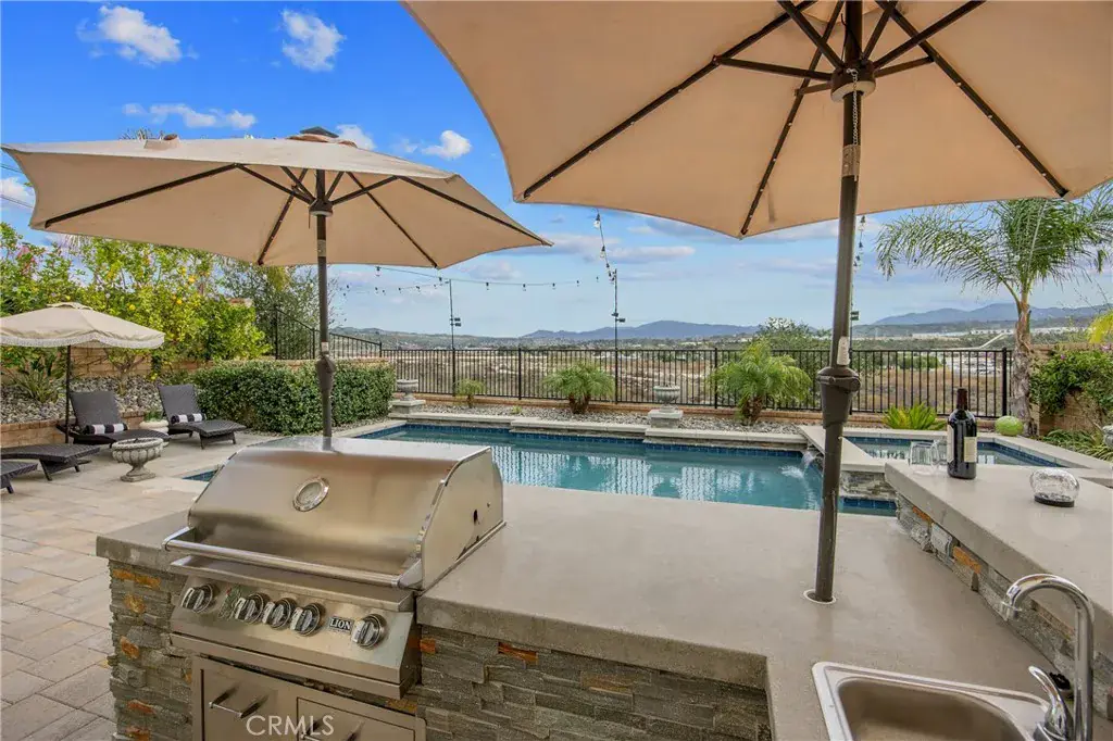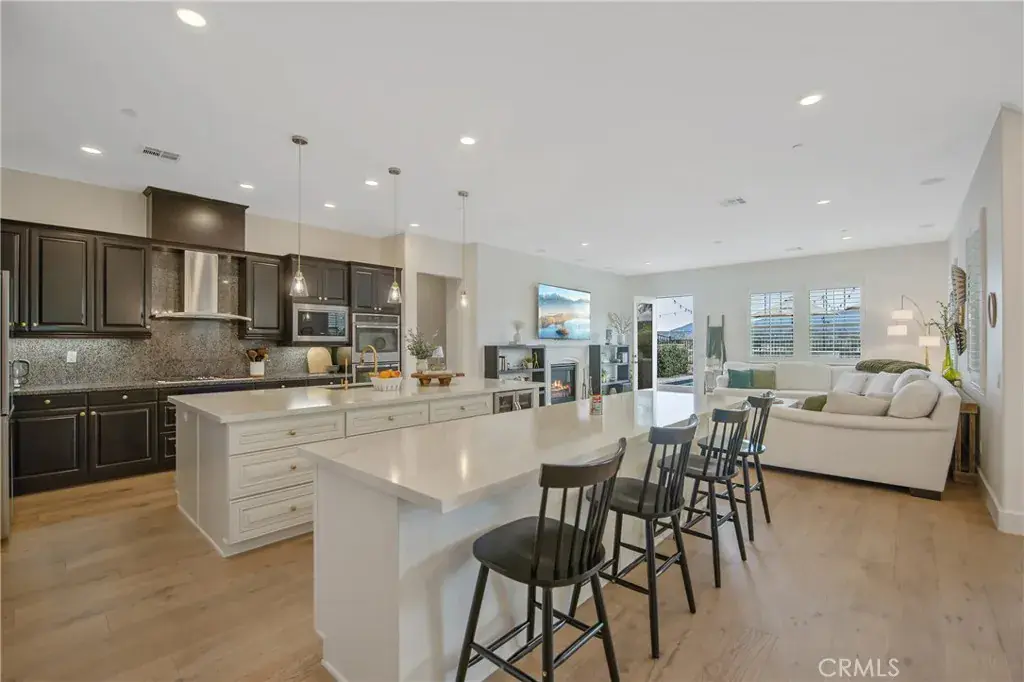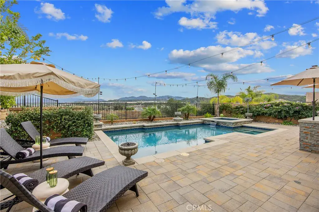 Welcome to this Stunning River Village Pool Home, beautifully Elevated to capture Serene Riverbed Views and Sparkling City Lights. Thoughtfully Upgraded throughout, the Home features Elegant Quartz & Granite Countertops, Crown Moldings, Custom shutters, Recessed lighting, Upgraded carpeting, and Engineered Wood flooring, all Complimenting a Light, Bright Open floor plan designed for both Everyday Living and Entertaining. The Main level offers a True Gourmet kitchen with a Walk-in Pantry, Double Islands, Beverage Center, Stainless Steel appliances, and Abundant storage opening to a Spacious Great Room-Family Room with a Cozy Fireplace and Breathtaking Views of the Riverbed. A Formal Living Room adds Refined Entertaining space, while a dedicated Office and Private bedroom with an En-suite Bathroom provide Flexibility for Multigenerational Living. Upstairs the expansive Primary Retreat is a private Sanctuary, complete with a Beverage Center, Coffee Bar, Office area, Luxurious Bedroom and Spa Inspired Bathroom. Additional Highlights Include a Large Laundry Room with Plentiful Storage Capabilities, Spacious Loft, a Bedroom with En-suite Bathroom, Two Generously Sized Guest Bedrooms and a Full Bathroom which includes Dual Vanities, Quartz Counters and a Dual Shower Head. All Bedrooms are Oversized offering Comfort and Versatility throughout. Step Outside to your Resort-Style Outdoor Retreat, featuring a Built-in Barbeque, Pool and Spa with Waterfall, Dramatic Fire Bowls, a Fire table and a Covered Patio with Fireplace and TV – Perfect for year round Enjoyment. Beautiful Pavers enhance the backyard, where you can Relax in total privacy with no neighbors behind. Ideally Located at River Village in the Heart of Santa Clarita, this Exceptional Home is just moments from Premier Shopping, Dining and Entertainment- Offering Luxury Living in an Unbeatable Setting. Completing this Exceptional Home are a Generous 3 Car Garage, an Oversized Full Length Storage Closet beneath the Staircase, and Energy Efficient Tankless Water Heaters, and the Backyard Retreat has a Lemon, Lime and Blood Orange Tree.