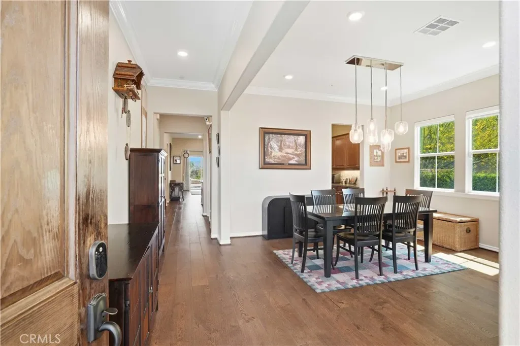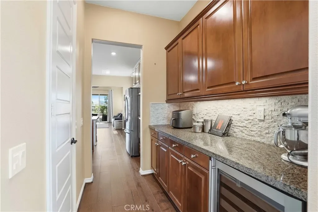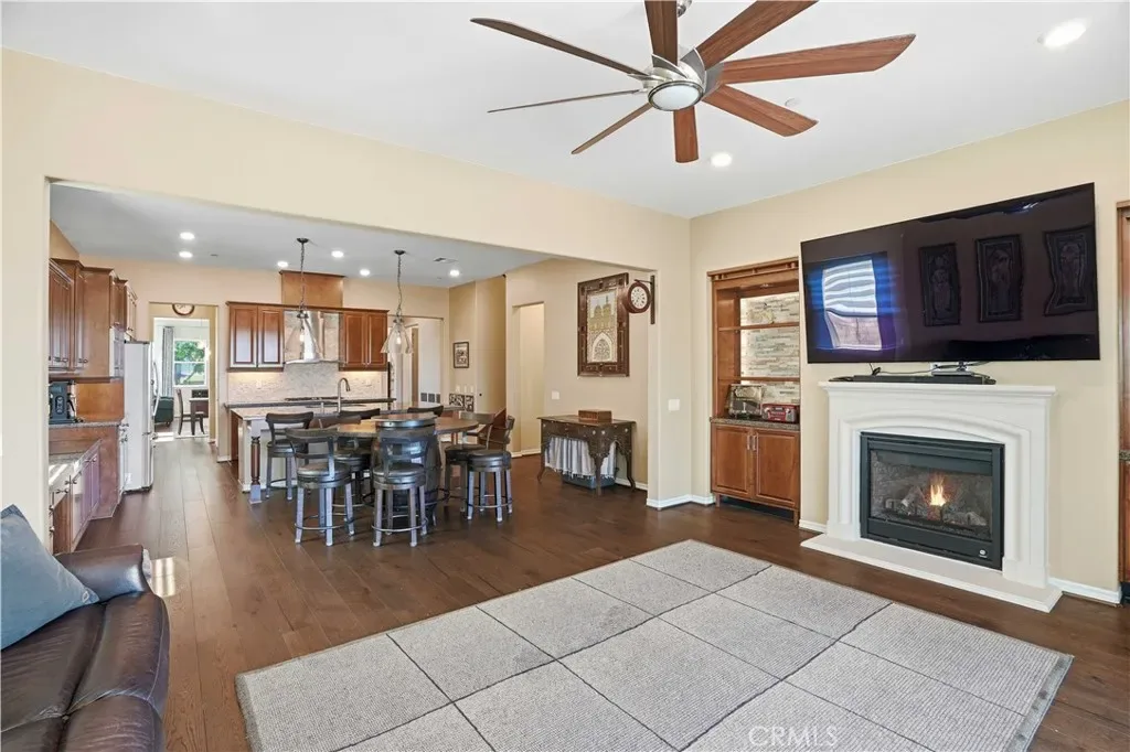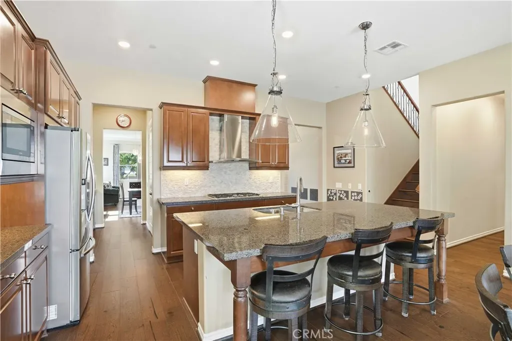 Inside, the open-concept floor plan is enhanced by wood flooring, custom built-ins with accent lighting, crown molding, beautiful chandelier & pendents, office niche, cozy fireplace. The expansive kitchen is a showstopper with granite countertops, stainless steel appliances, custom backsplash, pendant lighting, and a large island with ample seating plus a beautiful butler’s pantry with beverage refrigerator, walk-in pantry, and abundant cabinetry.