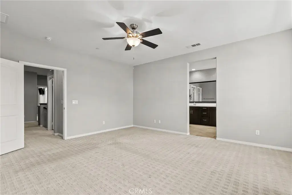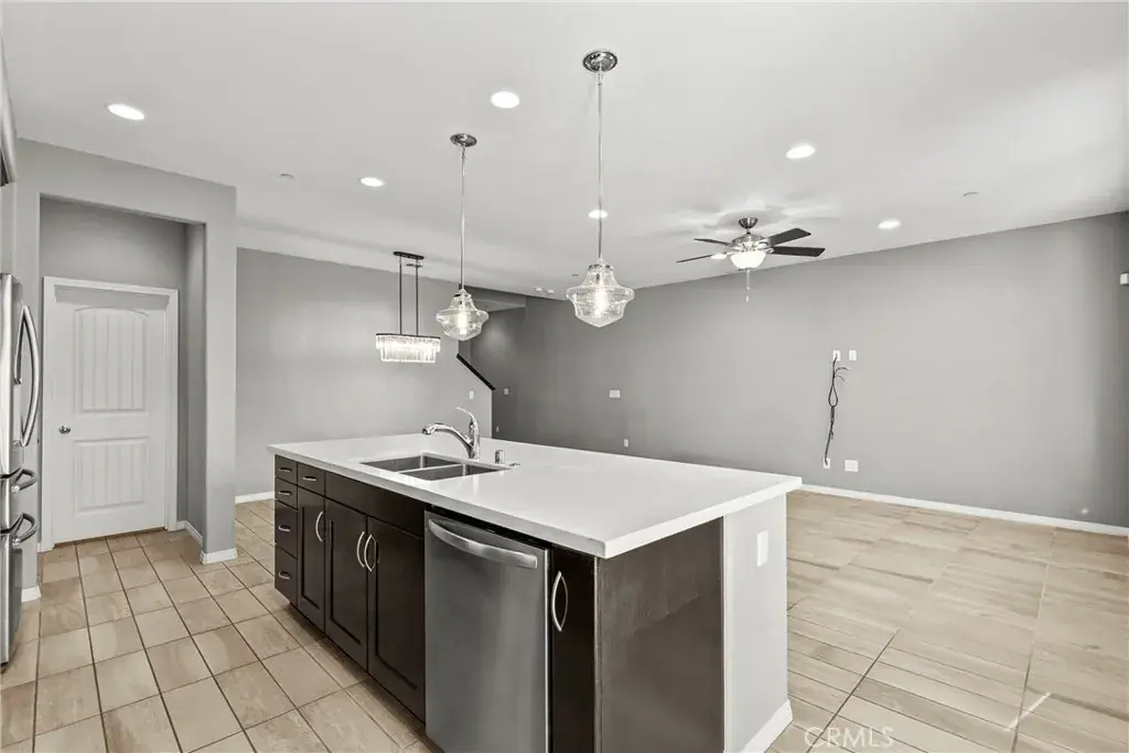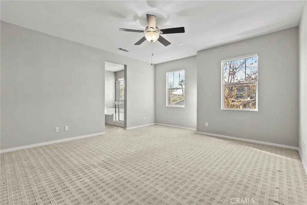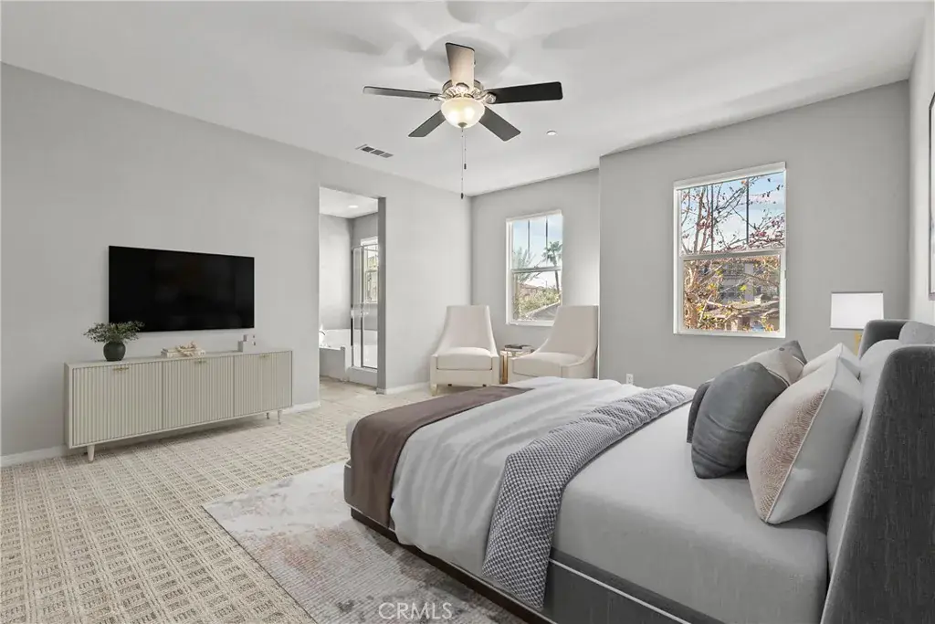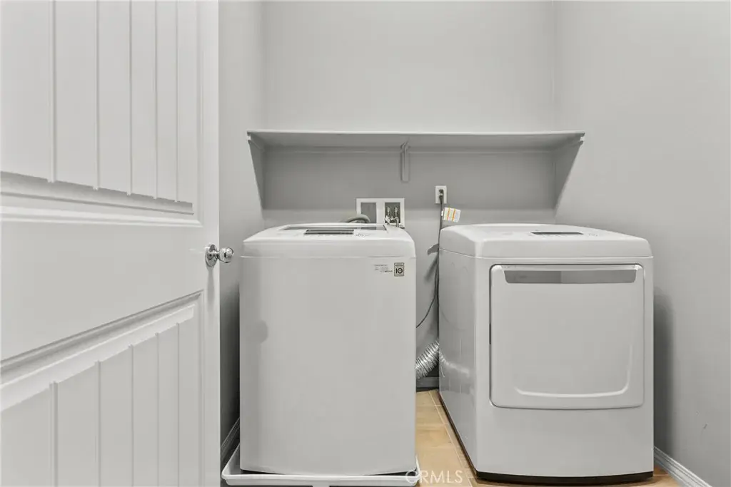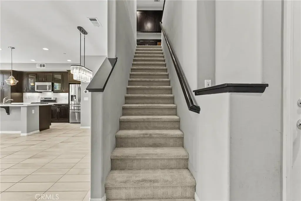 Upstairs, all three bedrooms provide comfort and privacy, including a spacious primary suite with an ensuite bath and a large walk-in closet. Two additional bedrooms share a dual-sink bathroom, while a built-in desk/workstation with upgraded cabinetry adds functionality to the stair landing. Thoughtful upgrades include ceiling fans, window coverings, a wall safe, an upstairs laundry room with a washer and dryer, a tankless water heater, and a spacious 2-car garage. A full suite of kitchen appliances—including the refrigerator—is included, making this home truly move-in ready.