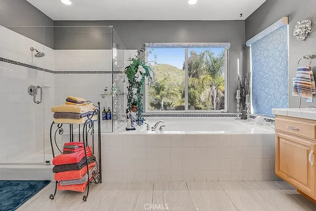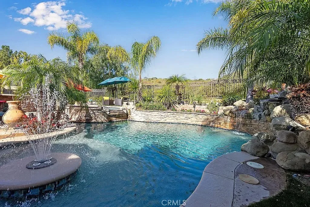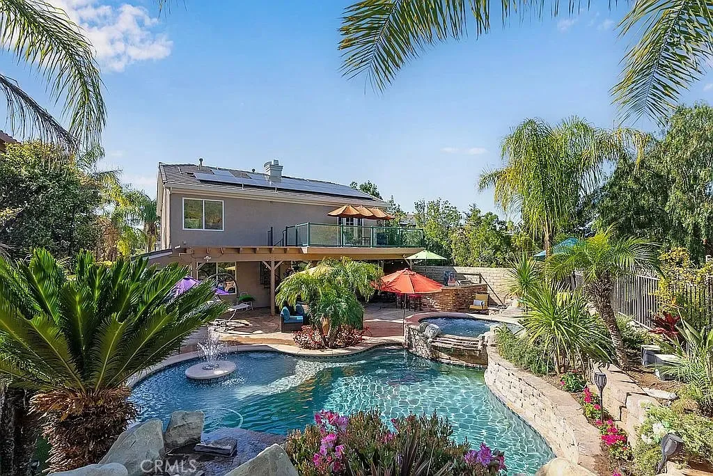 A half acre lot located at the end of a cul-de-sac features a tropical grotto pool setting with water spouts, waterfalls, and fountain. A ten person spa provides party fun. Privacy is the key word to describe this home as a picturesque hill provides backyard privacy. Exterior side walkway is perfect for guests arrival when entertaining. Large Master bedroom is enhanced by French door opening onto a 300 sf deck overlooking pool and private hillside. Master Bedroom with Bidet. Two fully built out walk in closets lead you to your large bath with spa tub, new glass enclosed shower, and remote controlled window coverings.