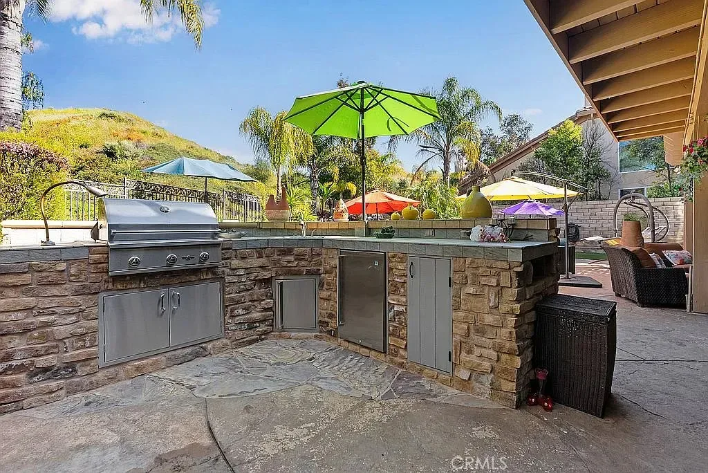 Barbecue with fridge, sink, and sitting bar.