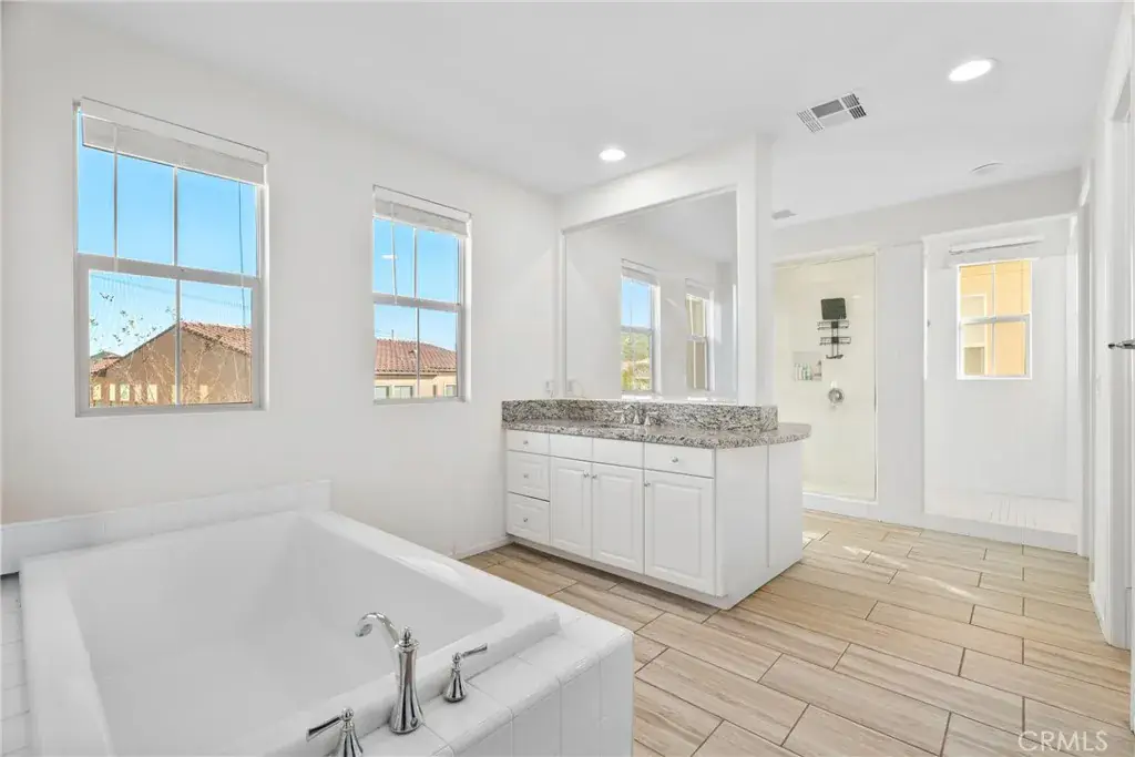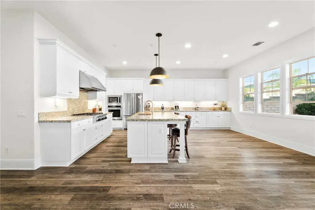 Exclusive opportunity to reside within the gated 5 Knolls Community of Santa Clarita! This beautiful, upgraded 5 bedroom and 5 1/2 bathroom home plus LOFT and 3 car garage offers on a culdesac street with over 3,900 square feet of thoughtfully designed living space with high ceilings and bright natural light! The kitchen is incredibly spacious with granite countertops, a huge center island, and superfluous storage! Adjacent to in kitchen dining plus a spacious living room and backyard views along with a lovely formal dining room! Outside, enjoy the covered patio, lush landscaping and fruit trees complete with outdoor ceiling fan and grassy space for pets and kids to enjoy! There is an en-suite BEDROOM AND BATHROOM located on the MAIN FLOOR, which is perfect for guests or a home office! Additionally a convenient powder half bath is available for visitors! Upstairs features an expansive primary suite, 3 additional bedrooms, 3 full bathrooms, and a large bonus room/loft with balcony overlooking the lovely neighborhood! The primary bathroom includes 2 walk-in closets, dual sinks with vanity areas, soaking tub and large walk-in shower! Community amenities include a beautiful pool, spa, modern clubhouse, paddle tennis courts, BBQ areas, fire pits, dog park and hiking trails! With mind access over Golden Valley, Newhall Ranch Road to the 14, 5 and 126 freeways make this a convenient and desirable location central to all of Santa Clarita’s finest amenities! This is a home you will enjoy for years to come!