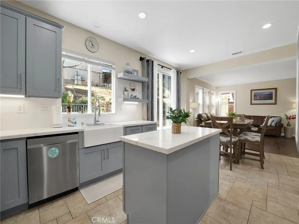 The heart of the home is the remodeled kitchen, featuring quartz countertops, a center island with built-in wine refrigerator, and an open connection to the cozy family room, perfect for everyday living and entertaining.