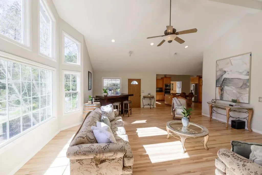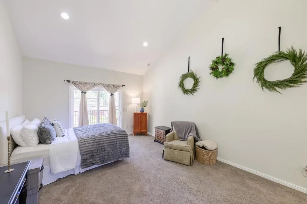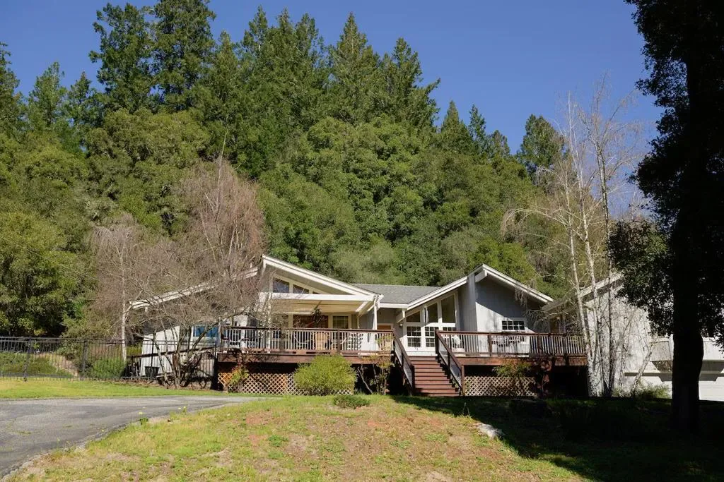 Beautifully remodeled single-level home set on 3 peaceful acres just minutes from town. Step inside the formal foyer and immediately notice the gorgeous Hickory wood floors, soaring vaulted ceilings, and expansive windows that fill the home with natural light. Bright living room features a cozy wood-burning fireplace and French doors leading to the front deck. The spacious kitchen offers abundant Alder Wood cabinetry, granite slab counters, and stainless-steel appliances, flowing seamlessly into the expansive family room with vaulted ceilings, large windows, a cozy hearth, and bar area an ideal gathering space. The formal dining room opens to a private deck perfect for morning coffee or al fresco dining. The primary suite features a large walk-in closet, beautifully tiled en suite with double sinks, and direct yard access. Four additional guest bedrooms and two full baths offer plenty of space, including one oversized bedroom with private deck access. Enjoy a beautifully hardscaped patio surrounded by blooming gardens, plus fenced garden beds, chicken coop, shed, and play structure. 3-car garage with EV charger, owned solar with battery backup, newer electrical and plumbing, private well with filtration. AWARD WINNING schools, near shopping, trails, beaches, and Silicon Valley.