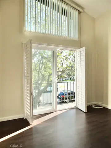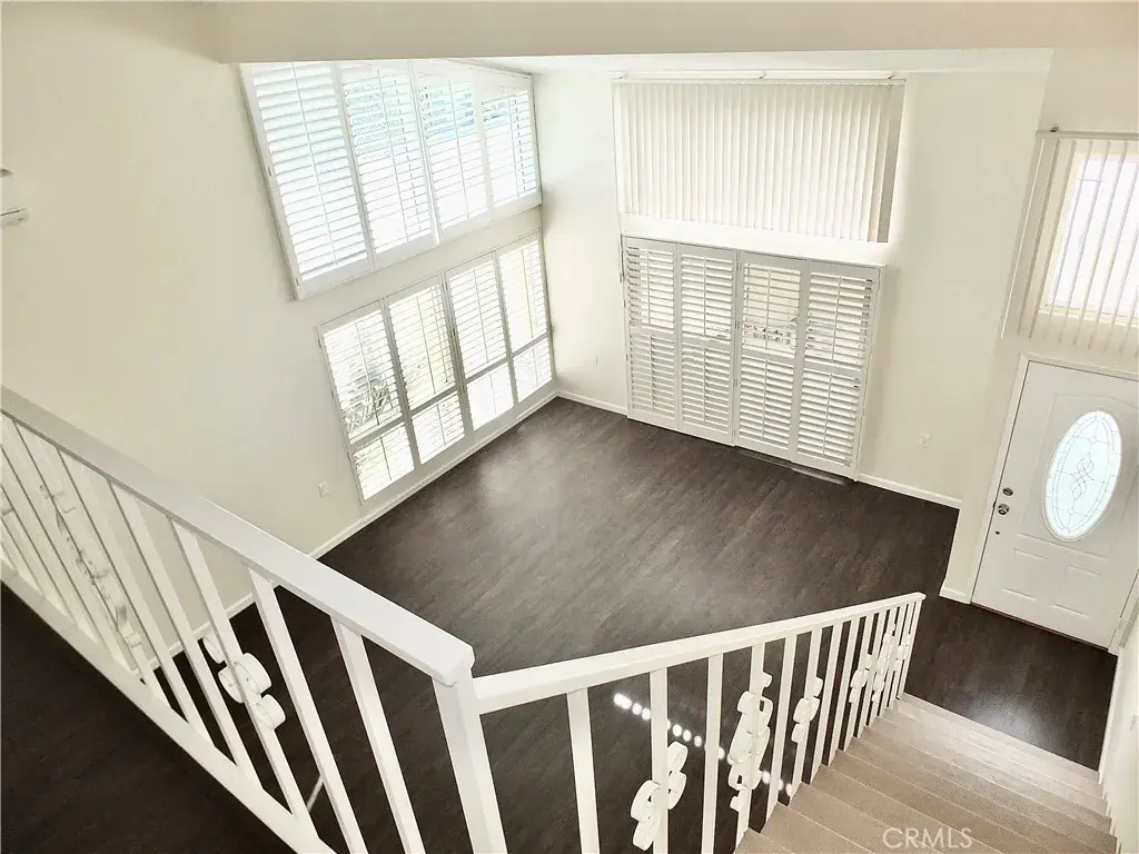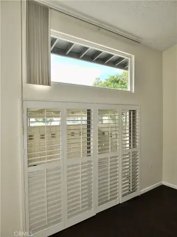 This impressive two-level home features ensuite bedrooms on both floors, providing privacy and convenience for residents and guests alike. The open-concept main level welcomes you with dramatic high ceilings, creating a bright, expansive living and dining environment. Dual-pane windows and plantation shutters fill the space with natural light while offering energy efficiency and privacy.