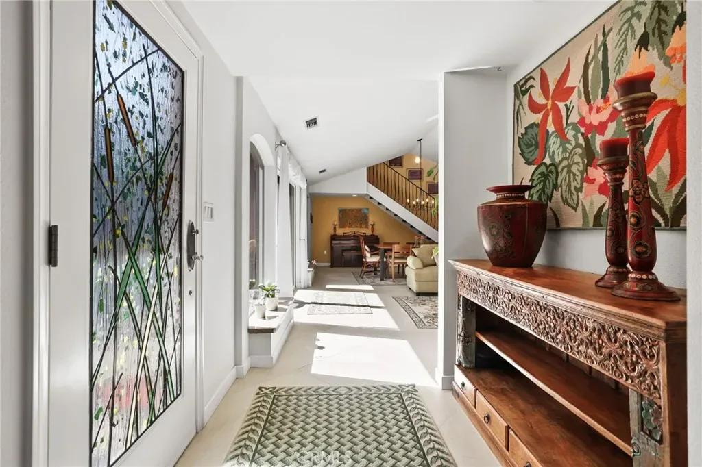 The artistic character is apparent from the moment you arrive: a stained glass entry opens into soaring cathedral ceilings, rich porcelain floors, and beautiful custom double-paned windows that fill every room with soft, natural light. A beautiful Limestone fireplace makes the living area the natural heart of the home, while the warm custom finishes create an atmosphere that feels both elevated and genuinely comfortable.