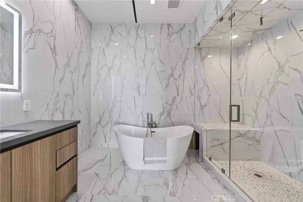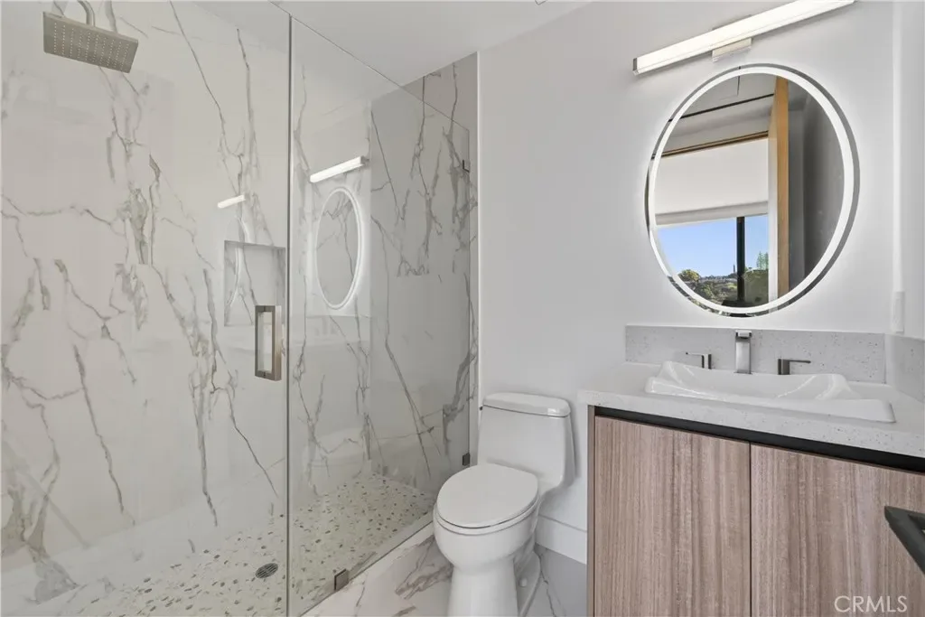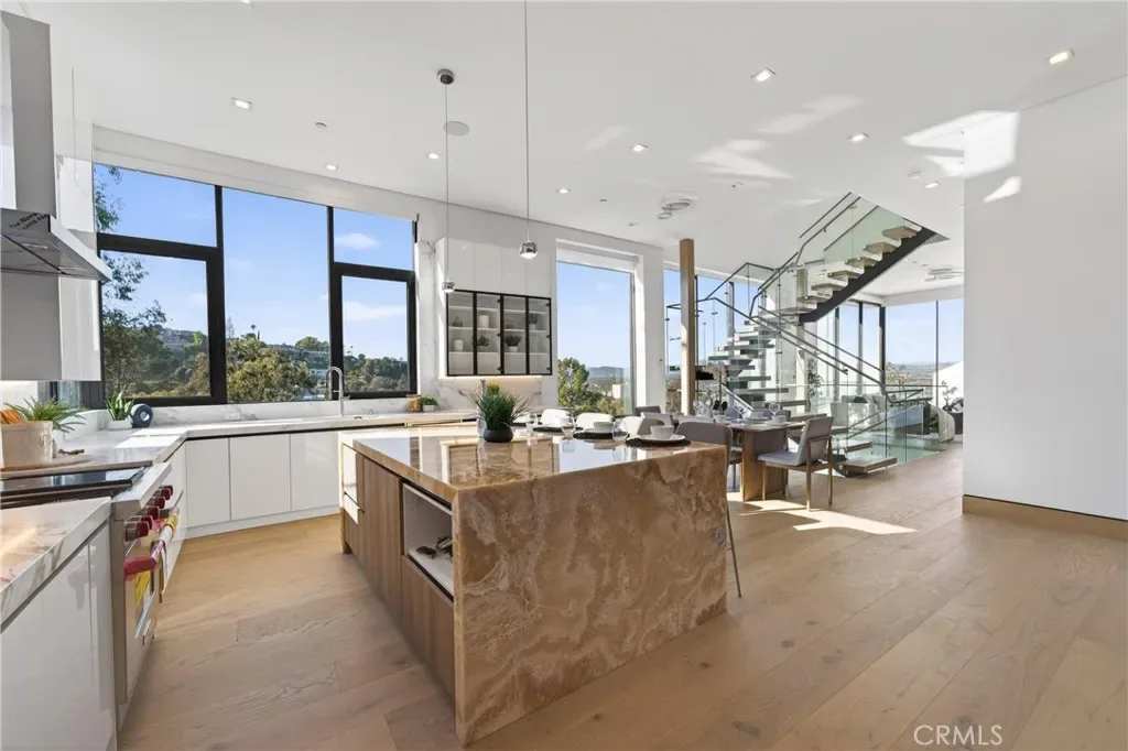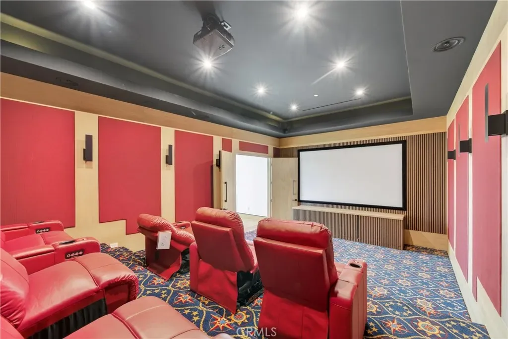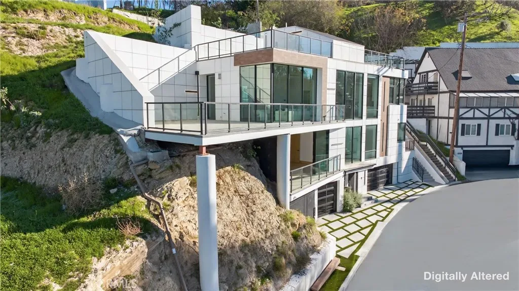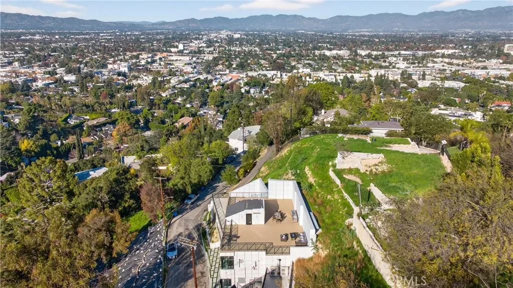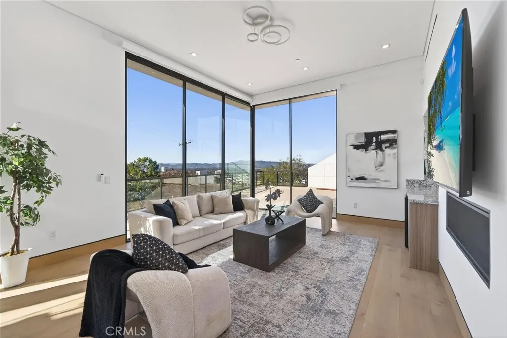 Welcome to 4016 Oakfield Drive, a gravitating 2025 new-construction residence located in the highly sought Sherman Oaks hills. This striking modern estate showcases bold architectural design, fully-renovated finishes, and sweeping skyline views lapsing around the perimeter of the property. This multi-level residence offers four bedrooms, four bathrooms, a full chef’s kitchen with dining area, a private movie theater, a fully-equipped rooftop entertaining deck, and a three-car garage, delivering a true luxury lifestyle. Prior to entry, the exterior offers a striking statement with clean geometric lines, floor-to-r-to-ceiling glass, and a sophisticated blend of concrete, metal, and warm wood accents. Inside, the home opens to a light-filled interior anchored by wide-plank wood flooring and a dramatic floating staircase with glass railings connecting each level. The first level leads to the garage and is adjacent to the elevator reaching any and all desired floors. The second level houses three expansive bedrooms, two bathrooms, and amiable custom storage. The third level of the residence greets you with an open-concept main living space featuring the main living room, ultimate chef’s kitchen, custom bar, primary master suite, secondary master suite, a private movie theater, and an expansive patio overseeing the valley of Los Angeles. The chef’s kitchen is elegant and functional, centered around a statement waterfall-edge stone island with bar seating. Custom flat-panel cabinetry, premium built-in appliances, full sink, and polished stone countertops create a clean atmosphere. The dining area is directly adjacent to the kitchen making it convenient for hosting dinners and centered in the heart of the home. Designed for entertainment and hosting, the home features a dedicated movie theater with tiered seating, sound-treated walls, and integrated lighting perfect for private screenings or viewing experiences. A custom bar is located with a mini fridge and marble cabinetry ideal for storing all entertainment essentials. The living room also features a striking double-sided linear fireplace anchors the home, connecting the living room and the primary suite with ambiance. House has a central vacuum system Leading the way to the final floor, the rooftop deck provides a private outdoor oasis complete with a built-in stainless steel barbecue, prep space, and ample room for dining and lounging, all set against panoramic skyline views.