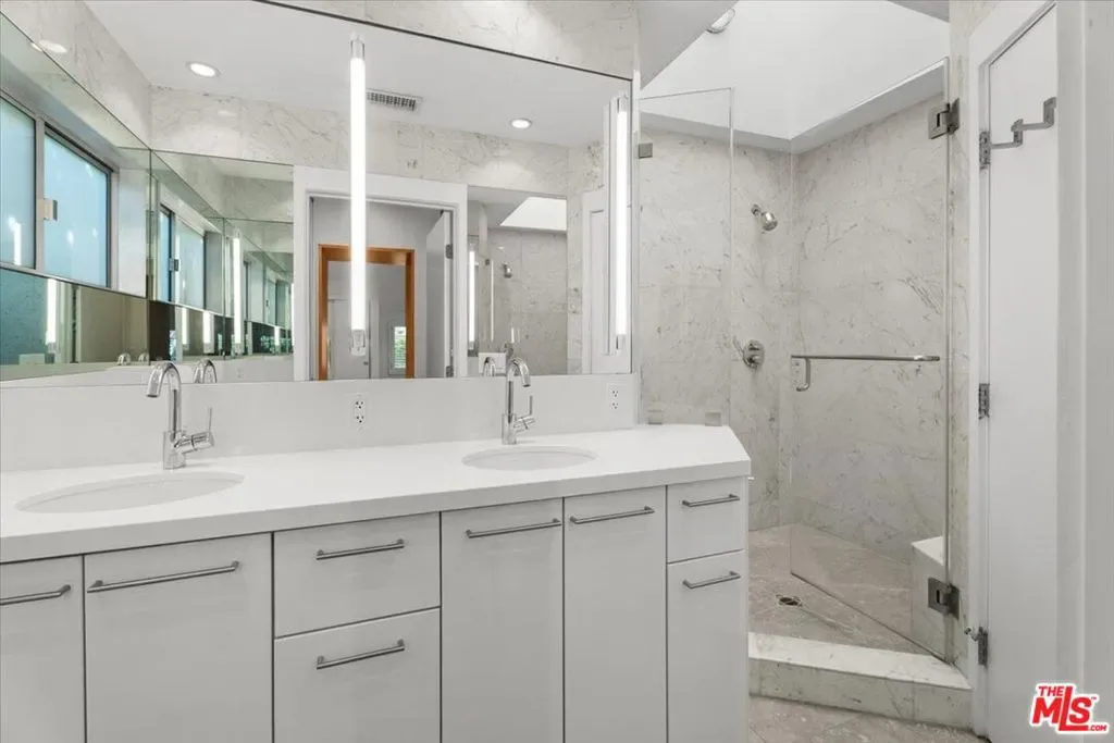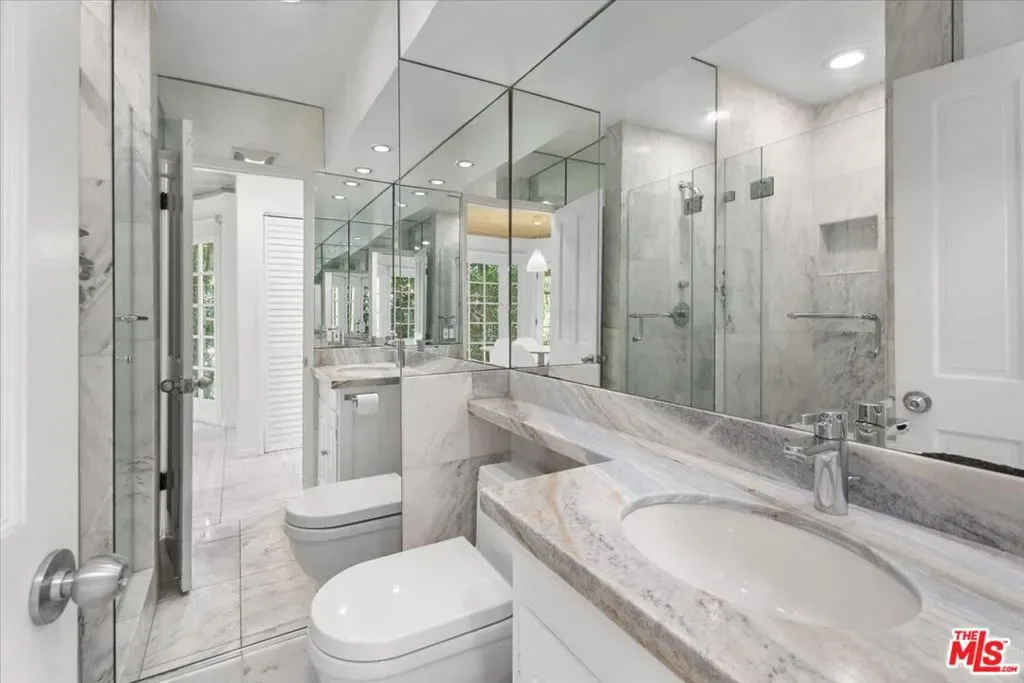 Terrific location south of Ventura Blvd. Spacious 5 bedroom and family room with 3112 sq.ft. Living and Family rooms with fireplaces, built-in book cases and custom lighting. Hardwood floors throughout. Formal dining room and very spacious kitchen with marble center island and breakfast area. Kitchen has top appliances including Subzero refrigerator, Wolf range and Miele dishwasher. Separate laundry area with Miele washer & dryer. Skylights and high ceilings. Master bedroom has private bath with dual vanities and glass shower with skylight. Glass doors open to private rear yard with salt water Pool & Spa (healthier than chlorine)! Beautiful indoor-outdoor flow from house to the garden. Very conveniently located to new high end Ralph’s, Whole Foods & Erewhon Markets for shopping. Very close to Harvard-Westlake and walking distance to Buckley School.