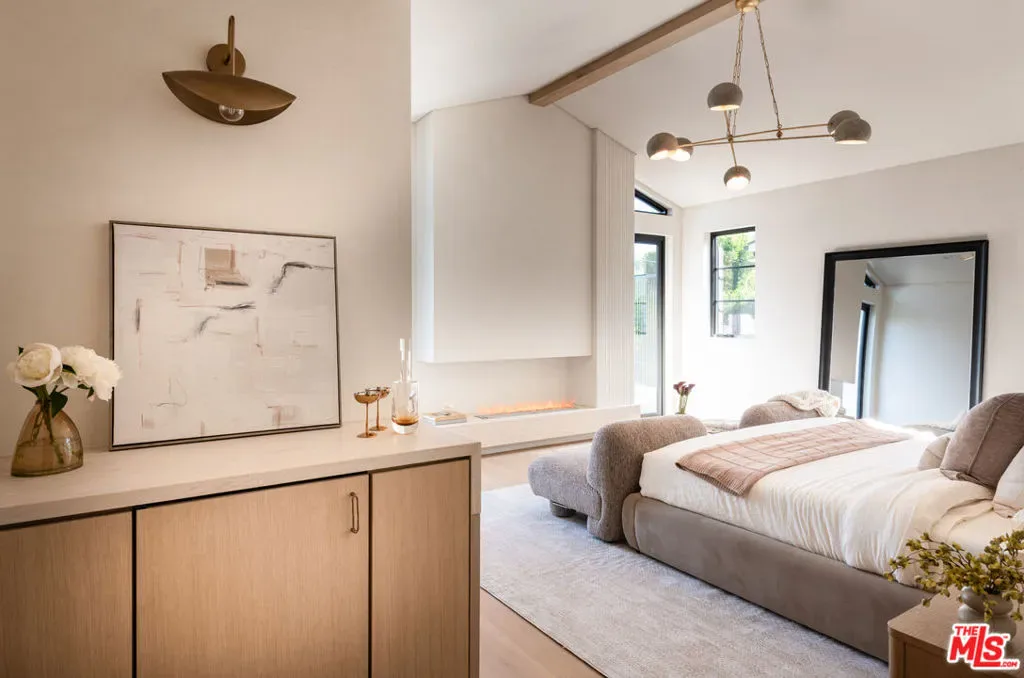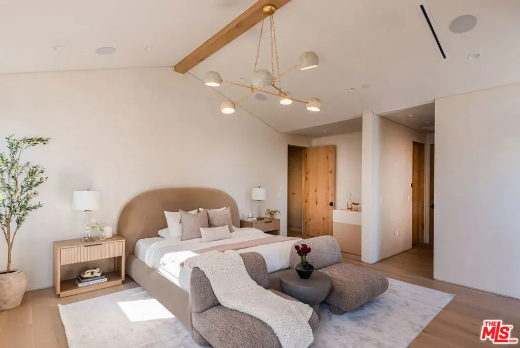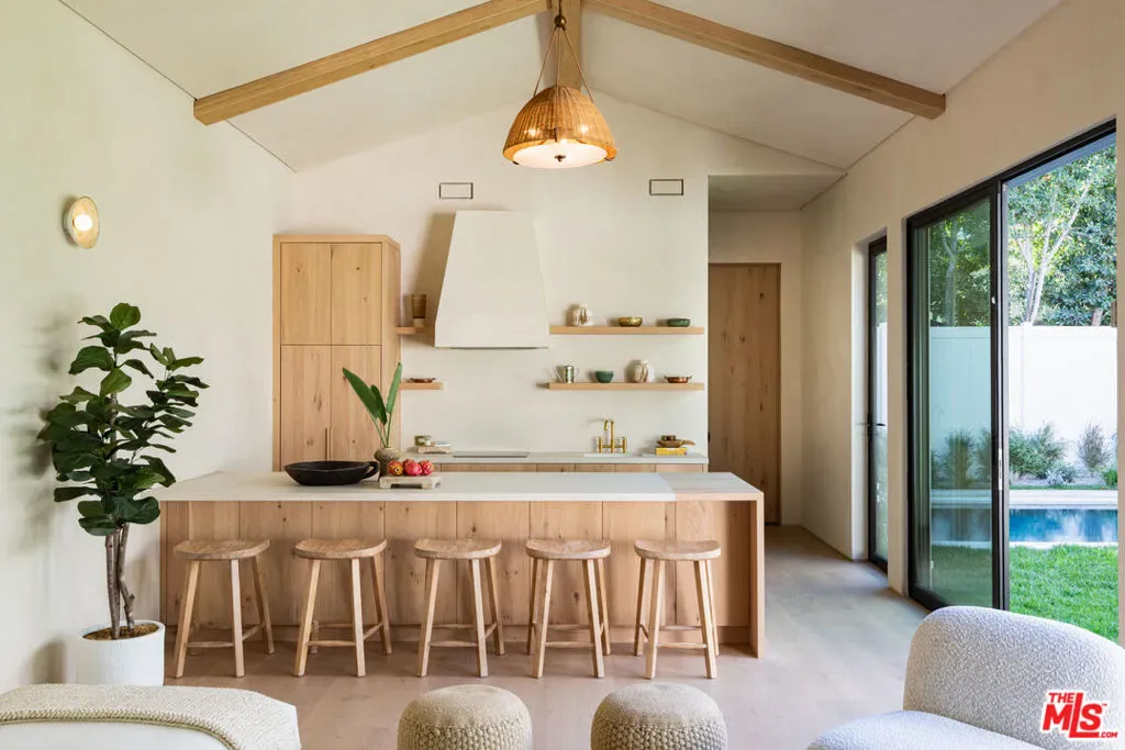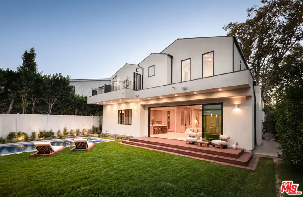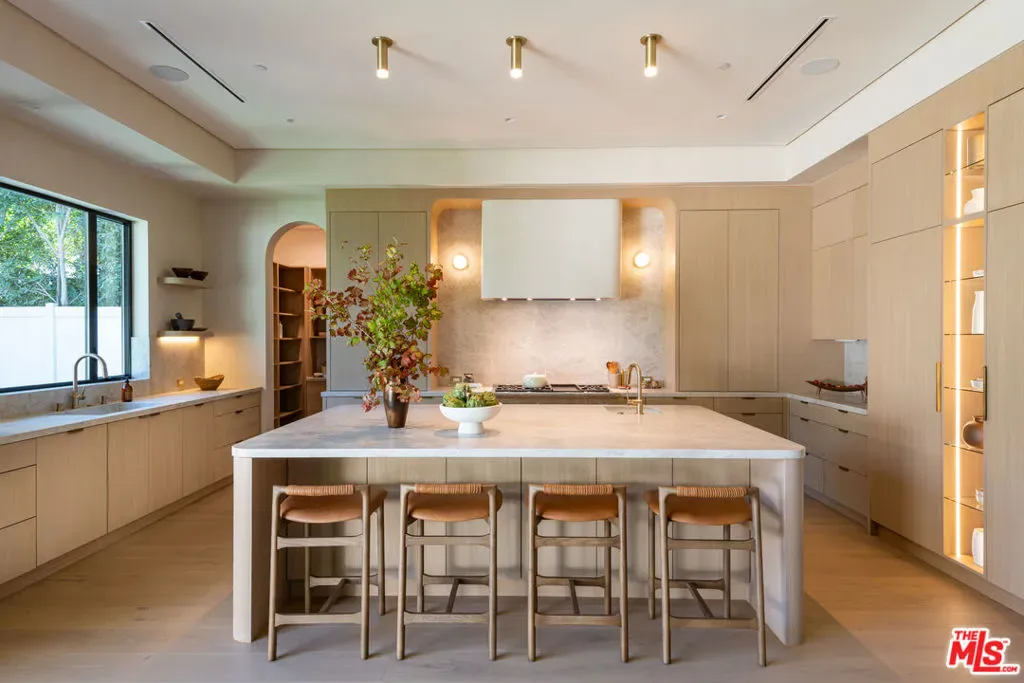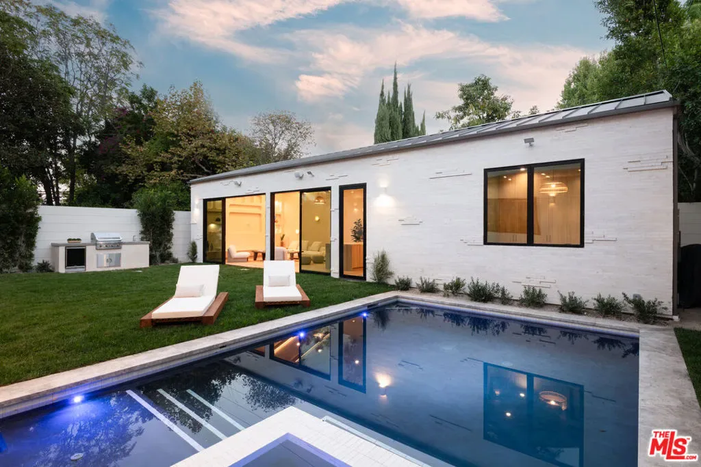 Introducing a newly built Deco Revival inspired modern estate in the heart of Sherman Oaks, ideally located South of the Boulevard and moments from top restaurants, shops, and cafs. Crafted with elevated materials and refined organic texture elements, this residence blends timeless Art Deco elegance with contemporary California living. The exterior features natural stone, brick, and smooth stucco, creating a striking architectural presence. Once inside, custom oak cabinetry, hand-crafted oak ceiling beams, and European natural stone countertops set a sophisticated tone. Upon entering, the main floor unfolds with a seamless flow through spacious, open concept living. Natural light fills the space where expansive living and dining areas flow seamlessly into the gourmet kitchen. The chef’s kitchen is equipped with premium Thermador appliances, European stone countertops, bespoke fixtures, and a large island designed for cooking, gathering, and everyday living. Curved architectural lines and thoughtful lighting, elevate the ambiance with refined soft deco influence. A desirable first-floor ensuite bedroom provides flexibility for guests or a private office, while a spacious theater offers an ultimate cinematic experience. Upstairs, there are four additional ensuite bedrooms, including a luxurious primary suite with vaulted ceilings, custom walk-in closet, private balcony overlooking the outdoors and a spa-inspired bathroom featuring premium finishes and marble countertops. Thoughtfully designed for comfort and privacy, each bedroom enjoys its own beautifully finished ensuite bathroom and custom closets. Make your way outside to the backyard oasis, offering a resort-style pool and spa, outdoor BBQ island and room for alfresco dining and entertaining. The 1 bedroom, 1 bathroom ADU is the perfect place for extended family, friends who are visiting or your home studio.