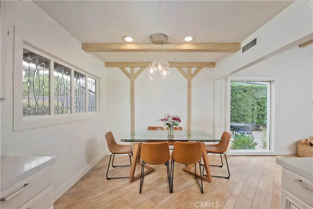 Nestled down a secluded, gated private driveway in the highly desirable Fashion Square district, this exceptional single level residence is highlighted with elegant wood and tile floors, loads of natural light and its timeless designer details. Upon entering the main living area, you are immediately captivated by the dramatic space, enhanced with its soaring ceilings, central fireplace, generous picture window and French doors that pour in natural light. Opening from the living room is the expansive dining room that flows naturally into the perfectly updated kitchen, equipped with stainless steel appliances, custom cabinetry, and beautiful quartz countertops. Both the primary and secondary bedroom feature updated en-suite bathrooms, both enhanced by their luxurious wood beamed ceilings, with the oversized third bedroom offering direct access to the private rear yard patio. Step outside and decompress in the ultra-private rear yard with expansive entertaining areas surrounded by mature landscape, enhanced by the tranquil sound of its custom water feature, enjoy a round at your private putting green or explore the rear garden set under a canopy of lush trees. This home offers a rare combination of privacy and convenience tucked away from it all, yet moments from premier shopping and dining venues. Don’t miss this opportunity to enjoy a timeless home with distinctive character and beautiful updates in a premier Sherman Oaks location!
