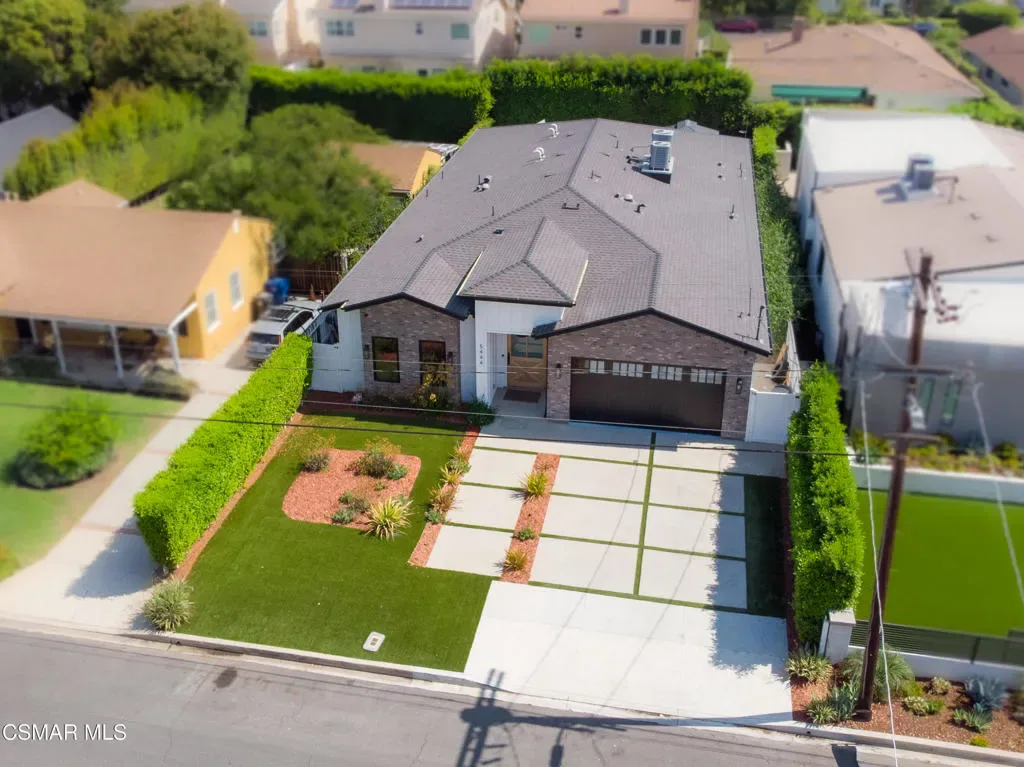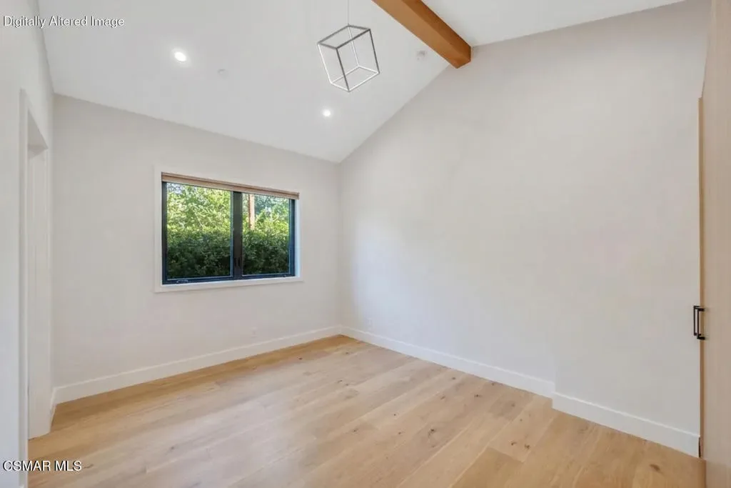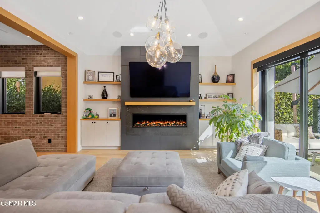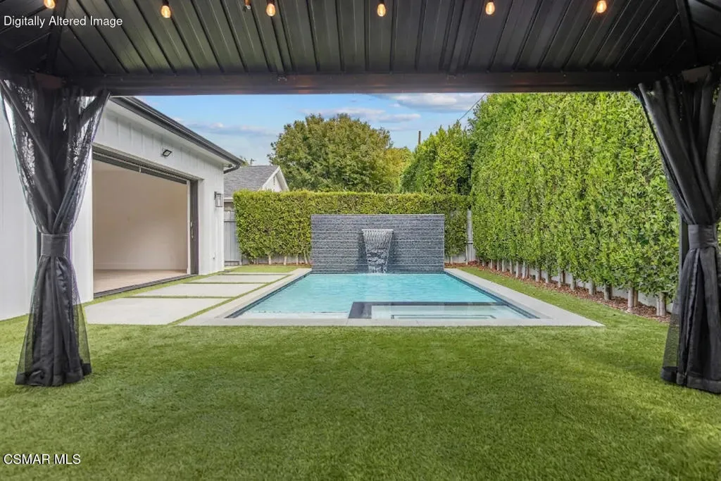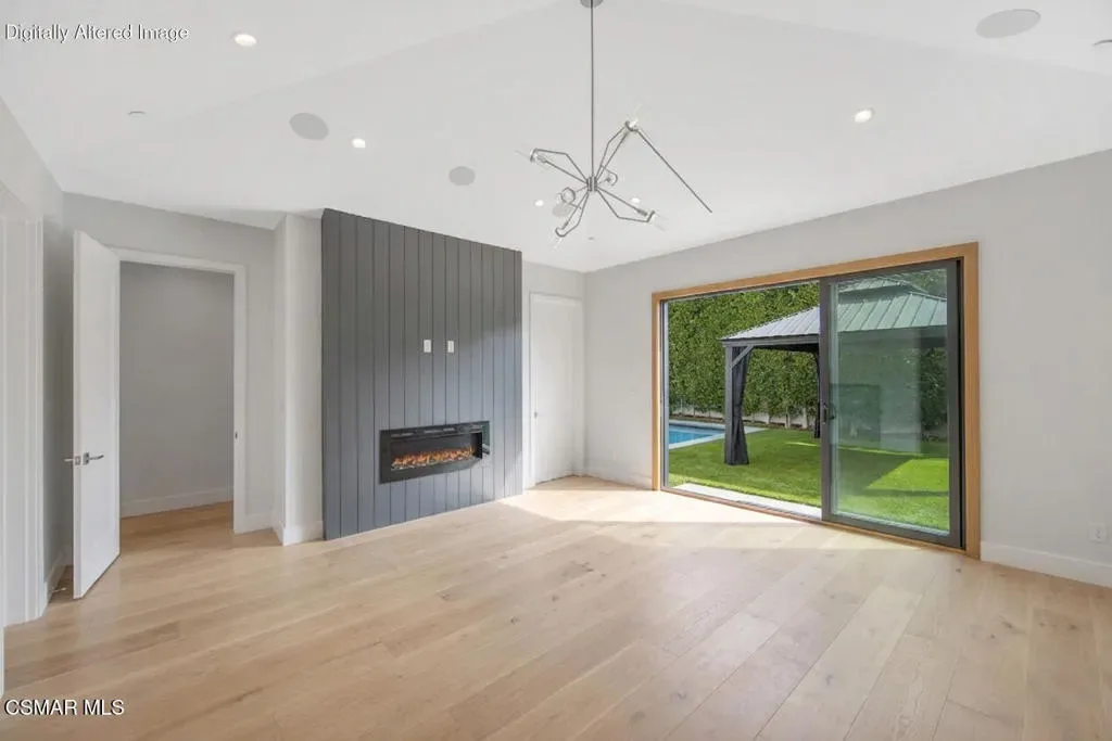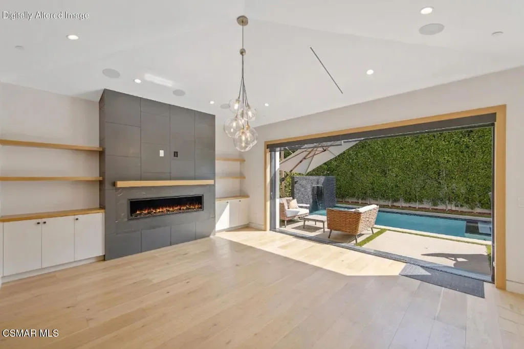 Welcome to 5444 Murietta Avenue, a stunning single-story residence in the coveted Chandler Estates neighborhood of Sherman Oaks. Newly constructed in 2022, this contemporary masterpiece blends luxury, comfort, and modern technology across more than 3,100 square feet of thoughtfully designed living space. With 4 bedrooms, an office, and 4.5 bathrooms, every detail has been carefully curated for today’s lifestyle.Step through the oversized front door and you are immediately drawn into the expansive great room floorplan, where soaring ceilings with wood beams, designer finishes, and abundant natural light create a warm yet sophisticated ambiance. The living room showcases a dramatic fireplace, custom built-ins, and a disappearing sliding glass wall system that seamlessly connects the indoors with the private backyard oasis. Adjacent, the formal dining area is accented by rich brick details and offers the perfect setting for memorable gatherings.At the heart of the home is a chef’s dream kitchen. Outfitted with a large walk-in pantry, custom cabinetry, and top-of-the-line stainless steel appliances, this space is both functional and stylish. Highlights include a six-burner gas cooktop with flat griddle, dual ovens, built-in microwave, built-in refrigerator, and two sinks for added convenience. The expansive center island, finished with striking waterfall counters and bar seating, invites casual dining and effortless entertaining.The private primary suite is a sanctuary of comfort. Vaulted ceilings, a cozy fireplace, and another sliding glass wall bring elegance and openness to the space, while dual custom walk-in closets provide generous storage. The spa-like primary bath features dual vanities, a dedicated makeup area, a soaking tub, and a glass-enclosed shower with both rain shower head and handheld spray.Three additional guest bedrooms each enjoy high ceilings with exposed wood beams, en-suite bathrooms, and custom closet systems, ensuring comfort and privacy for family and guests alike. The dedicated office includes built-in cabinetry, offering the ideal environment for work or study. The office is easily converted to the 5th bedroom with an adjoining full bathroom. The resort-style backyard is designed for year-round enjoyment. Relax by the sparkling pool and spa with a baja shelf and cascading waterfall feature, or entertain at the covered gazebo with lighting, built-in BBQ, and bar seating. Artificial turf ensures low-maintenance beauty, while mature landscaping enhances privacy.This smart home is fully equipped with surround sound speakers, a Control4 home automation system, and a comprehensive security setup with alarm and cameras. Additional highlights include a large laundry room with sink and cabinetry, a tankless water heater, a direct-access two-car garage with epoxy floors and storage, and a beautifully landscaped front yard with artificial turf and contemporary brick accents.5444 Murietta Avenue represents the best of modern Southern California living–sophisticated design, seamless indoor-outdoor flow, and luxurious amenities, all in one of Sherman Oaks’ most desirable locations.