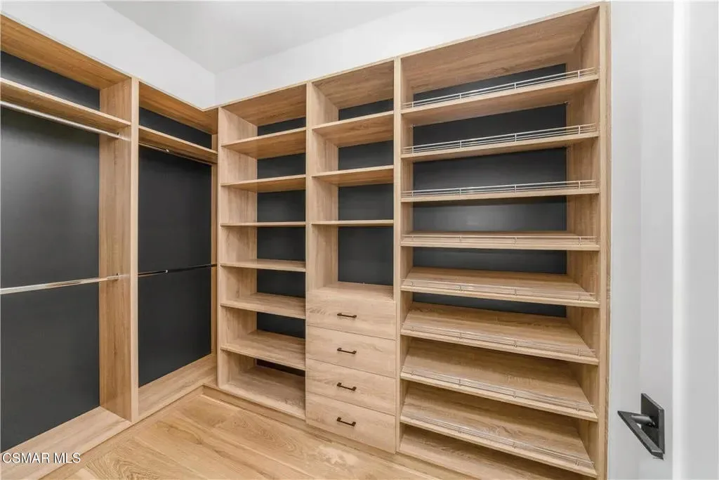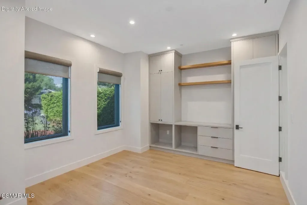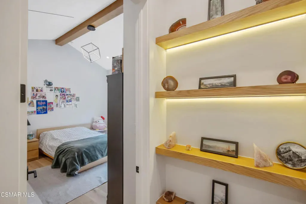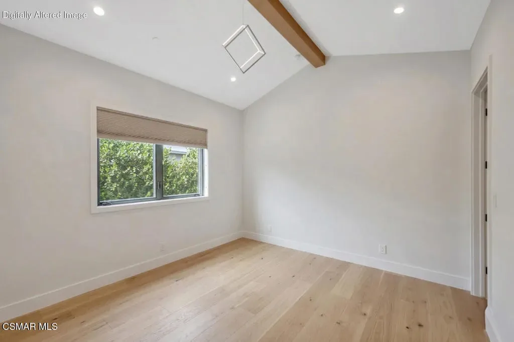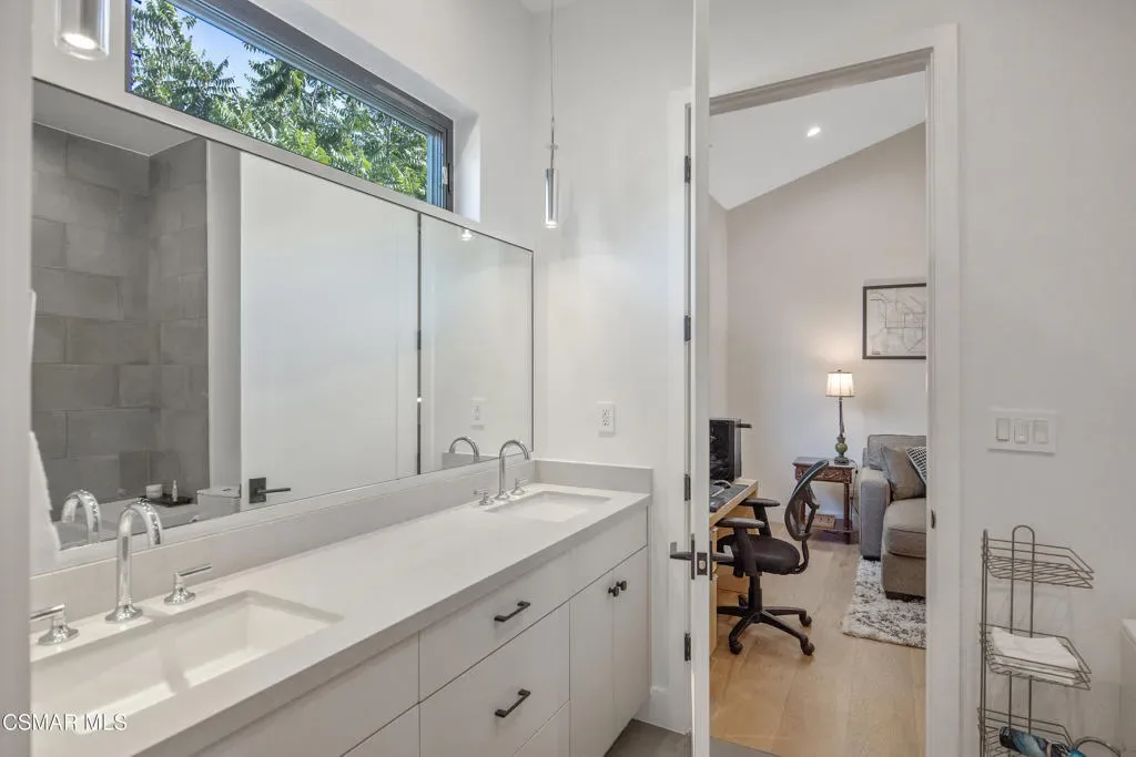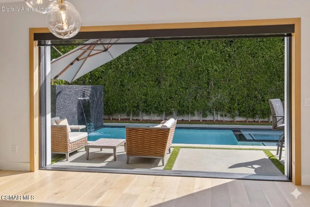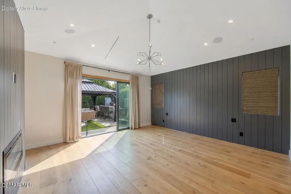 Welcome to 5444 Murietta Avenue, a stunning single-story residence in the coveted Chandler Estates neighborhood of Sherman Oaks. Newly constructed in 2022, this contemporary masterpiece blends luxury, comfort, and modern technology across more than 3,100 square feet of thoughtfully designed living space. With 4 bedrooms, an office, and 4.5 bathrooms, every detail has been carefully curated for today’s lifestyle.Step through the oversized front door and you are immediately drawn into the expansive great room floorplan, where soaring ceilings with wood beams, designer finishes, and abundant natural light create a warm yet sophisticated ambiance. The living room showcases a dramatic fireplace, custom built-ins, and a disappearing sliding glass wall system that seamlessly connects the indoors with the private backyard oasis. Adjacent, the formal dining area is accented by rich brick details and offers the perfect setting for memorable gatherings.At the heart of the home is a chef’s dream kitchen. Outfitted with a large walk-in pantry, custom cabinetry, and top-of-the-line stainless steel appliances, this space is both functional and stylish. Highlights include a six-burner gas cooktop with flat griddle, dual ovens, built-in microwave, built-in refrigerator, and two sinks for added convenience. The expansive center island, finished with striking waterfall counters and bar seating, invites casual dining and effortless entertaining.The private primary suite is a sanctuary of comfort. Vaulted ceilings, a cozy fireplace, and another sliding glass wall bring elegance and openness to the space, while dual custom walk-in closets provide generous storage. The spa-like primary bath features dual vanities, a dedicated makeup area, a soaking tub, and a glass-enclosed shower with both rain shower head and handheld spray.Three additional guest bedrooms each enjoy high ceilings with exposed wood beams, en-suite bathrooms, and custom closet systems, ensuring comfort and privacy for family and guests alike. The dedicated office includes built-in cabinetry, offering the ideal environment for work or study. The office is easily converted to the 5th bedroom with an adjoining full bathroom. The resort-style backyard is designed for year-round enjoyment. Relax by the sparkling pool and spa with a baja shelf and cascading waterfall feature, or entertain at the covered gazebo with lighting, built-in BBQ, and bar seating. Artificial turf ensures low-maintenance beauty, while mature landscaping enhances privacy.This smart home is fully equipped with surround sound speakers, a Control4 home automation system, and a comprehensive security setup with alarm and cameras. Additional highlights include a large laundry room with sink and cabinetry, a tankless water heater, a direct-access two-car garage with epoxy floors and storage, and a beautifully landscaped front yard with artificial turf and contemporary brick accents.5444 Murietta Avenue represents the best of modern Southern California living–sophisticated design, seamless indoor-outdoor flow, and luxurious amenities, all in one of Sherman Oaks’ most desirable locations.