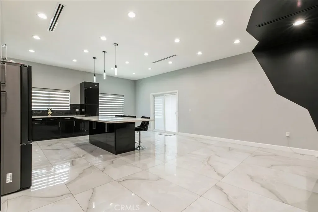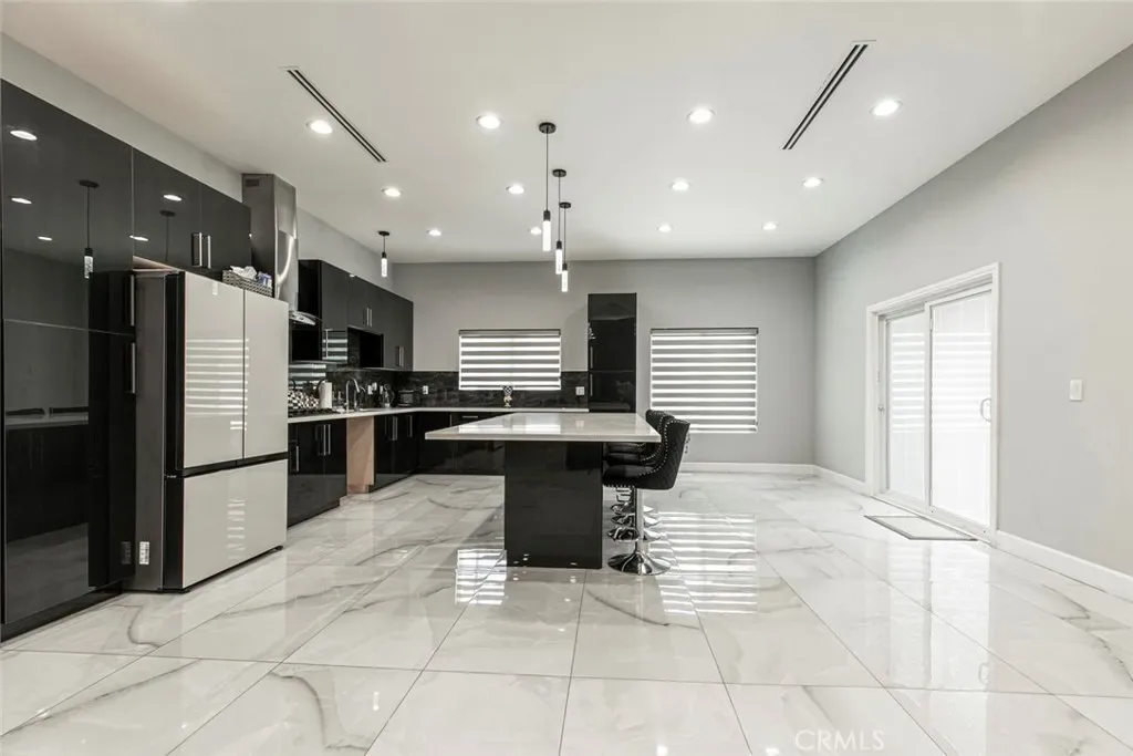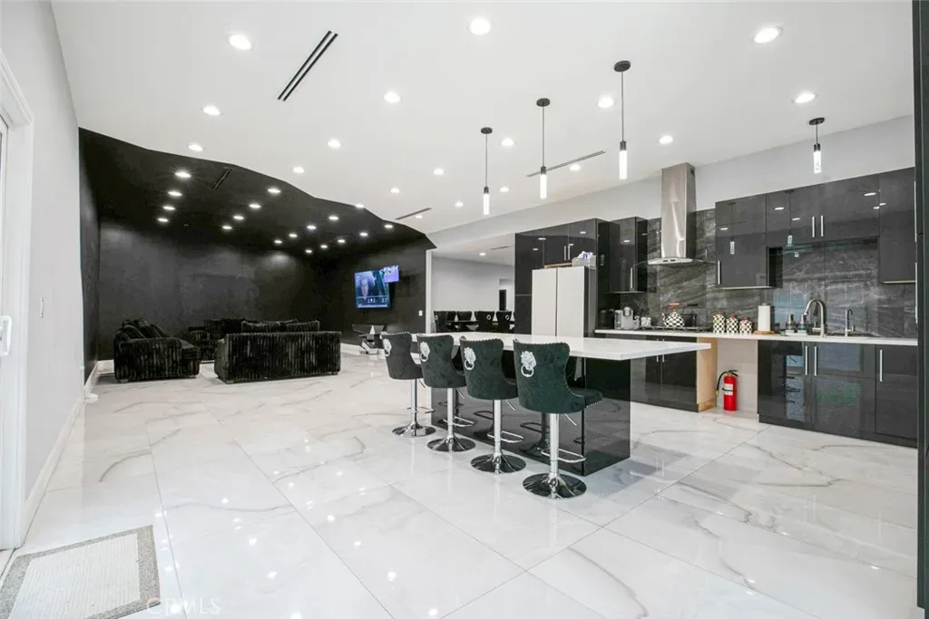 Step inside through a grand iron door and be greeted by an expansive open-concept living area that seamlessly connects to the formal dining and family rooms. The heart of the home is a fully updated modern kitchen featuring sleek dark glossy cabinetry, a striking tile backsplash, quartz countertops, and a large island topped with white stone—perfect for entertaining or casual dining.