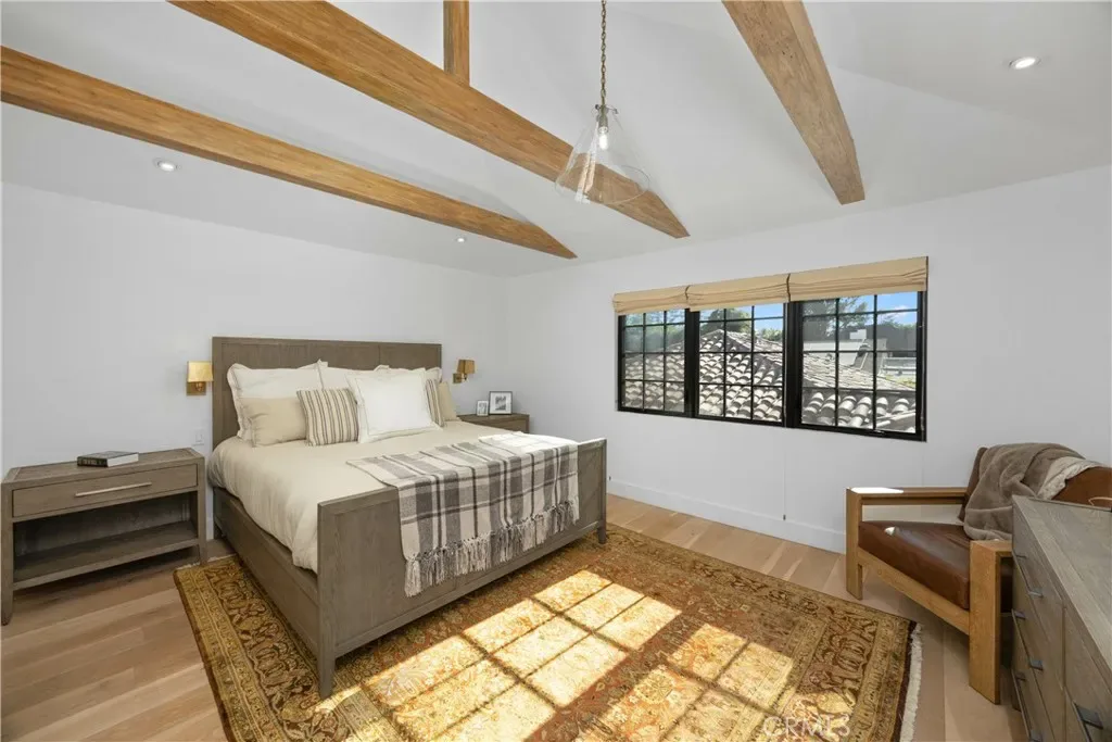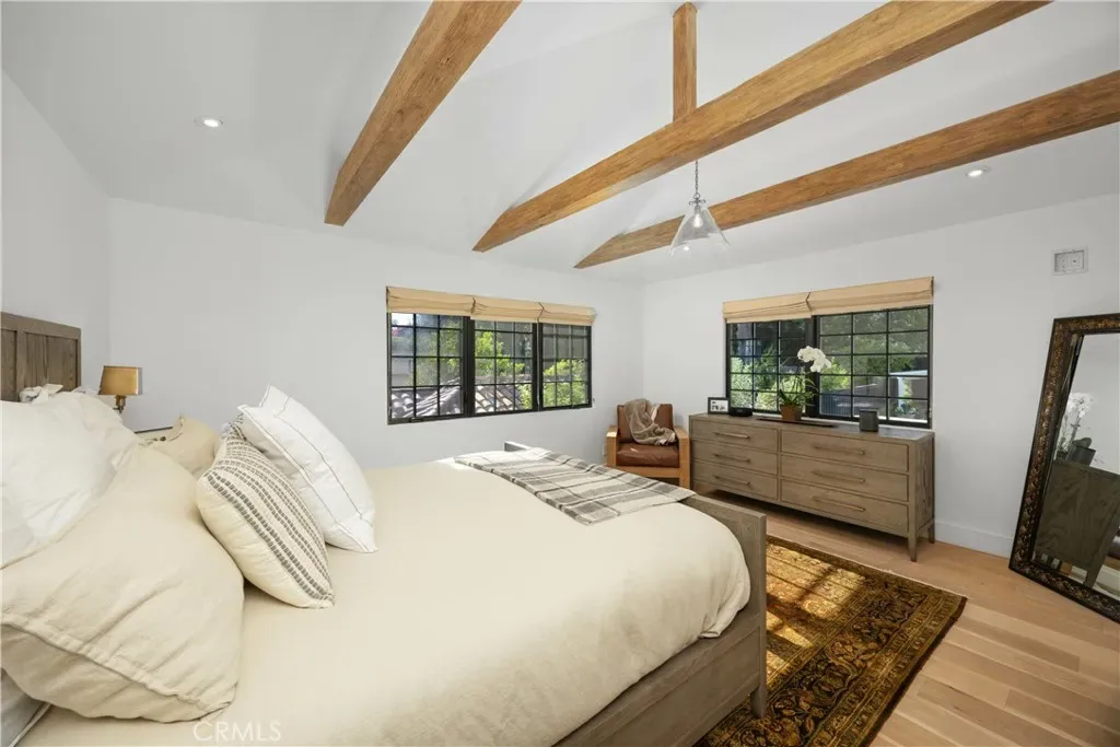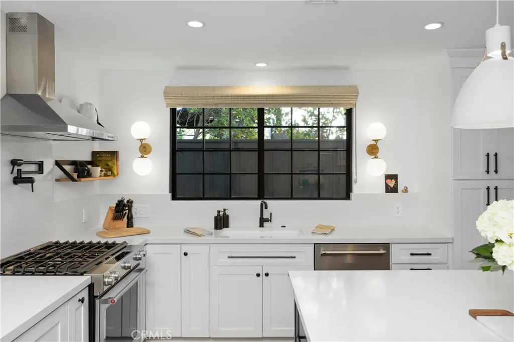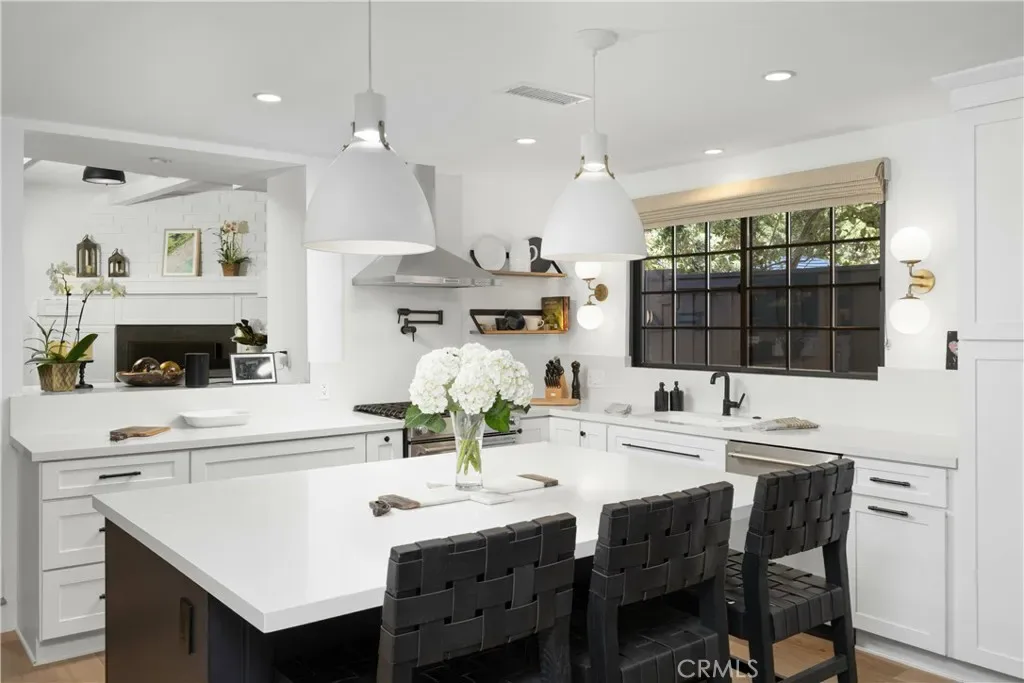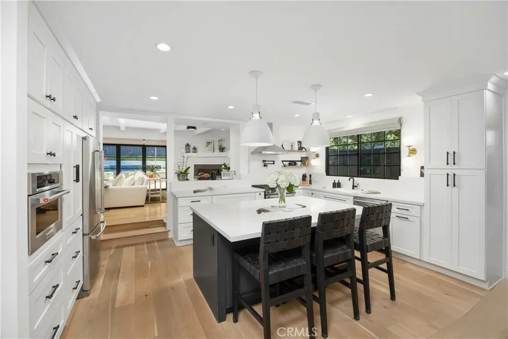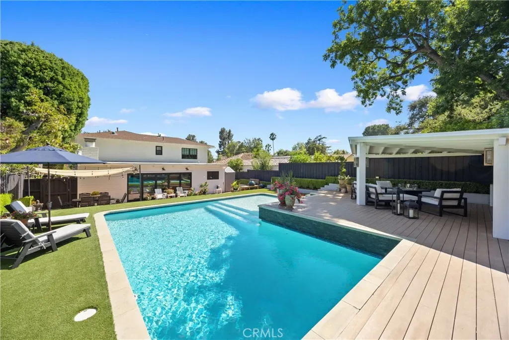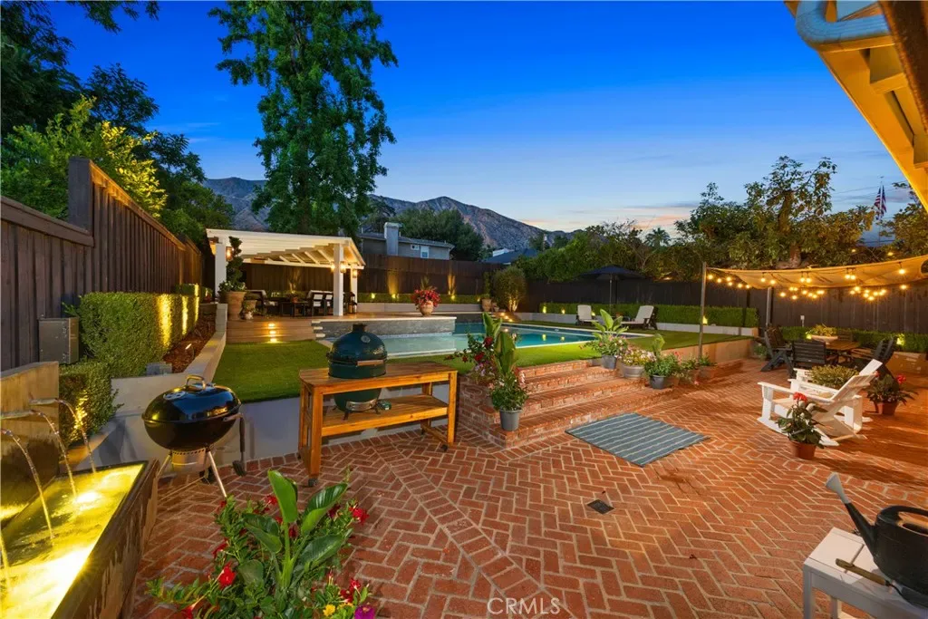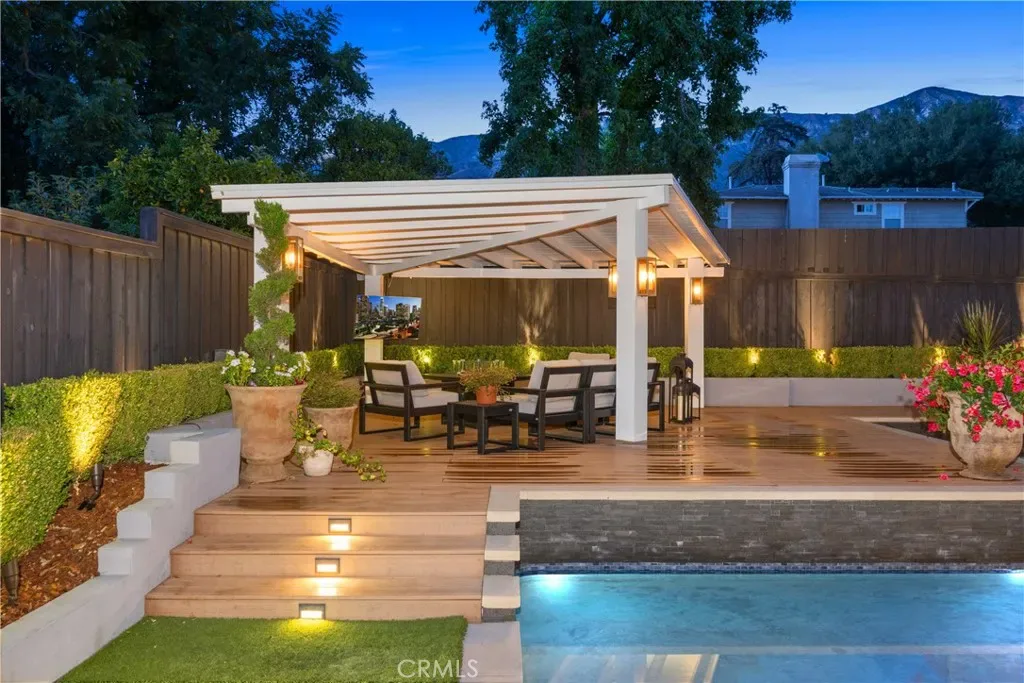 Discover effortless luxury in the heart of Sierra Madre. Restored to perfection in 2018, this immaculate residence invites you to simply move in, unpack, and enjoy. From the moment you step inside, a dramatic two-story foyer sets the tone with soaring vaulted ceilings, neutral designer tones, and wide-plank European oak hardwood floors that flow seamlessly throughout. Sunlight pours through Milgard windows dressed with custom shades, brightening the open living room and chandelier-lit dining area. The chef’s kitchen is a showpiece, boasting a full suite of KitchenAid Café stainless steel appliances, sleek cabinetry, and striking Cosentino Silestone quartz countertops. A three-seat island, illuminated by chic pendants, incorporates Energy Star alarm-activated refrigerator drawers, while a pass-through service window enhances entertaining. Expansive 5-panel aluminum and glass bi-fold lanai doors create a seamless connection to the outdoors, framing serene backyard views. Every detail has been thoughtfully designed—from the custom built-ins in the living room to the maple banquette with storage in the breakfast nook. An artisan wood-burning fireplace with a bespoke mantle provides warmth and charm, while designer baths feature wainscoting, Restoration Hardware vanities, hand-selected wallpaper, and curated lighting. Retreat to the vaulted main suite, highlighted by exposed stained wood beams, a Solatube skylight, and an oversized walk-in closet. Its spa-like ensuite offers a glass-enclosed shower and a freestanding soaking tub, perfect for unwinding in luxury. Step outside to your private oasis. A tiered backyard showcases herringbone brickwork, eco-friendly turf and Cali Bamboo composite decking. Refresh in the upgraded pool with new tile, coping, and Baja shelf, all surrounded by lush hedges for privacy. Additional highlights include updated plumbing and electrical systems, newer HVAC, Nest thermostats and smoke detectors, a Qolsys touchscreen security system with wireless motion detection, and an attached 2-car garage with an insulated Amarr steel door. This rare Sierra Madre jewel combines modern sophistication with timeless comfort—ready to welcome its next chapter. Come experience it today.
