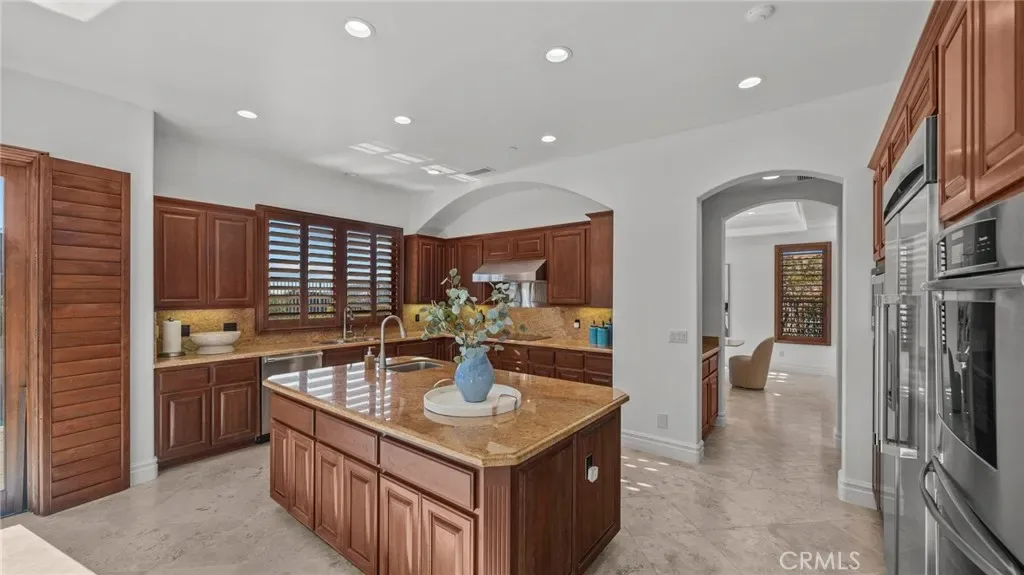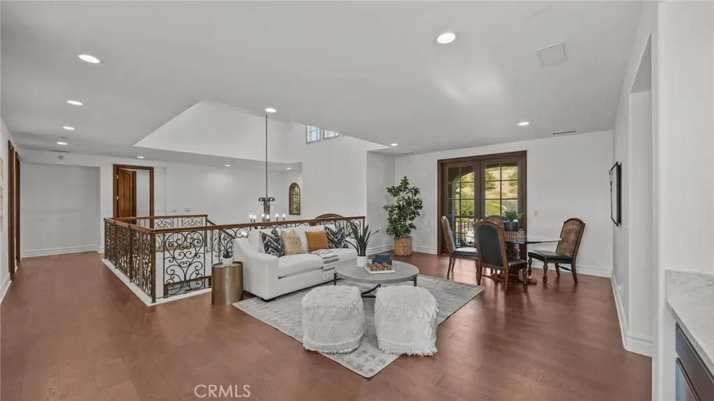 The gourmet chef’s kitchen flows seamlessly into the dramatic, high-ceilinged family and dining room, where walls of windows frame panoramic views of the sparkling pool and rolling hills. Upstairs, an expansive media room is purpose-built for entertainment, complete with a custom cherry-and-quartz bar, kitchenette, and French doors that open to a covered balcony with hillside vistas.