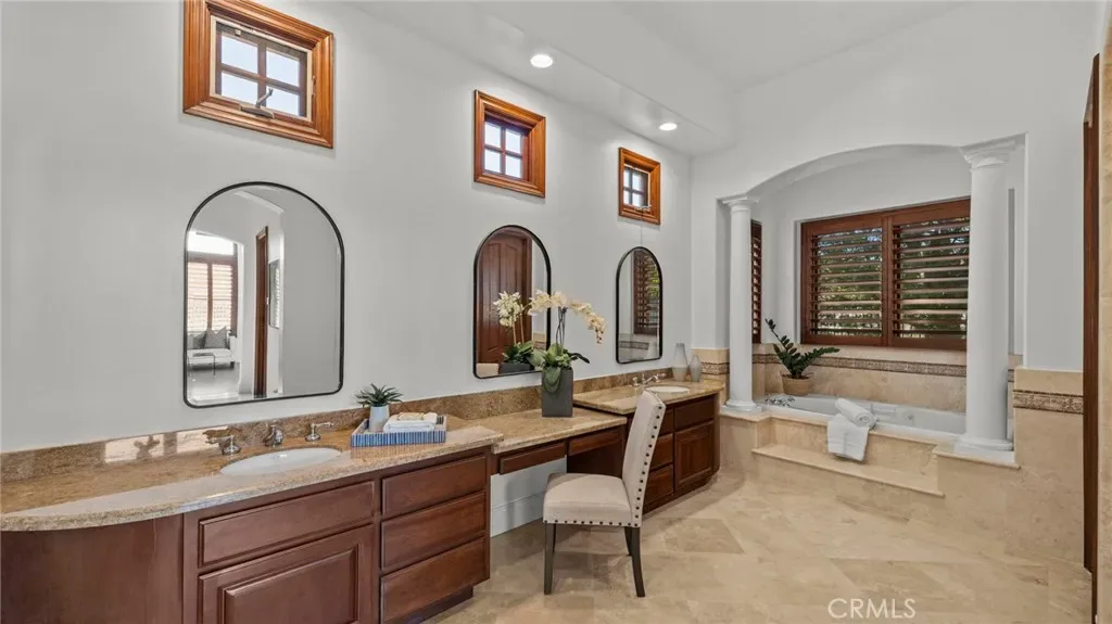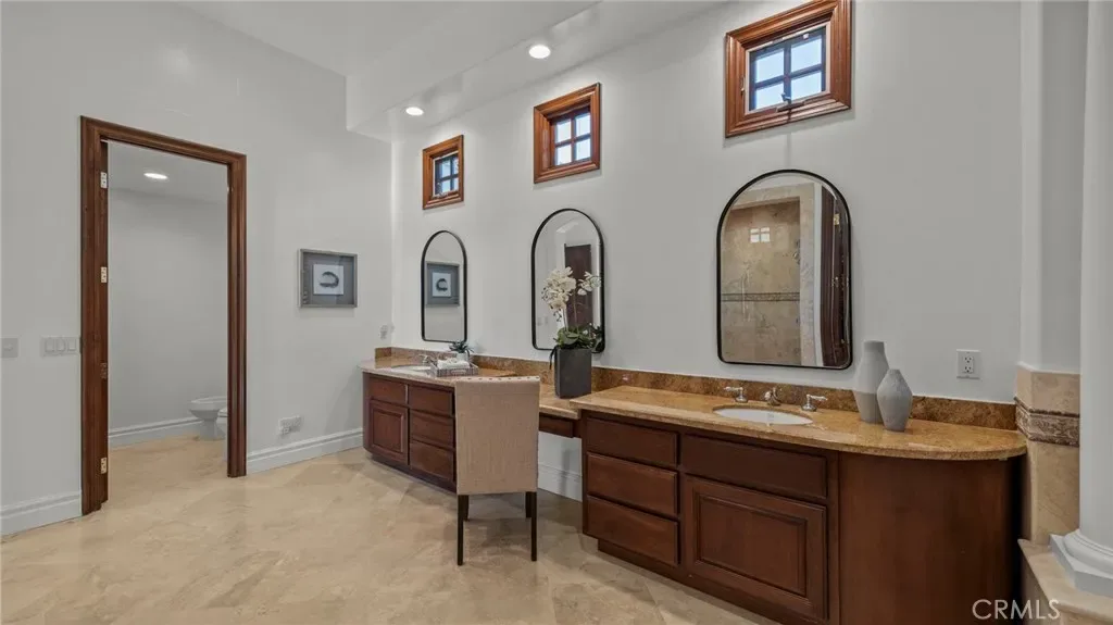 Designed for both grand entertaining and everyday comfort, this six-bedroom, seven-bath masterpiece boasts extensive designer upgrades throughout. The show-stopping primary suite which is downstairs is a true private sanctuary—featuring a spacious bedroom with its own sitting area, a warm natural fireplace, direct backyard and pool access, dual walk-in closets, and a spa-inspired primary bath. An additional bedroom with its own bath is located on the first floor, making this home ideal for multi-generational living or a luxurious guest retreat.