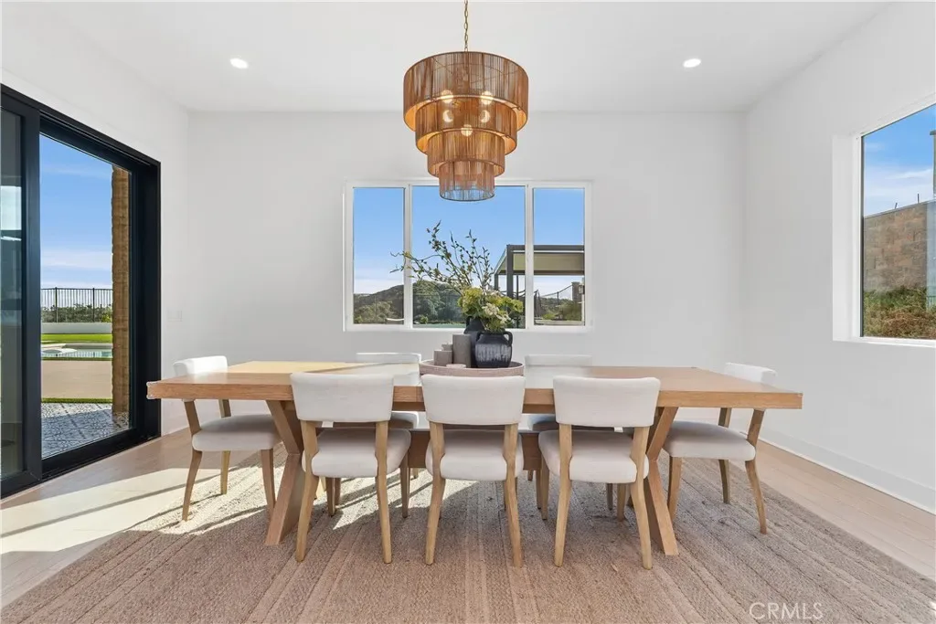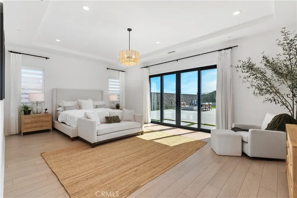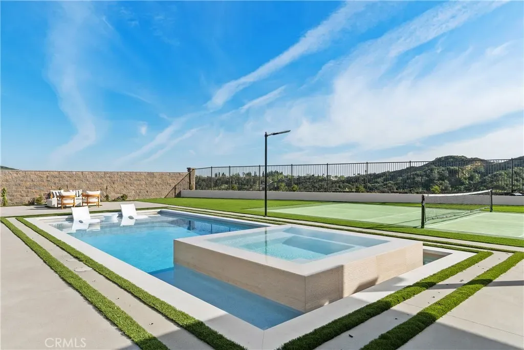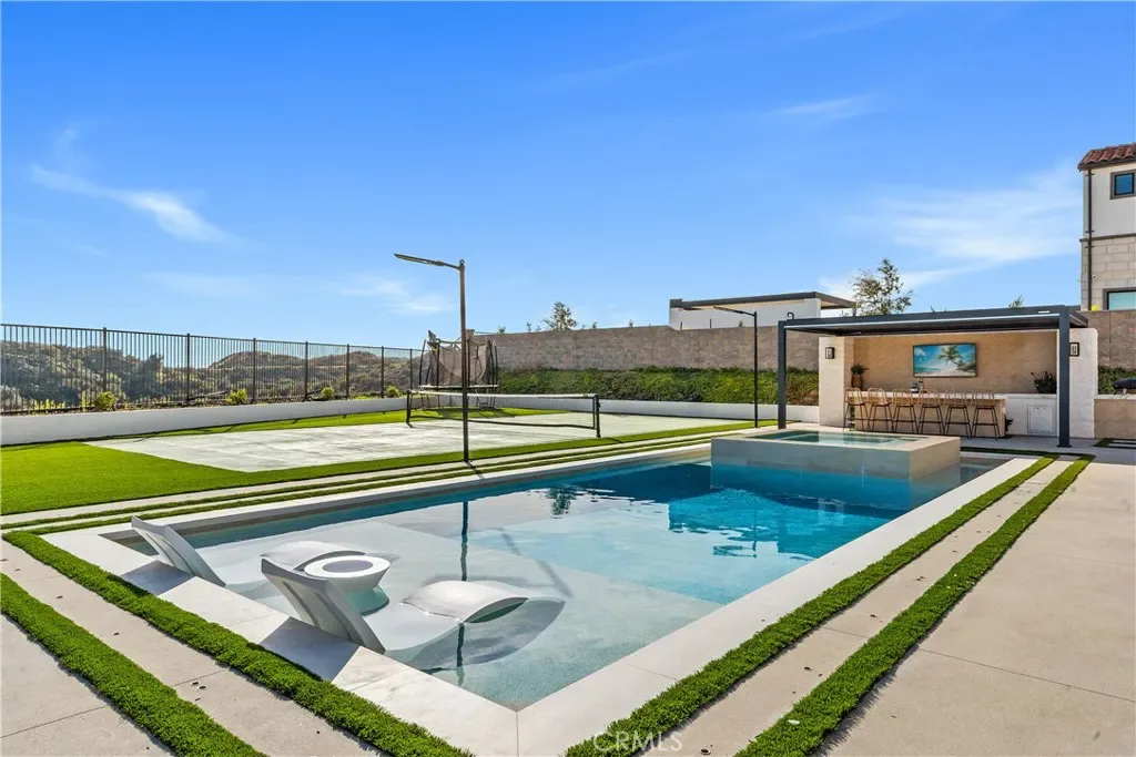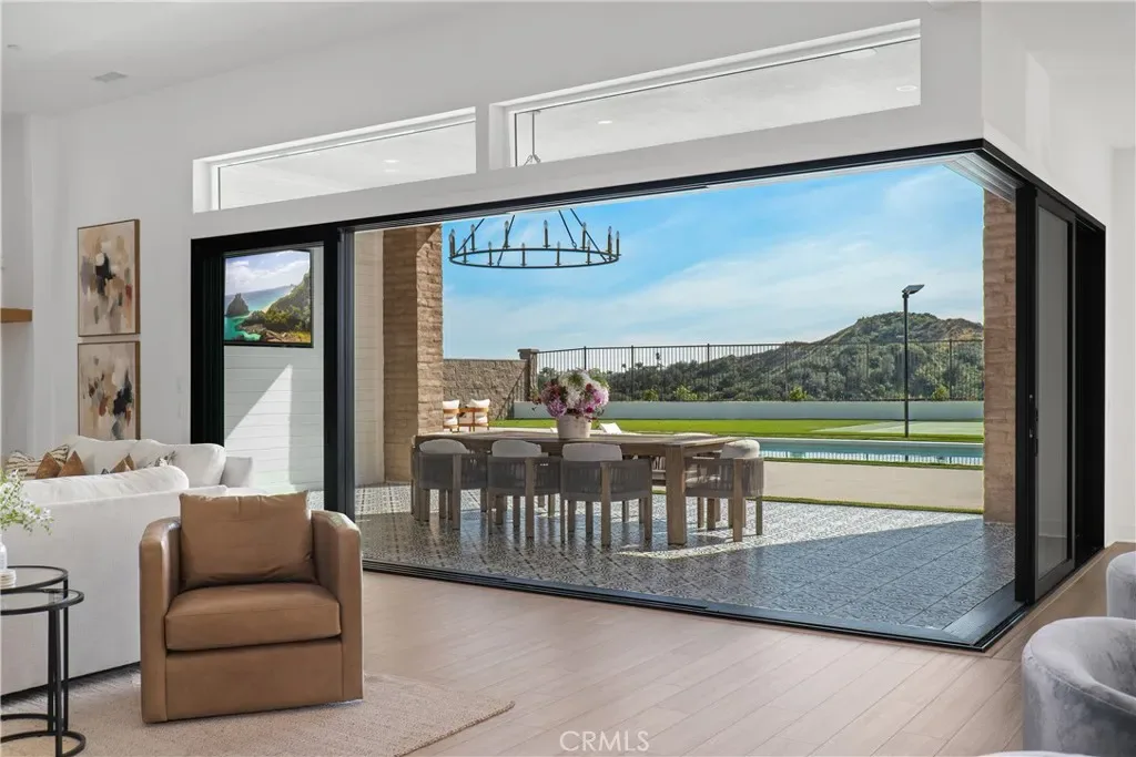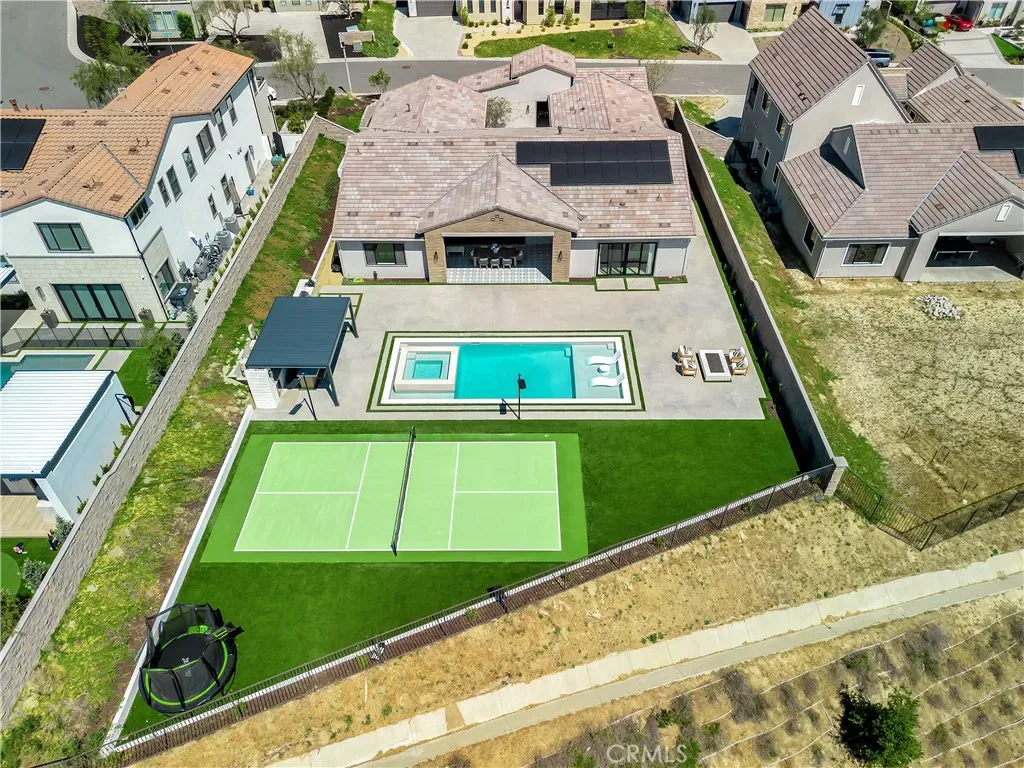 A rare offering of refined, single-story luxury, this exceptional estate seamlessly blends modern design with effortless California elegance—set on an expansive 18,336 square foot lot within the exclusive gated enclave of Saddle Crest, with breathtaking panoramic views of Silverado Canyon and Saddleback Valley. Thoughtfully curated with elevated finishes throughout, the home features four spacious bedrooms, four bathrooms, and a versatile office or flex space. Wide-plank flooring, designer LED lighting, and sophisticated details create a warm yet contemporary ambiance. At the heart of the home, the chef’s kitchen is both stunning and functional—appointed with professional-grade Café appliances, a 6-burner range with grill and griddle, a built-in Sub-Zero refrigerator, and a dramatic quartz waterfall island. The space opens seamlessly to the expansive family room, where a statement fireplace, surround sound, and seamless 90-degree glass doors that open to the outdoors. The true centerpiece of this property is the resort-caliber backyard—an extraordinary private retreat designed for both elevated entertaining and everyday enjoyment. Featuring a sparkling pool, a luxury outdoor BBQ and bar, and an inviting firepit lounge, the space is complemented by a rare private pickleball court—offering a one-of-a-kind lifestyle experience seldom found in Orange County. Whether hosting gatherings or enjoying quiet evenings under the stars, this backyard delivers an unmatched blend of recreation, relaxation, and resort-style living. The primary suite offers a serene escape with direct access to the outdoors, sweeping views, and a spa-inspired bath with soaking tub, rain shower, dual vanities, and a spacious walk-in closet. Secondary bedrooms are generously sized, including an en-suite. Additional highlights include owned solar with battery storage, tankless water heaters, EV prewire, and an oversized three-car garage, including an option for a gym. A rare opportunity to own a premier single-story estate—your own private resort with sweeping views, privacy, and exceptional amenities.