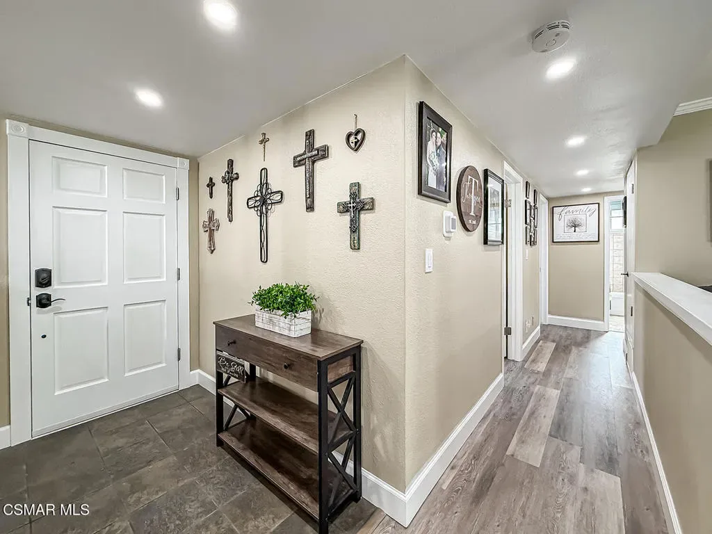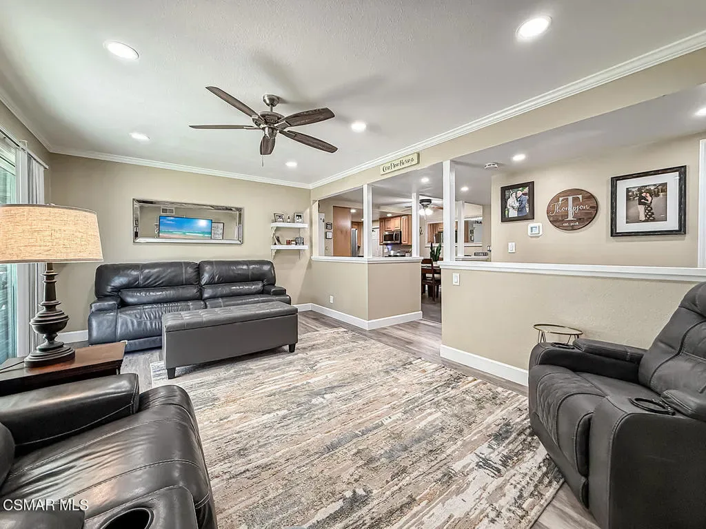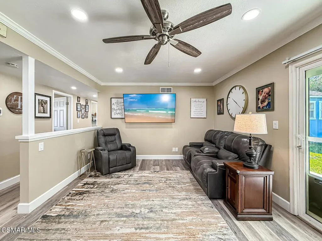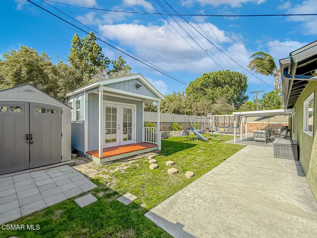 Welcome to this beautifully updated single-story home offering 4 bedrooms and 2 bathrooms with stylish upgrades and versatile living spaces throughout. Freshly painted and featuring laminate flooring across the entire home, the interior is enhanced with recessed lighting, ceiling fans, and newer windows with custom casing that add both comfort and modern character. The kitchen is equipped with stainless steel appliances and opens comfortably to the main living areas, creating an inviting space for everyday living and entertaining. Step outside and enjoy a thoughtfully designed outdoor setting. The fenced front patio provides a private entry and relaxing sitting area, complemented by a drought-tolerant front yard for low-maintenance landscaping. The backyard offers plenty of space to entertain and play, featuring stamped concrete patio areas, a grassy lawn, a covered patio, and even a basketball half court. A standout feature is the additional detached unit in the back–perfect for a home office, private gym, creative studio, or spa-style retreat. Exterior security cameras provide added peace of mind. Conveniently located close to shopping, dining, parks, and with easy freeway access, this home combines comfort, functionality, and lifestyle in one exceptional property.