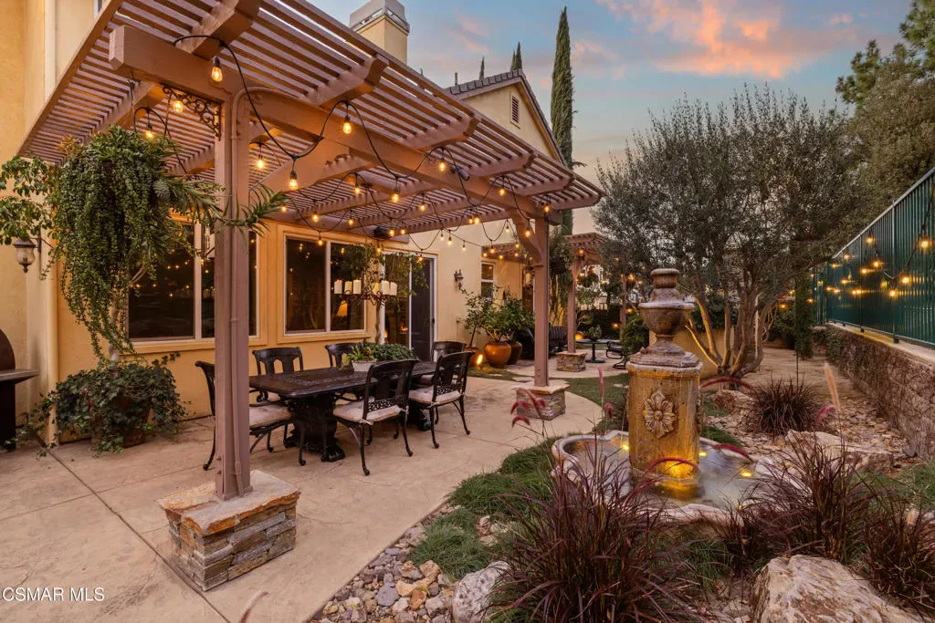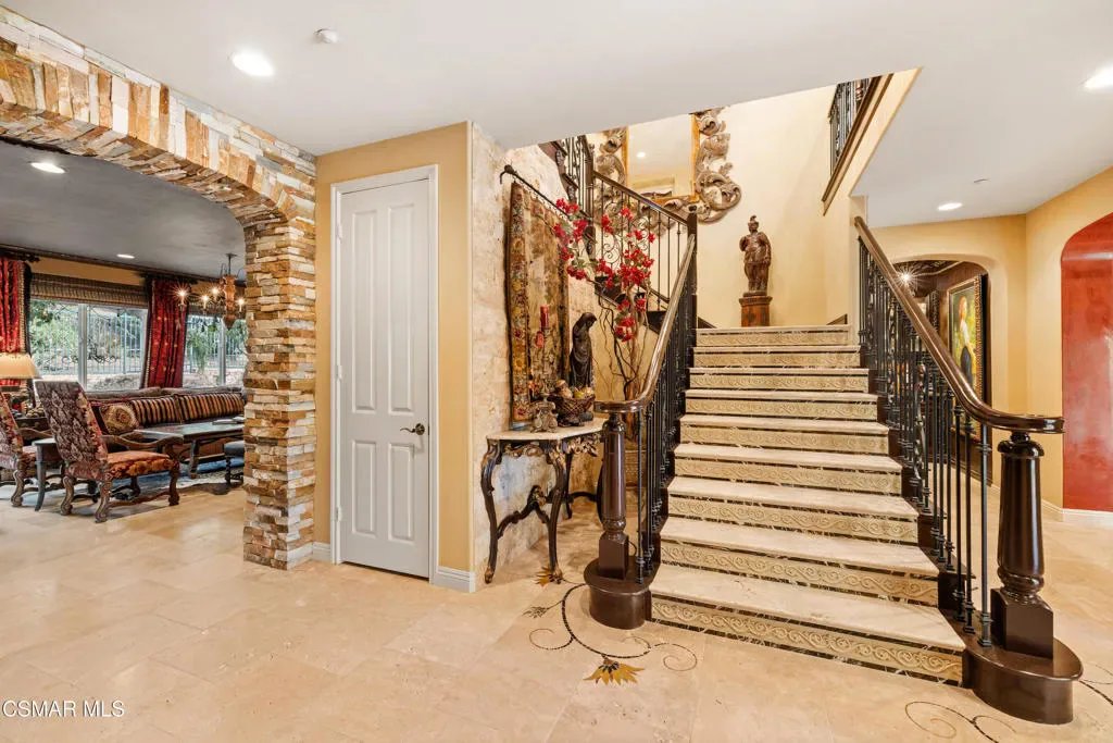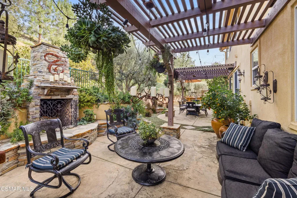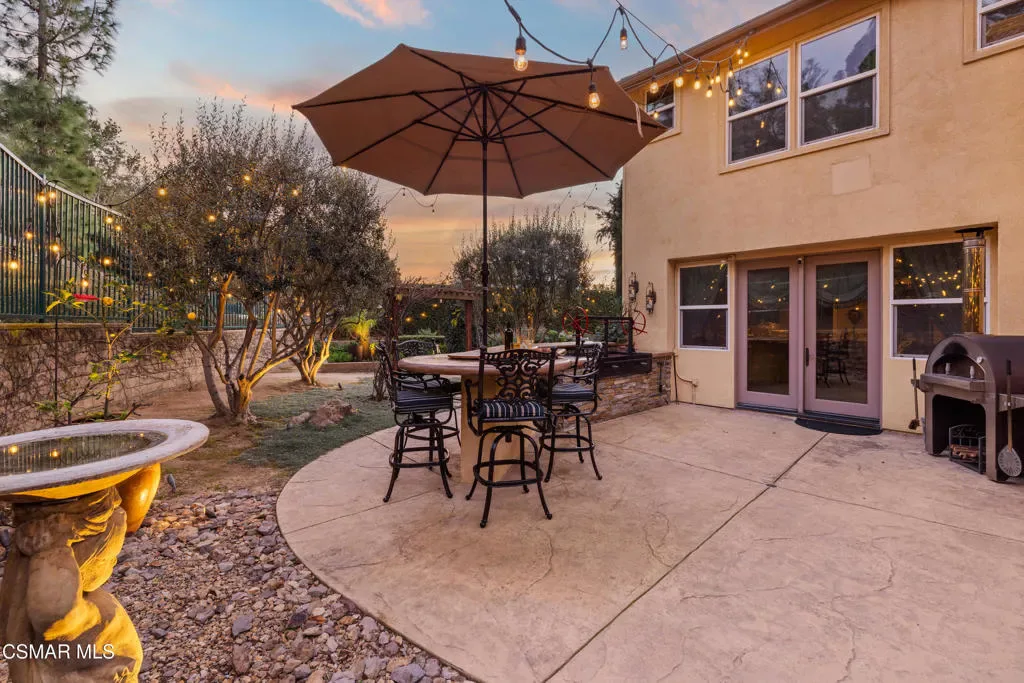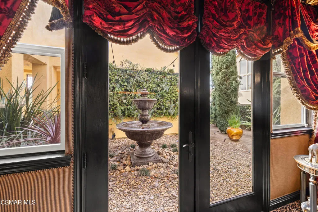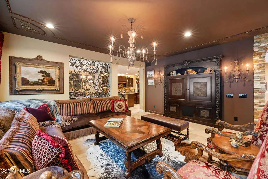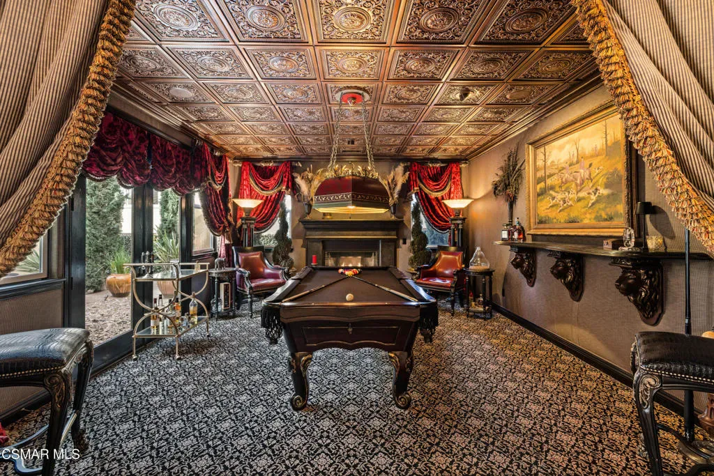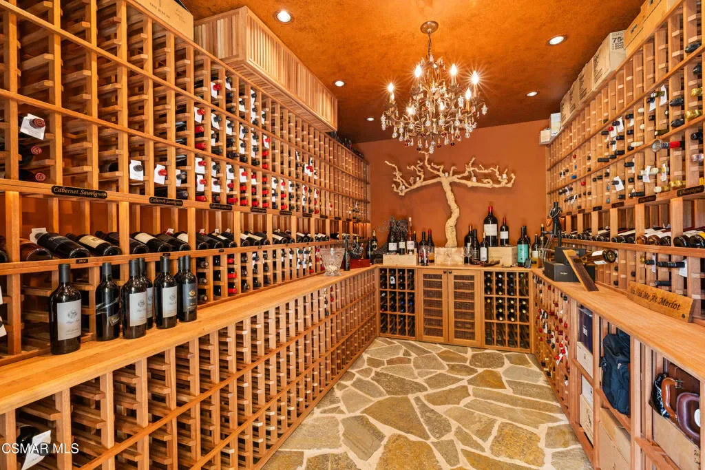 Nestled within the prestigious Big Sky community of Simi Valley, this extraordinary residence has been masterfully curated by professional designers to deliver a seamless blend of sophistication, comfort, and Southern California indoor-outdoor living.A private gated courtyard welcomes you with a stunning illuminated fountain — setting the tone for the elegance that unfolds within. Before stepping fully inside, discover a true showpiece: a 2,500-bottle walk-in wine cellar with custom lighting and precise temperature and humidity control — designed for the discerning collector.Inside, travertine marble floors with hand-inlaid mosaic details lead you through thoughtfully designed living spaces. The pub-style game room features a cozy fireplace, pool table, and French doors that open to the courtyard, creating an inviting space for entertaining. The formal dining room is equally impressive, showcasing a Venetian plaster ceiling, stacked stone accent wall, and French doors for effortless alfresco dinners.The gourmet kitchen is a chef’s dream, appointed with granite countertops, a center island with prep sink, and top-tier appliances including a Wolf 6-burner professional cooktop, Thermador double ovens, and a built-in Sub-Zero refrigerator. Rich dark wood cabinetry and a meticulously hand-cut tile backsplash complete the space. The kitchen flows seamlessly into a spacious breakfast area and a warm, inviting family room with fireplace, built-ins, surround sound, and French doors to the patio.A private downstairs guest suite offers elegant hand-painted walls, crown molding, and a beautifully appointed ensuite bath with custom herringbone travertine tile and walk-in shower.Ascending the dramatic travertine and wrought iron staircase, you’ll find a spacious loft-style office with rich wood paneling, custom coffered ceiling, and built-in bookcases. The expansive primary suite is a private retreat featuring hardwood floors, a marble fireplace, wood-paneled walls, and a dedicated sitting/theater room with padded walls, built-in media center, and surround sound. A fully enclosed 250 sq ft gym adds functionality and flexibility.The spa-inspired primary bath showcases custom inlaid flooring, a designer walk-in shower, dual vanities, and a stunning freestanding copper clawfoot tub. Dual custom walk-in closet areas complete the retreat. Two additional upstairs bedrooms feature bespoke wall treatments and ensuite baths with custom finishes.Whole-home audio is powered by a built-in Sonos sound system with individual room controls throughout key living spaces.Step outside to a backyard reminiscent of a Tuscan villa — complete with computer-controlled string lighting, a wood-burning fireplace, dual covered patios, and an entertainer’s dream outdoor kitchen featuring a built-in Santa Maria BBQ, wood-fired pizza oven, and Traeger smoker. Lush yet drought-conscious landscaping includes fruitless olive trees, raised garden beds, fountains, and a drip irrigation system — all designed for beauty and ease.Located in the highly sought-after Big Sky community, residents enjoy access to scenic walking and hiking trails, a dog park, softball fields, and breathtaking mountain views — all just minutes from everyday conveniences.This is more than a home — it is a lifestyle destination.