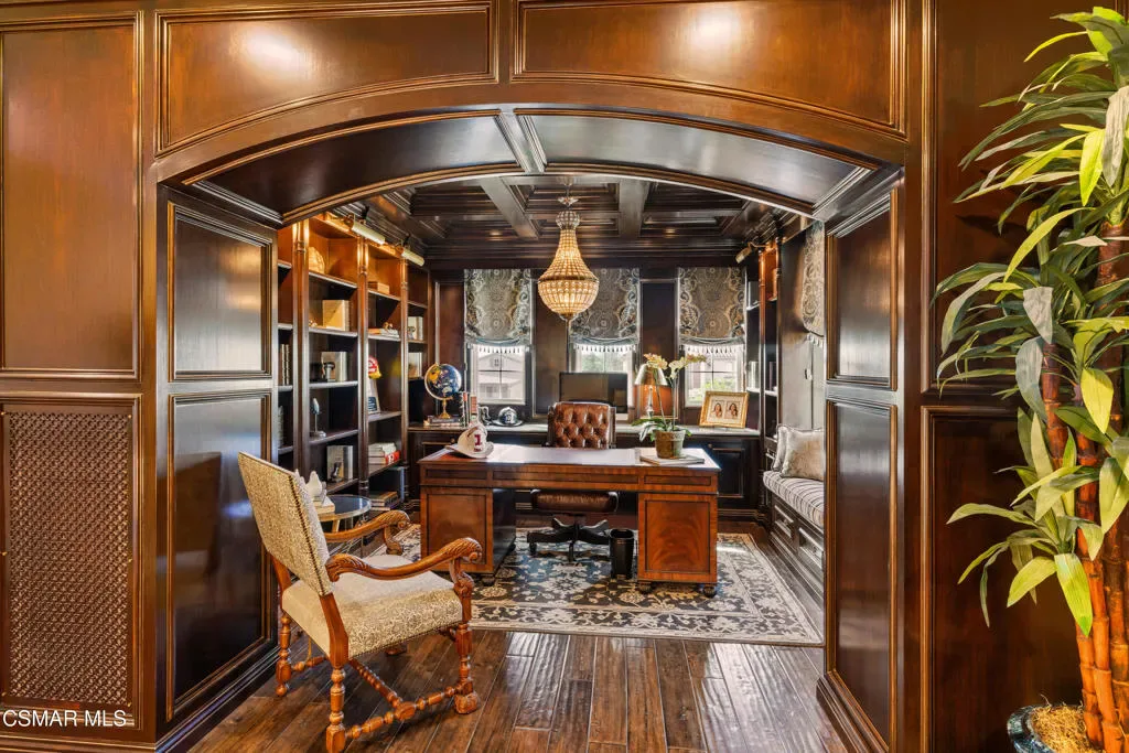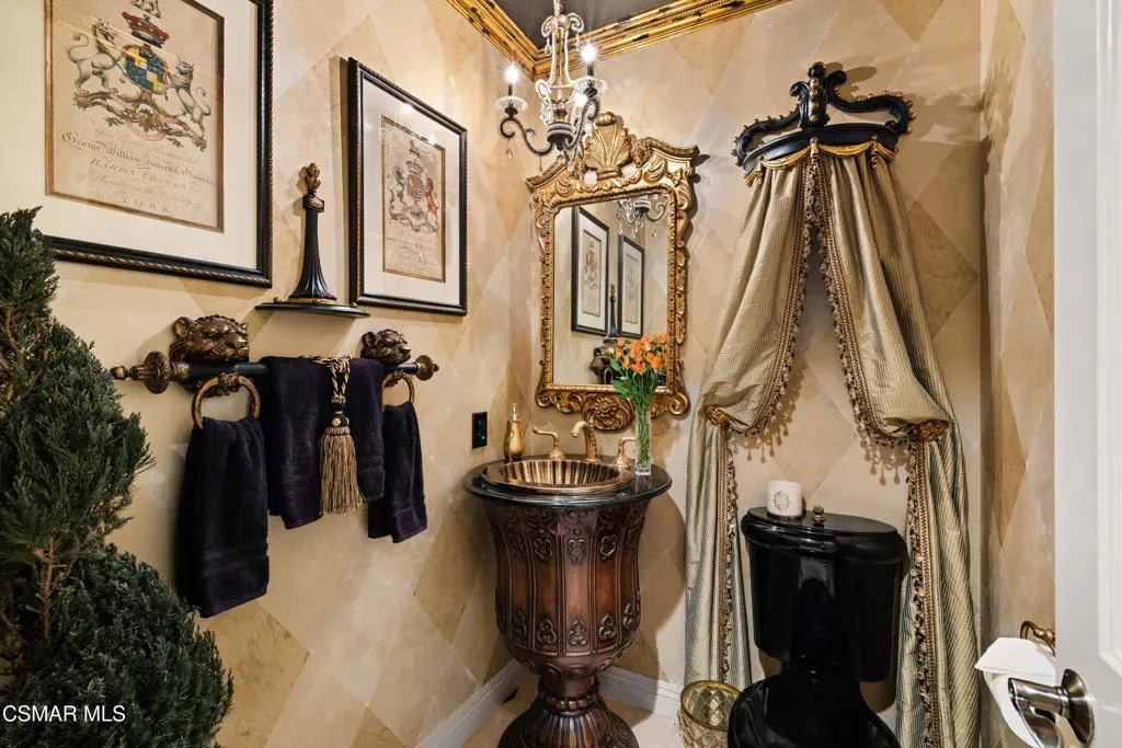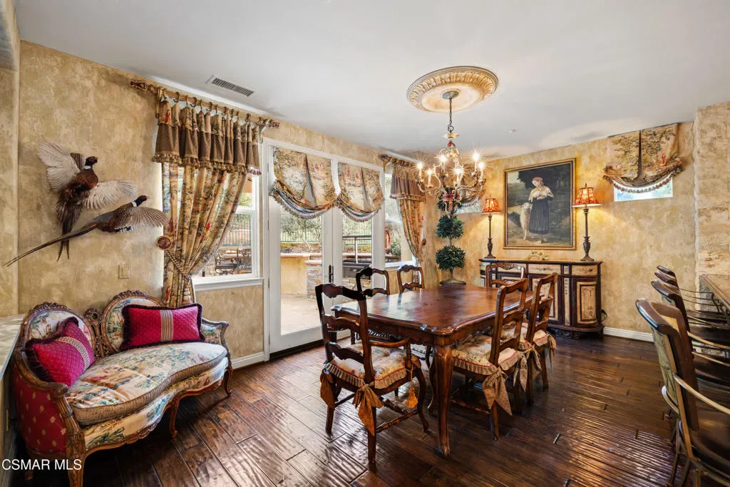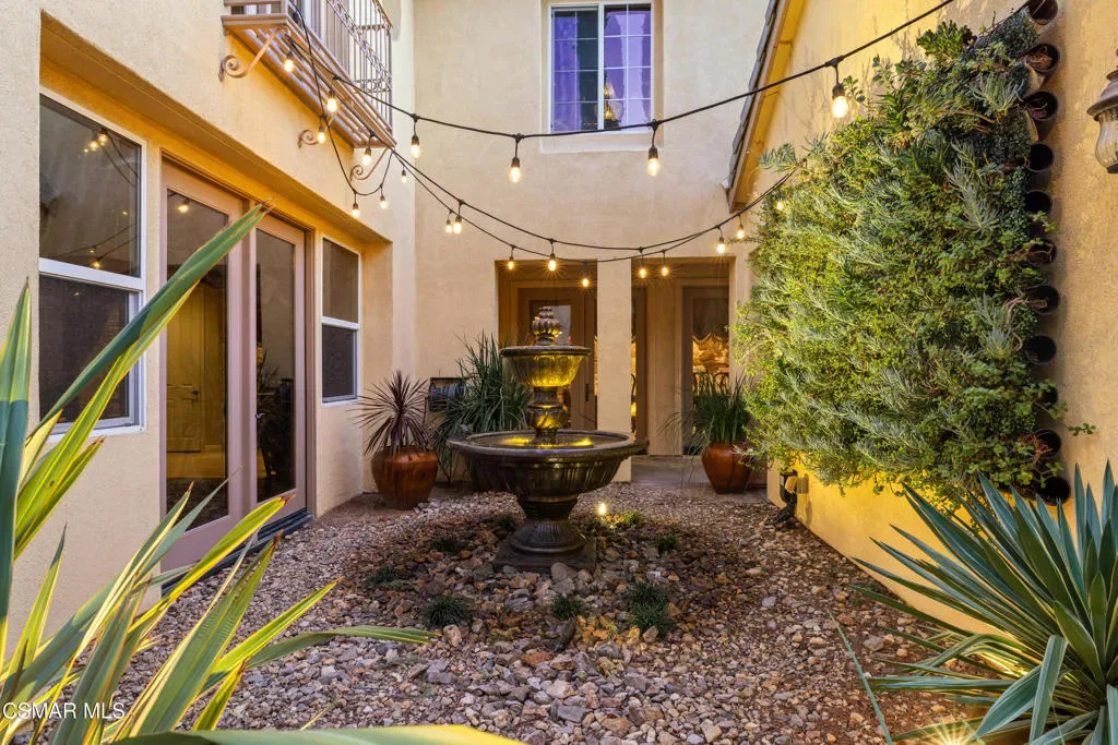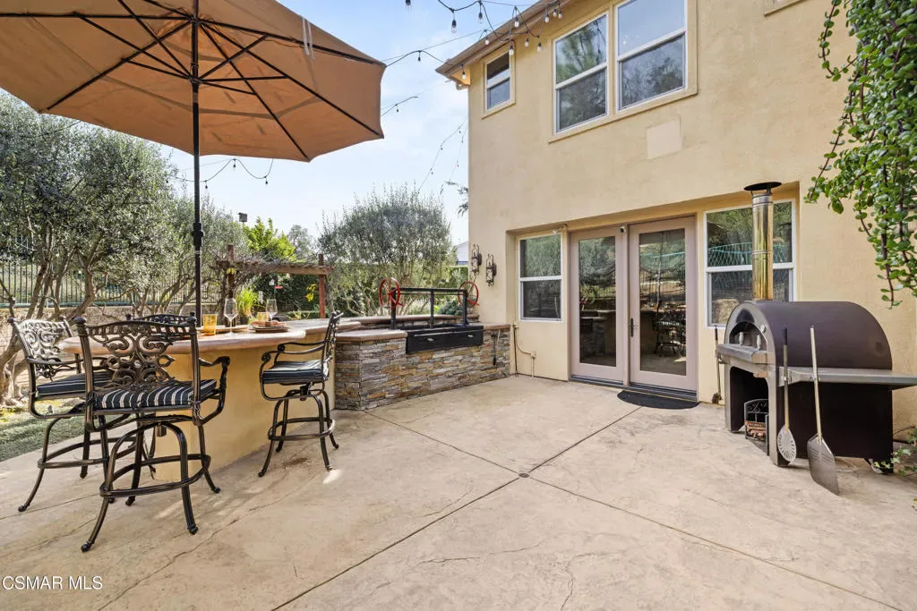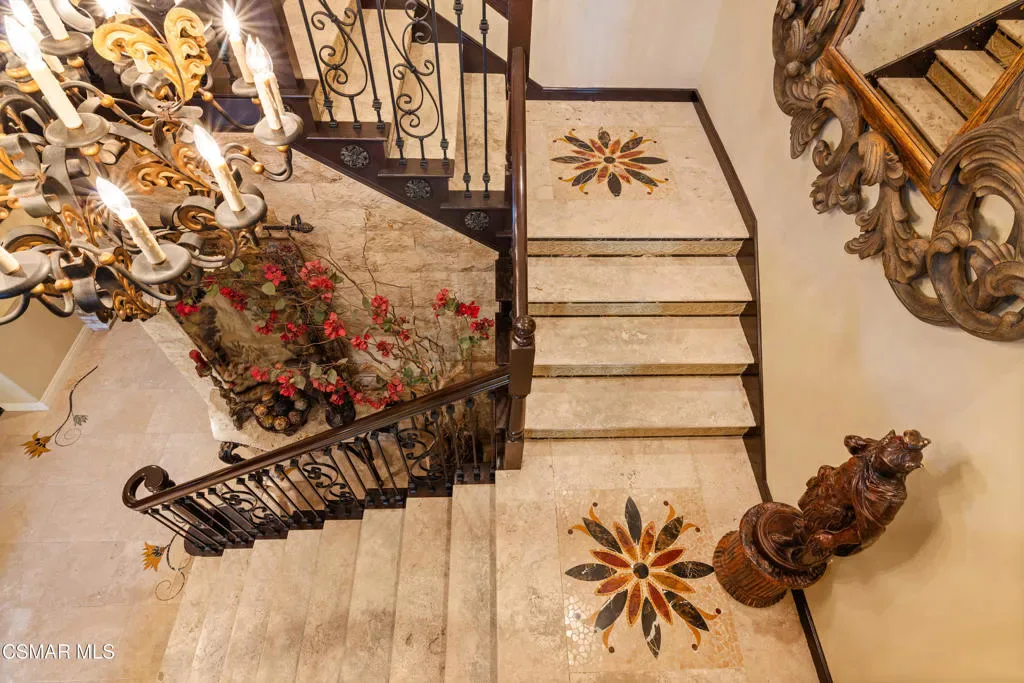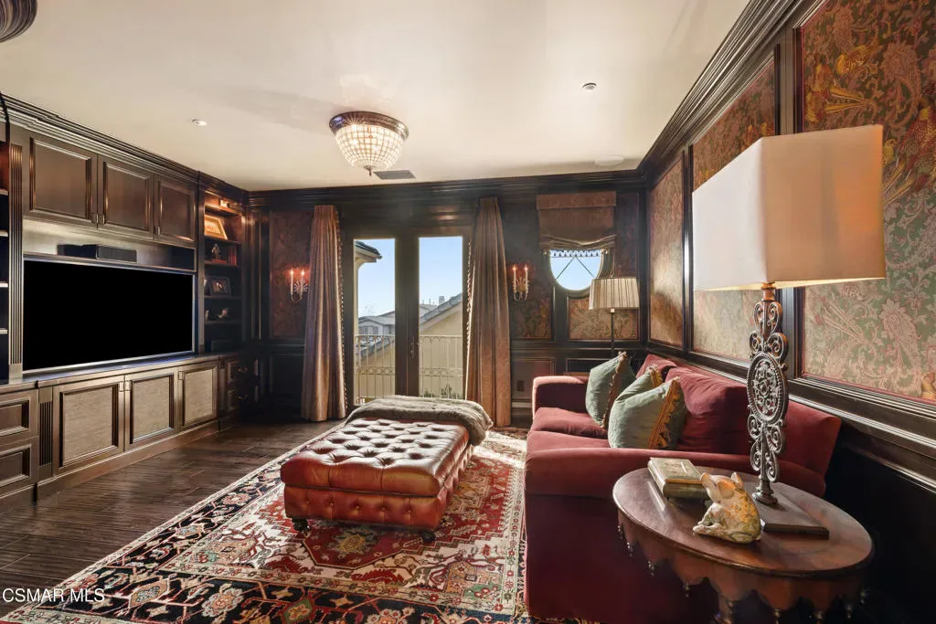 Nestled within the prestigious Big Sky community of Simi Valley, this extraordinary residence has been masterfully curated by professional designers to deliver a seamless blend of sophistication, comfort, and Southern California indoor-outdoor living.A private gated courtyard welcomes you with a stunning illuminated fountain — setting the tone for the elegance that unfolds within. Before stepping fully inside, discover a true showpiece: a 2,500-bottle walk-in wine cellar with custom lighting and precise temperature and humidity control — designed for the discerning collector.Inside, travertine marble floors with hand-inlaid mosaic details lead you through thoughtfully designed living spaces. The pub-style game room features a cozy fireplace, pool table, and French doors that open to the courtyard, creating an inviting space for entertaining. The formal dining room is equally impressive, showcasing a Venetian plaster ceiling, stacked stone accent wall, and French doors for effortless alfresco dinners.The gourmet kitchen is a chef’s dream, appointed with granite countertops, a center island with prep sink, and top-tier appliances including a Wolf 6-burner professional cooktop, Thermador double ovens, and a built-in Sub-Zero refrigerator. Rich dark wood cabinetry and a meticulously hand-cut tile backsplash complete the space. The kitchen flows seamlessly into a spacious breakfast area and a warm, inviting family room with fireplace, built-ins, surround sound, and French doors to the patio.A private downstairs guest suite offers elegant hand-painted walls, crown molding, and a beautifully appointed ensuite bath with custom herringbone travertine tile and walk-in shower.Ascending the dramatic travertine and wrought iron staircase, you’ll find a spacious loft-style office with rich wood paneling, custom coffered ceiling, and built-in bookcases. The expansive primary suite is a private retreat featuring hardwood floors, a marble fireplace, wood-paneled walls, and a dedicated sitting/theater room with padded walls, built-in media center, and surround sound. A fully enclosed 250 sq ft gym adds functionality and flexibility.The spa-inspired primary bath showcases custom inlaid flooring, a designer walk-in shower, dual vanities, and a stunning freestanding copper clawfoot tub. Dual custom walk-in closet areas complete the retreat. Two additional upstairs bedrooms feature bespoke wall treatments and ensuite baths with custom finishes.Whole-home audio is powered by a built-in Sonos sound system with individual room controls throughout key living spaces.Step outside to a backyard reminiscent of a Tuscan villa — complete with computer-controlled string lighting, a wood-burning fireplace, dual covered patios, and an entertainer’s dream outdoor kitchen featuring a built-in Santa Maria BBQ, wood-fired pizza oven, and Traeger smoker. Lush yet drought-conscious landscaping includes fruitless olive trees, raised garden beds, fountains, and a drip irrigation system — all designed for beauty and ease.Located in the highly sought-after Big Sky community, residents enjoy access to scenic walking and hiking trails, a dog park, softball fields, and breathtaking mountain views — all just minutes from everyday conveniences.This is more than a home — it is a lifestyle destination.