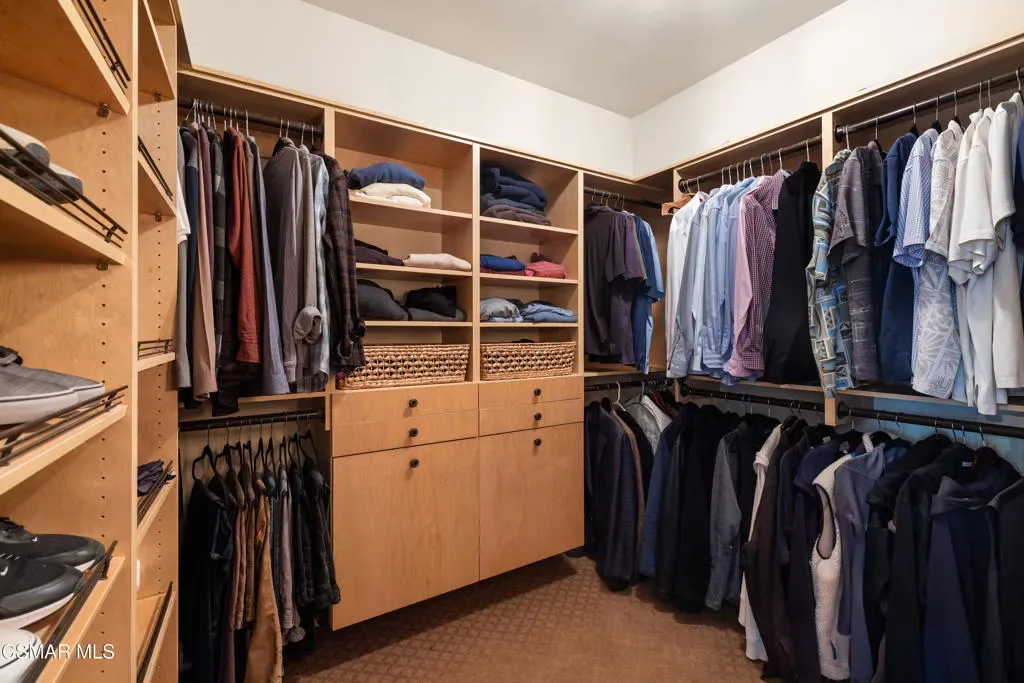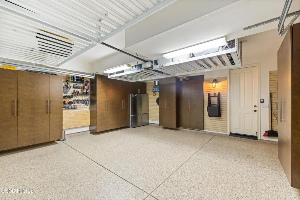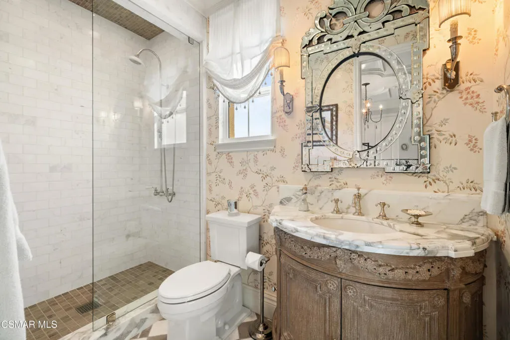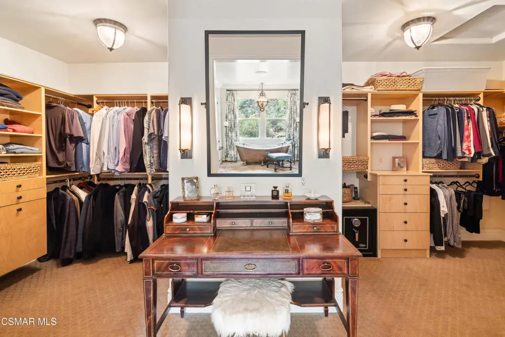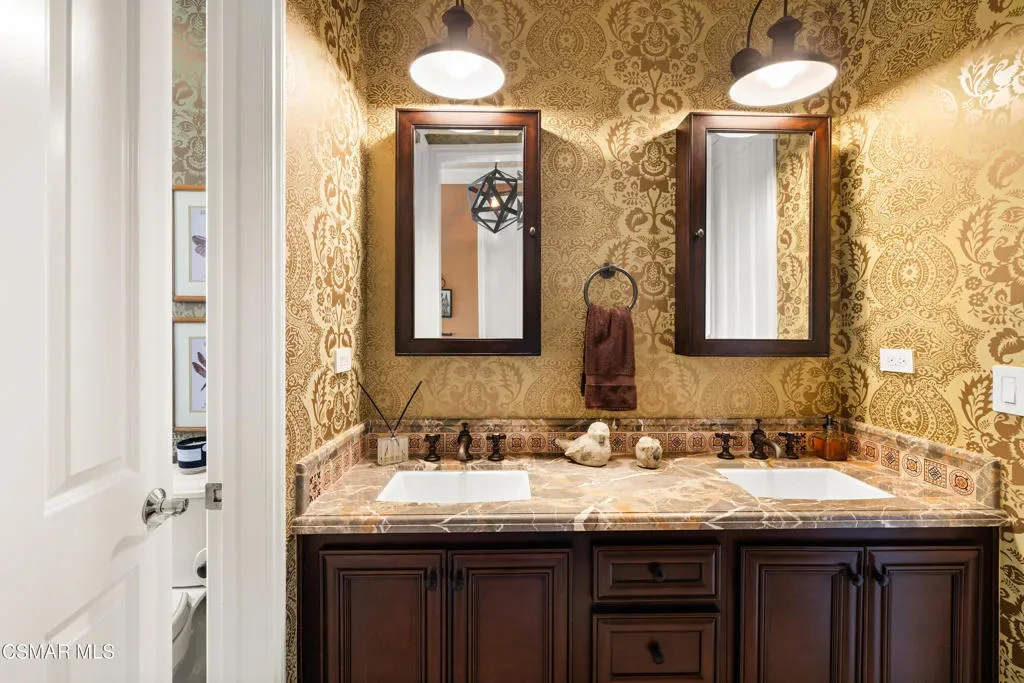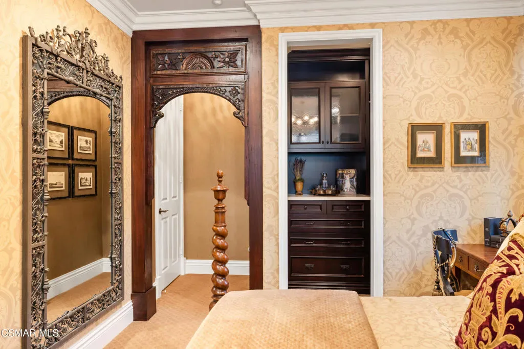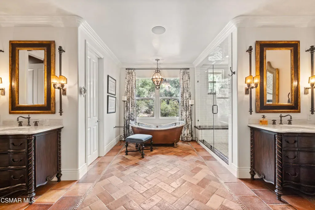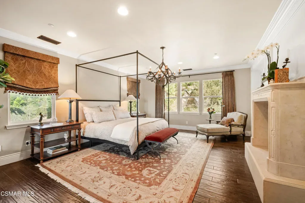 Nestled within the prestigious Big Sky community of Simi Valley, this extraordinary residence has been masterfully curated by professional designers to deliver a seamless blend of sophistication, comfort, and Southern California indoor-outdoor living.A private gated courtyard welcomes you with a stunning illuminated fountain — setting the tone for the elegance that unfolds within. Before stepping fully inside, discover a true showpiece: a 2,500-bottle walk-in wine cellar with custom lighting and precise temperature and humidity control — designed for the discerning collector.Inside, travertine marble floors with hand-inlaid mosaic details lead you through thoughtfully designed living spaces. The pub-style game room features a cozy fireplace, pool table, and French doors that open to the courtyard, creating an inviting space for entertaining. The formal dining room is equally impressive, showcasing a Venetian plaster ceiling, stacked stone accent wall, and French doors for effortless alfresco dinners.The gourmet kitchen is a chef’s dream, appointed with granite countertops, a center island with prep sink, and top-tier appliances including a Wolf 6-burner professional cooktop, Thermador double ovens, and a built-in Sub-Zero refrigerator. Rich dark wood cabinetry and a meticulously hand-cut tile backsplash complete the space. The kitchen flows seamlessly into a spacious breakfast area and a warm, inviting family room with fireplace, built-ins, surround sound, and French doors to the patio.A private downstairs guest suite offers elegant hand-painted walls, crown molding, and a beautifully appointed ensuite bath with custom herringbone travertine tile and walk-in shower.Ascending the dramatic travertine and wrought iron staircase, you’ll find a spacious loft-style office with rich wood paneling, custom coffered ceiling, and built-in bookcases. The expansive primary suite is a private retreat featuring hardwood floors, a marble fireplace, wood-paneled walls, and a dedicated sitting/theater room with padded walls, built-in media center, and surround sound. A fully enclosed 250 sq ft gym adds functionality and flexibility.The spa-inspired primary bath showcases custom inlaid flooring, a designer walk-in shower, dual vanities, and a stunning freestanding copper clawfoot tub. Dual custom walk-in closet areas complete the retreat. Two additional upstairs bedrooms feature bespoke wall treatments and ensuite baths with custom finishes.Whole-home audio is powered by a built-in Sonos sound system with individual room controls throughout key living spaces.Step outside to a backyard reminiscent of a Tuscan villa — complete with computer-controlled string lighting, a wood-burning fireplace, dual covered patios, and an entertainer’s dream outdoor kitchen featuring a built-in Santa Maria BBQ, wood-fired pizza oven, and Traeger smoker. Lush yet drought-conscious landscaping includes fruitless olive trees, raised garden beds, fountains, and a drip irrigation system — all designed for beauty and ease.Located in the highly sought-after Big Sky community, residents enjoy access to scenic walking and hiking trails, a dog park, softball fields, and breathtaking mountain views — all just minutes from everyday conveniences.This is more than a home — it is a lifestyle destination.