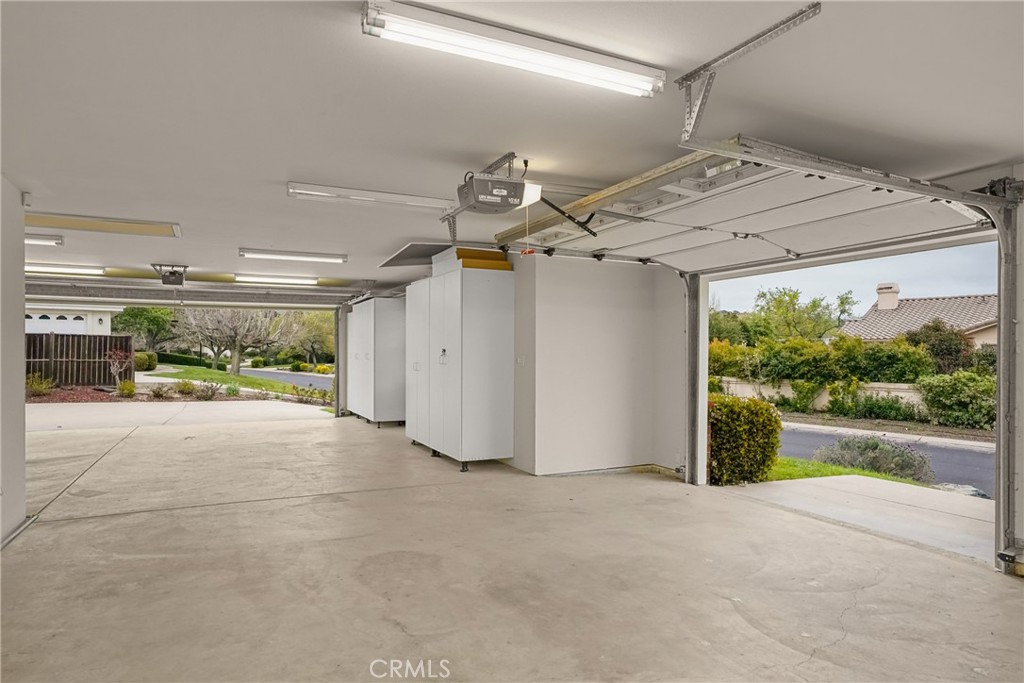 An oversized three-car garage with workshop space and side entry for a golf cart or small vehicle adds exceptional convenience and functionality.
