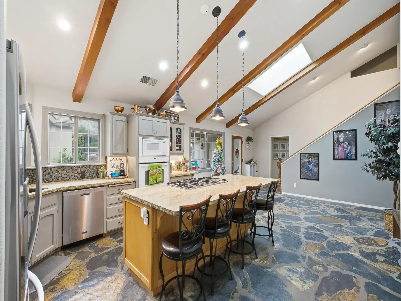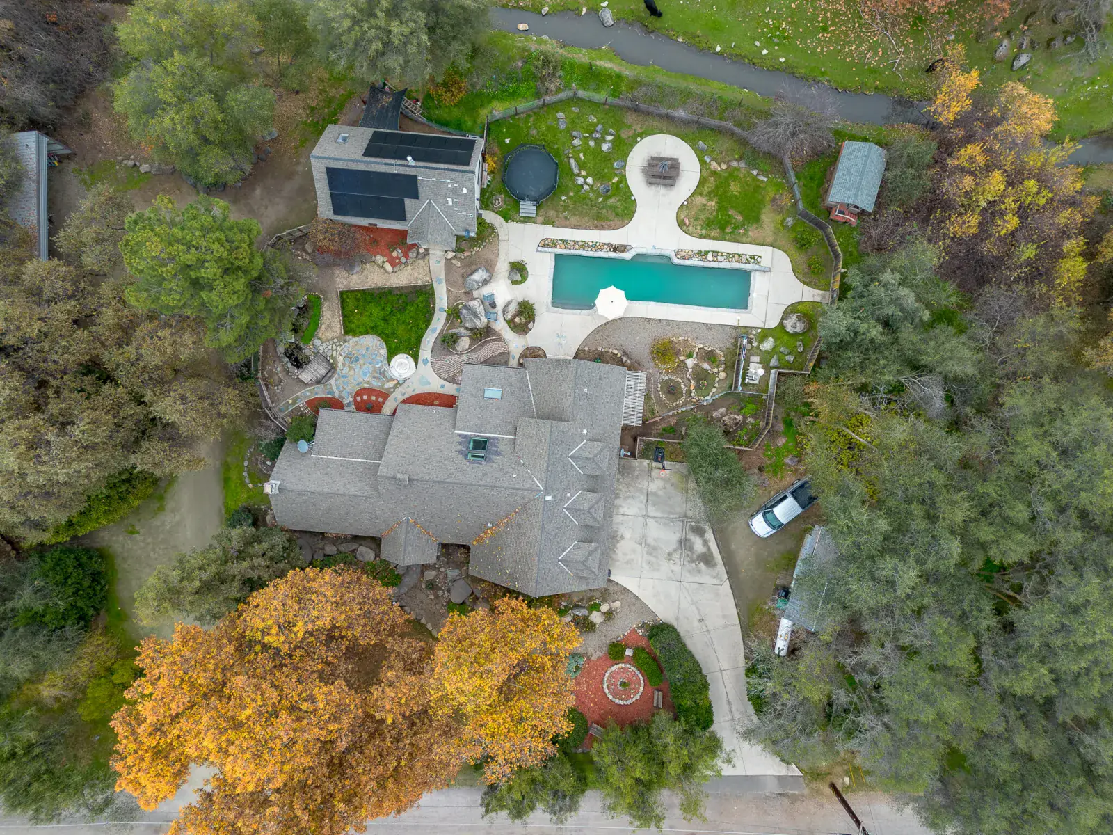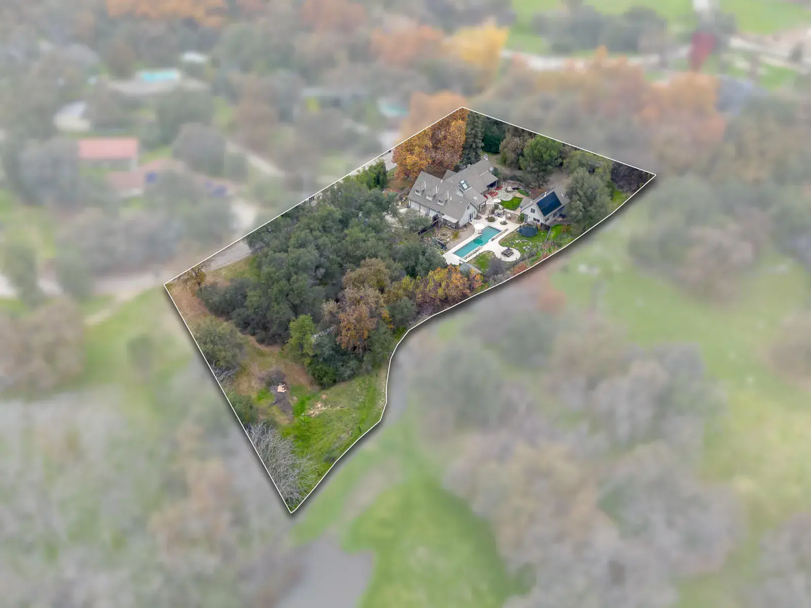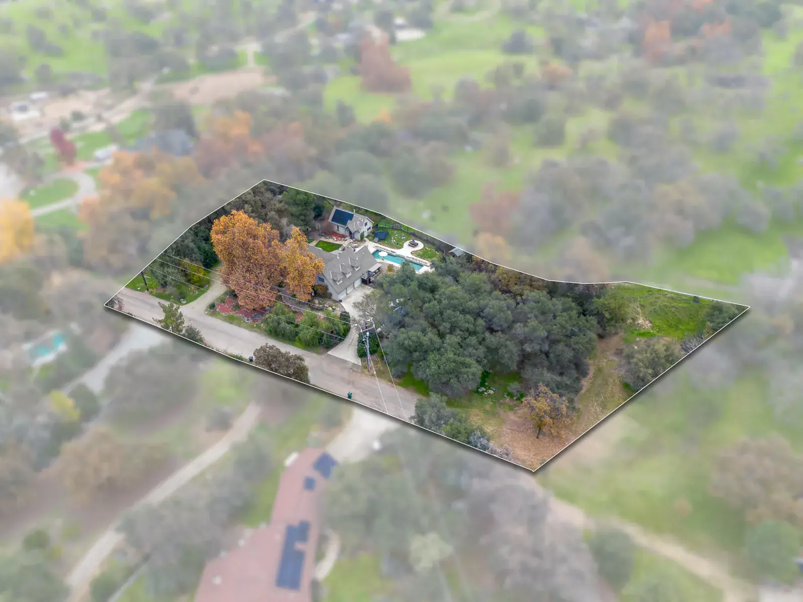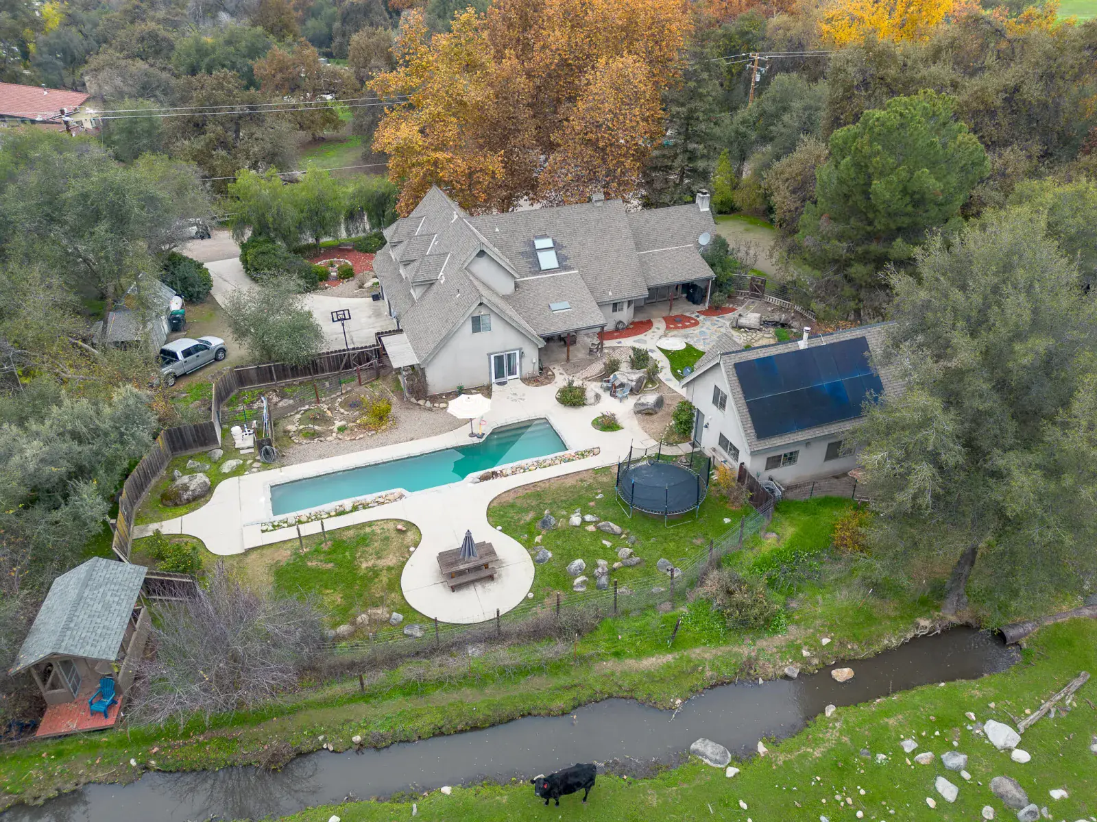 Nestled along an oak tree-lined private drive, this home sits on approximately 2 acres offering plenty of space, privacy, and versatility. Inside, you’ll find a warm and inviting living room with vaulted beamed ceilings, stone fireplace, built-ins, and beautiful natural light filtering through the French doors. The kitchen features vaulted ceilings with exposed beams, a skylight, a large island/breakfast bar with stunning raw-edge granite counters, and space for a casual dining area, with a separate formal dining room nearby. The primary suite offers peaceful views of the backyard along with dual sinks, soaking tub, shower, and two walk-in closets. Upstairs, you’ll find two additional bedrooms connected by a Jack-and-Jill bathroom — with one of the bedrooms featuring an attached bonus room with built-in desks, making it perfect for a study, craft space, or home office setup. A laundry/mud room, 3-car garage, and upstairs computer niche add everyday convenience, while the covered carport with RV clearance and storage shed provide even more functionality. Outdoors, you’ll also enjoy the pond, natural gardens, spa, and 50′ lap pool, along with several mature fruit trees including orange, lime, peach, apple, and plum, creating a setting that feels serene, private, and incredibly special. The true standout of the property is the detached 1,038 sq ft residence, ideal as a guest house, Airbnb, multi-generational living, or more.