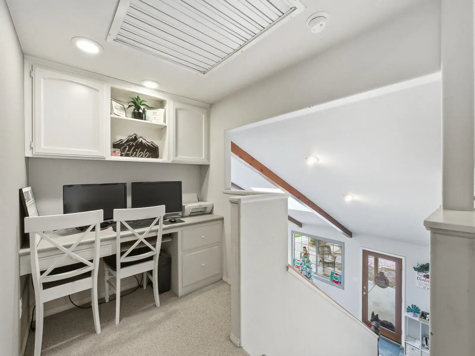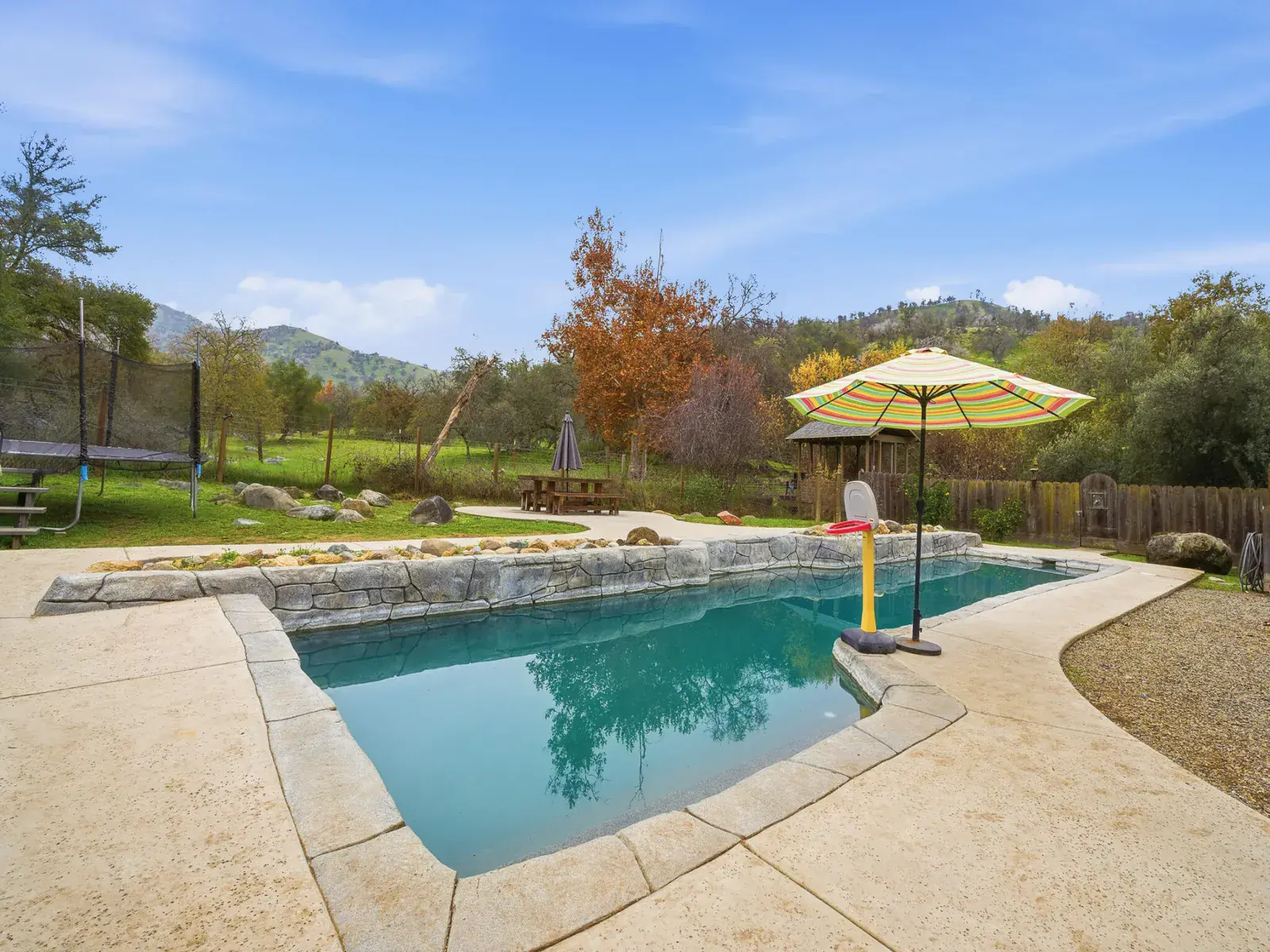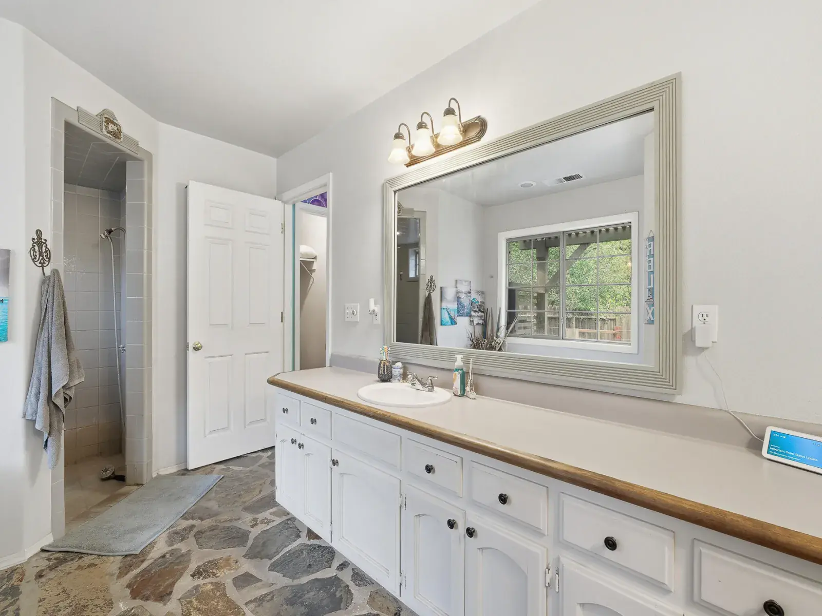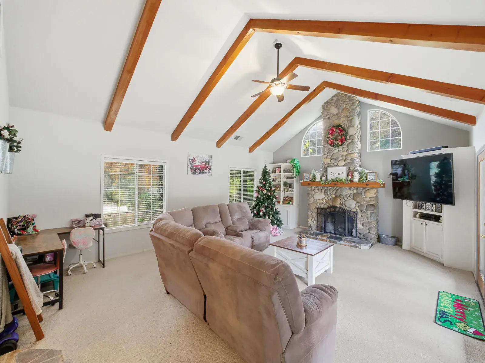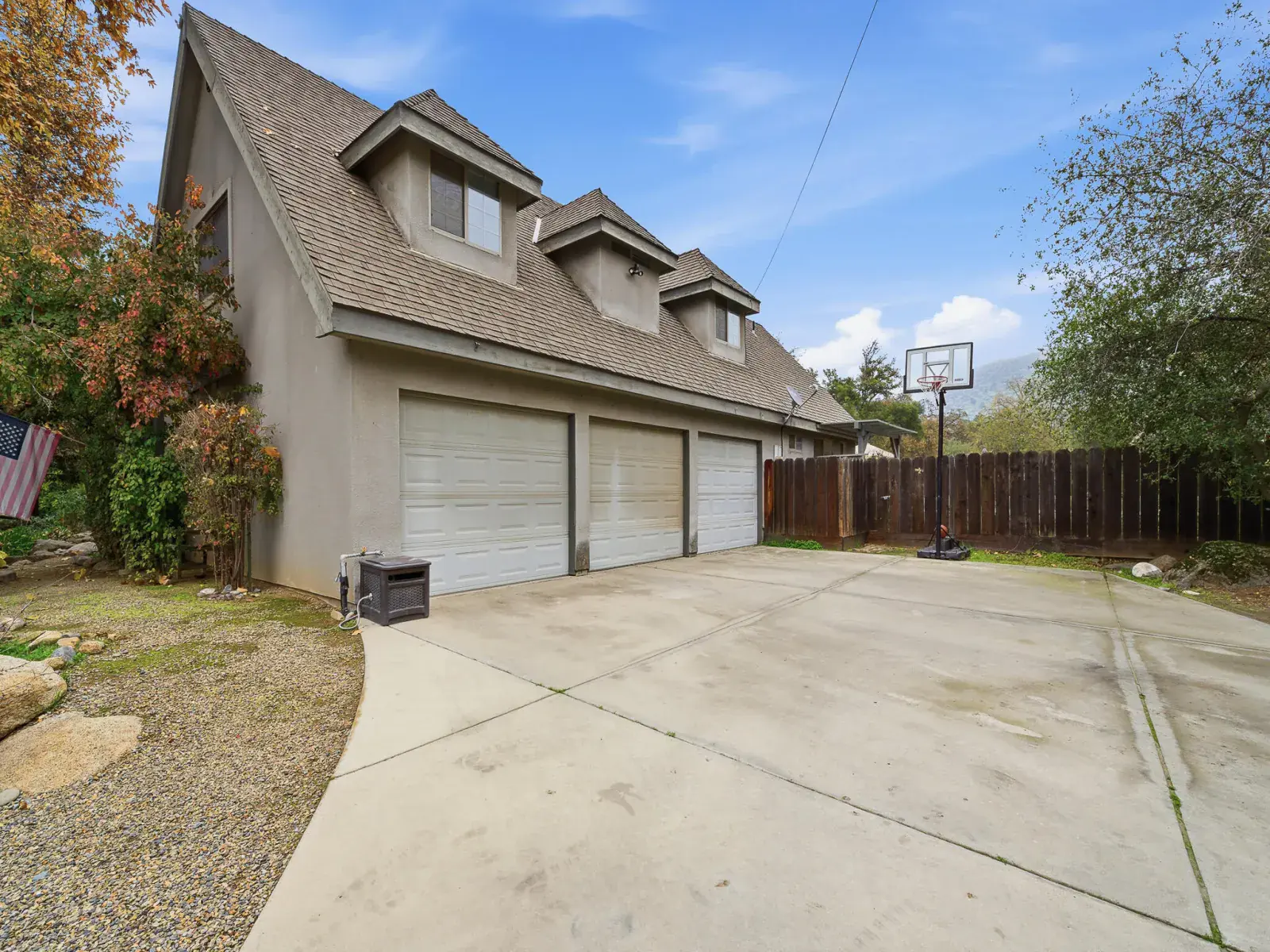 Nestled along an oak tree-lined private drive, this home sits on approximately 2 acres offering plenty of space, privacy, and versatility. Inside, you’ll find a warm and inviting living room with vaulted beamed ceilings, stone fireplace, built-ins, and beautiful natural light filtering through the French doors. The kitchen features vaulted ceilings with exposed beams, a skylight, a large island/breakfast bar with stunning raw-edge granite counters, and space for a casual dining area, with a separate formal dining room nearby. The primary suite offers peaceful views of the backyard along with dual sinks, soaking tub, shower, and two walk-in closets. Upstairs, you’ll find two additional bedrooms connected by a Jack-and-Jill bathroom — with one of the bedrooms featuring an attached bonus room with built-in desks, making it perfect for a study, craft space, or home office setup. A laundry/mud room, 3-car garage, and upstairs computer niche add everyday convenience, while the covered carport with RV clearance and storage shed provide even more functionality. Outdoors, you’ll also enjoy the pond, natural gardens, spa, and 50′ lap pool, along with several mature fruit trees including orange, lime, peach, apple, and plum, creating a setting that feels serene, private, and incredibly special. The true standout of the property is the detached 1,038 sq ft residence, ideal as a guest house, Airbnb, multi-generational living, or more.