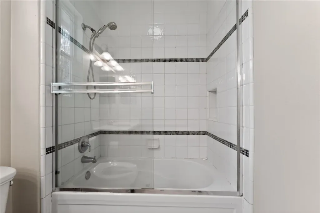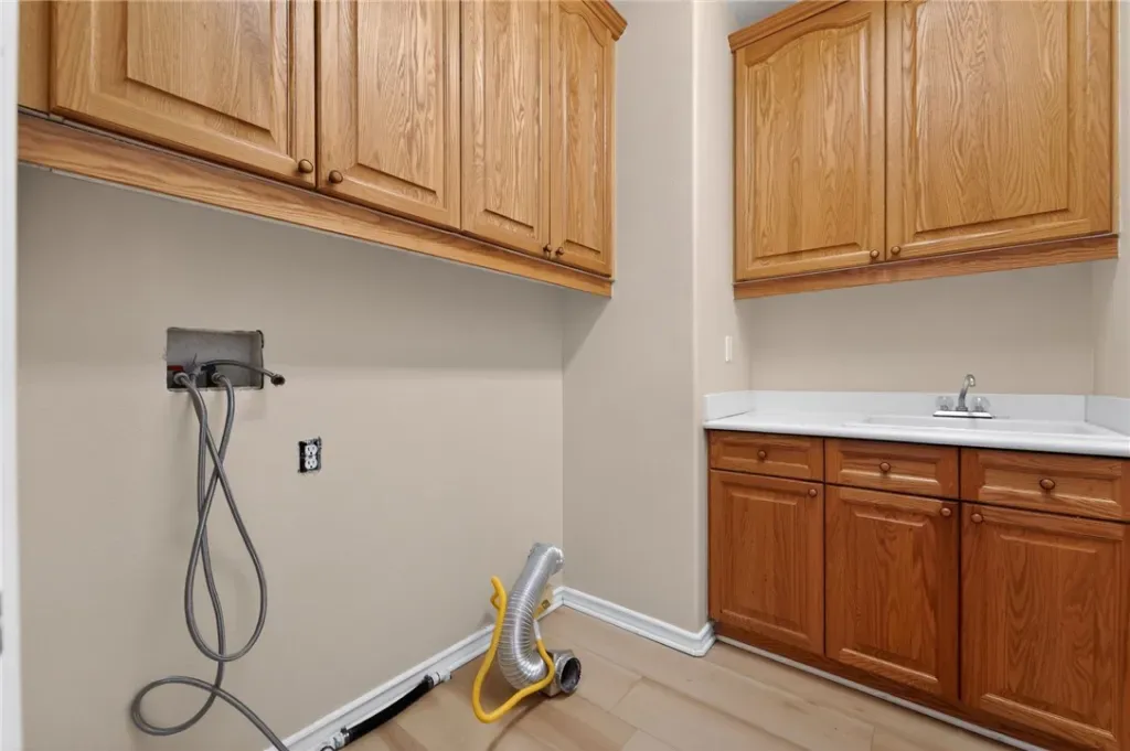 The 3-car garage (two tandem) has built-in storage cabinets and shelves.