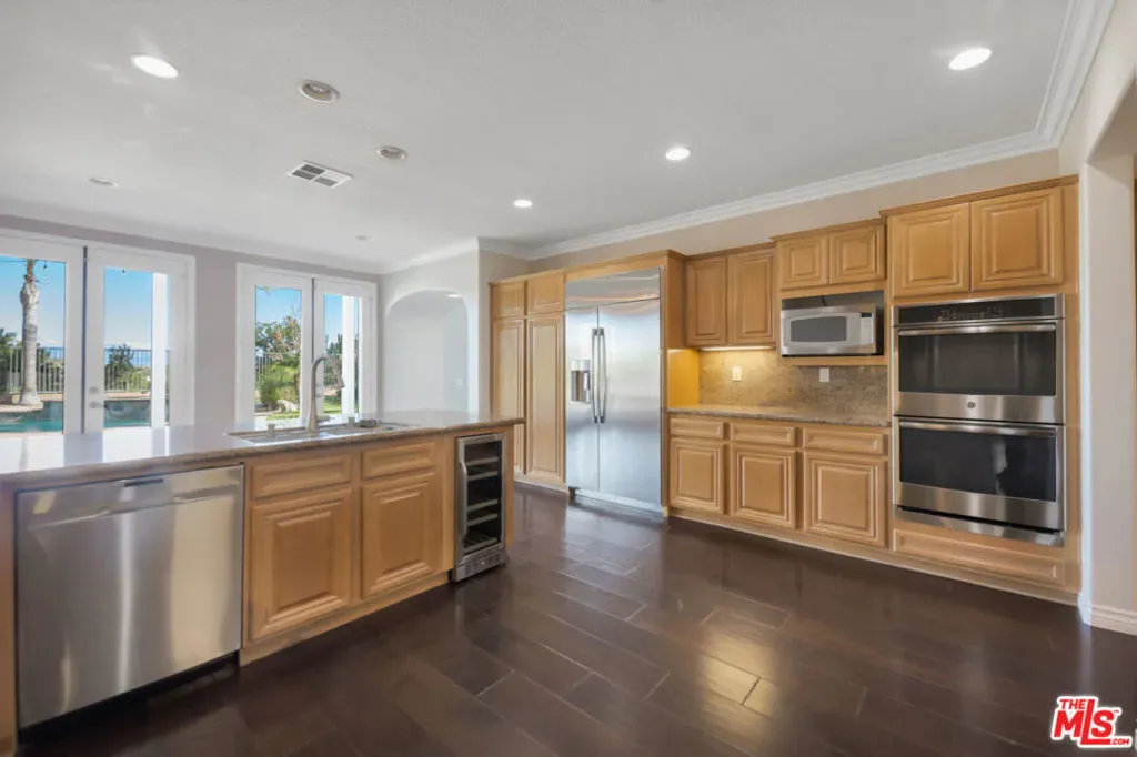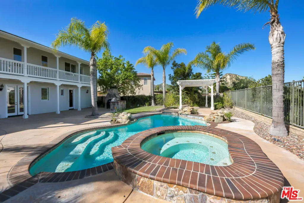 Perched above the Santa Clarita Valley, this exceptional Southern Oaks Executive Estate is now offered at $1,849,000, presenting a compelling opportunity within one of Stevenson Ranch’s most sought-after communities and zoned for the highly rated West Ranch High School. This expansive 5-bedroom, 5-bath residence showcases sweeping panoramic mountain and valley views from multiple vantage points, blending scale, functionality, and architectural presence. Designed for refined California living, the backyard is a true entertainer’s retreat featuring a sparkling pool and spa, a fully built-in BBQ center with refrigerator, sink, and bar seating, and a charming gazebo ideal for shaded lounging or outdoor dining. Multiple gathering areas capture breathtaking sunset views across the valley. A rare architectural highlight is the pair of second-story balconies at both the front and rear of the home, offering elevated outdoor living spaces and unobstructed panoramic vistas that truly distinguish the property. Inside, a grand entry opens to a light-filled interior with soaring ceilings and a thoughtfully designed layout ideal for both everyday living and large-scale entertaining. The main level features a formal living room, formal dining room, spacious family room, separate game room, dedicated office area, and a private junior suite with full bath offering exceptional flexibility for guests, multigenerational living, or executive work-from-home needs. The kitchen serves as the heart of the home, complete with abundant cabinetry, generous counter space, a large center island with breakfast bar seating, double ovens, stainless steel, the luxurious primary suite is a true retreat, featuring its own private balcony, fireplace, sweeping valley views, a spa-inspired bath with soaking tub, separate shower, dual vanities, and dual walk-in closets. Three additional bedrooms include a Jack-and-Jill configuration, along with a convenient upstairs laundry room with sink and storage. Additional highlights include a 2-car tandem garage and no Mello Roos. Ideally located near shopping, dining, parks, and commuter access, this home offers a rare combination of lifestyle, location, and long-term value. Now strategically positioned for today’s market, this is a unique opportunity to secure a premier view estate in Stevenson Ranch.