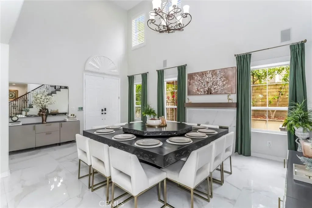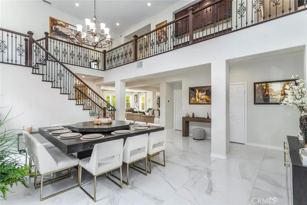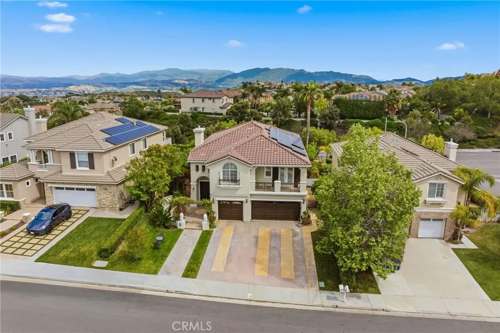 Welcome to this stunning Executive Pool Home, ideally situated at the end of a beautiful cul-de-sac in upper Stevenson Ranch in the highly desired Twilight Vista tract. From the moment you arrive, the home makes a lasting impression with exceptional curb appeal, highlighted by a private courtyard with professional landscaping and tranquil fountains. Through the grand double doors you will find a breathtaking formal entry, where soaring ceilings and a dramatic wrought-iron staircase create a striking focal point. Rich marble-inspired 20” x 20” tile flooring spans the lower level, while the upper level is beautifully finished with warm wood flooring, creating a cohesive blend of elegance and comfort throughout. Spanning nearly 3600 sq ft, the expansive floor plan features 5 bedrooms, 5 baths, a huge great room, formal dining, office nook and upstairs laundry. The expanded great room includes modern wood slat wall detail, ambiance lighting and tons of windows filling the space with natural light. At the center of it all, the newly updated kitchen impresses with an oversized center island, white shaker cabinetry, gorgeous granite counters, walk in pantry, stainless appliances, and modern hardware. The space opens seamlessly to the inviting great room perfect for hosting large gatherings. The main level also features a generously sized bedroom and a private full bath, ideal for guests, multigenerational living, or a home office. Upstairs, the primary suite offers a true retreat, complete with a private balcony capturing sweeping views of Stevenson Ranch and the surrounding mountains. Thoughtfully re-designed with a huge walk in closet with custom built ins and a spa-inspired bath featuring a soaking tub and oversized walk-in shower. The upper level also includes 3 additional well appointed bedrooms, and a versatile flex space ideal for an office. The backyard is designed for both relaxation and entertaining, featuring a newer pool and spa, lush landscaping, and expansive patio spaces perfectly positioned to take in the surrounding views. Additional highlights include plantation shutters, surround sound, enhanced security, solar, Tesla charging station, newer interior and exterior paint, new HVAC systems, tankless water heater, new windows (downstairs) and a 3 car attached garage. Enjoy the benefit of a low HOA, no mello-roos and access to highly acclaimed award winning schools. Close to shopping, restaurants, gorgeous parks and easy access to the 5 freeway.