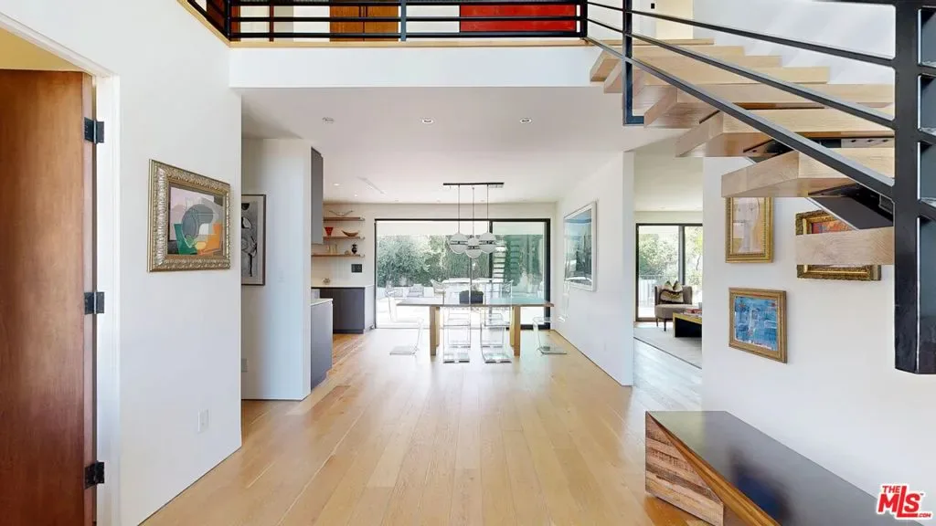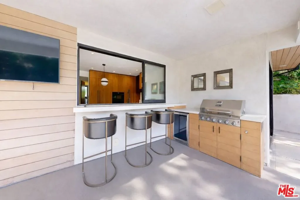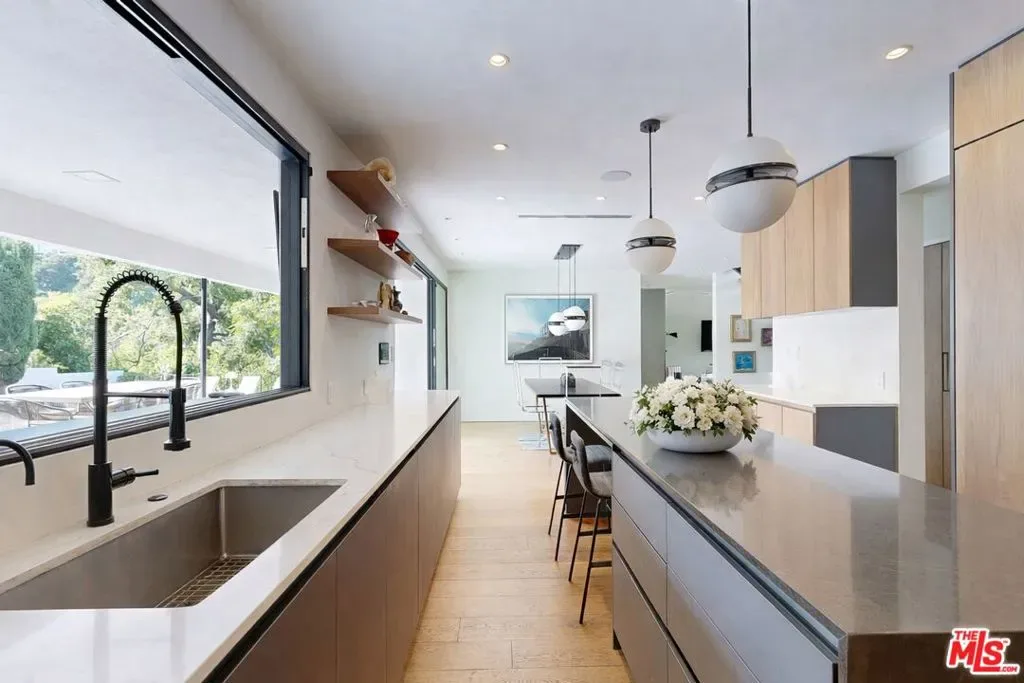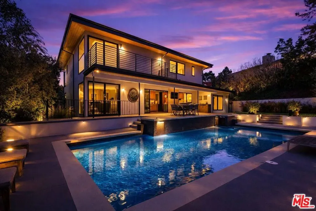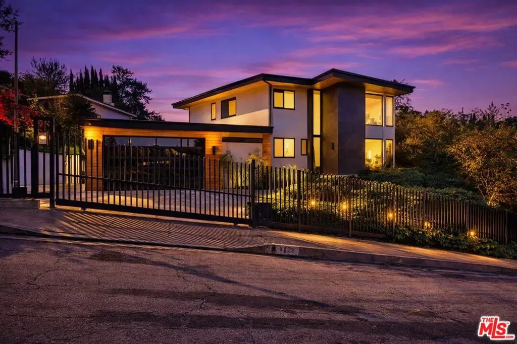 Perched atop a knoll on one of the most sought-after streets in the Donas, one of Studio City’s most prestigious neighborhoods, this newly renovated contemporary residence captures sweeping panoramic views across the Mulholland Corridor from nearly every room, seamlessly blending timeless Mid-Century design with elevated modern finishes across approximately 3,900 square feet of gated, private living space. A striking entry opens to soaring ceilings and walls of glass that flood the interiors with natural light, flowing effortlessly into expansive living areas including a refined formal living room, a warm and inviting family room with bar and fireplace, and an elegant dining room set just off the sleek, designer kitchen outfitted with high-end appliances. A dramatic glass-filled atrium with approximately 30-foot ceilings serves as a stunning architectural centerpiece, enhancing the home’s sense of scale and openness. The main level also offers a versatile en-suite bedroom, ideal for guests, a home office, or staff quarters. Upstairs, the spacious primary suite is a true retreat, featuring dual walk-in closets, a spa-inspired bath with refined finishes, a private balcony, and a sitting area with breathtaking views, while additional bedrooms are generously sized and appointed with en-suite baths and custom-fitted closets. Designed for seamless indoor-outdoor living, retractable windows and Fleetwood sliding doors open to an expansive entertainer’s yard with a large terrace for al fresco dining, a sparkling pool, cabana, and built-in barbecue. Ideally located just moments from the Westside, Ventura Boulevard’s shops and restaurants, and the scenic hiking trails of Fryman Canyon, and situated within the highly regarded Carpenter Charter School district, this exceptional offering presents a rare opportunity to own a beautifully reimagined home that effortlessly balances architectural character with modern luxury.