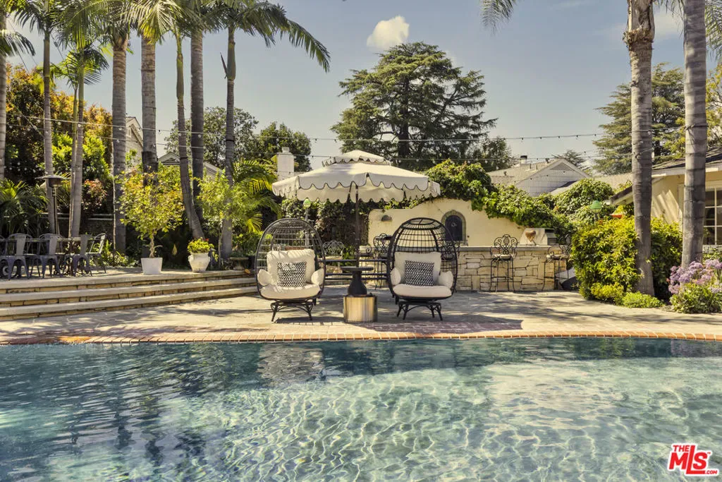 Fully furnished & Turn-key. Charming Beverly Hills Hotel Inspired Home with central courtyard and pool, seamlessly blending indoor-outdoor living. Professionally landscaped by a renowned architect from the Bel Air Hotel, featuring a saltwater heated pool. Handcrafted French stone wall encloses the property, adding elegance and privacy. The house is thoughtfully designed to embrace the expansive pool area, creating a unique and inviting atmosphere. 4 bedrooms 4 Bathrooms including office, multiple indoor and outdoor living areas, Eat in Kitchen, and 2 car garage with 4 car driveway. Border of Studio City and Sherman Oaks.