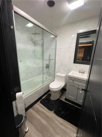 The bathroom has been completely remodeled with quartz slab walls, new tub, new vanity, and new toilets.